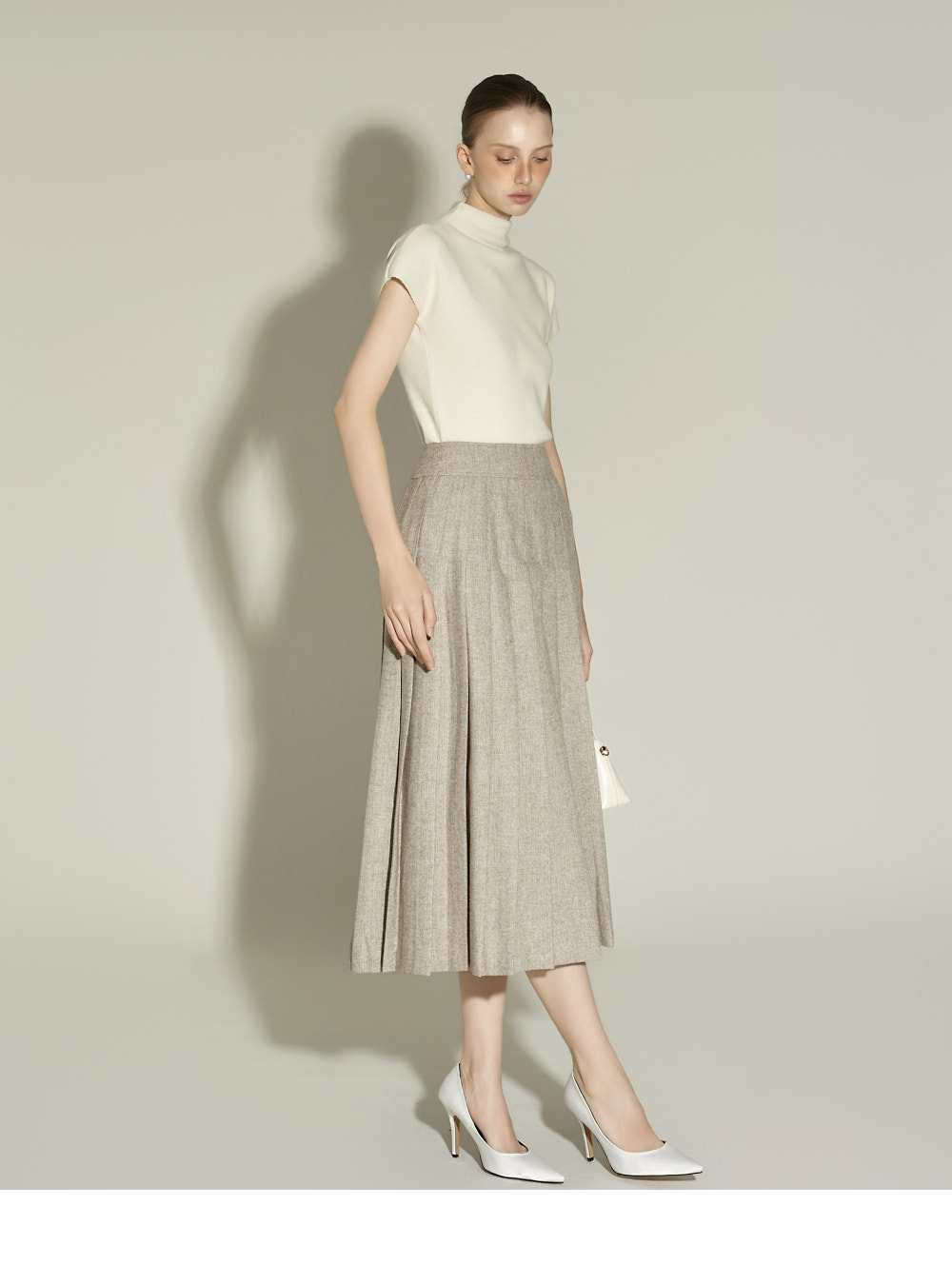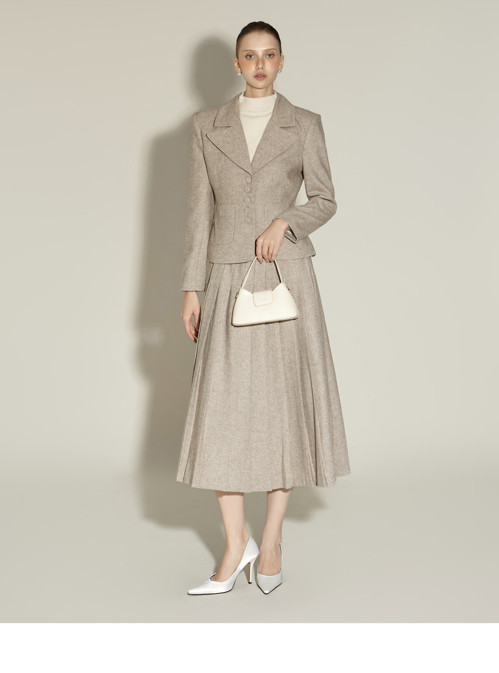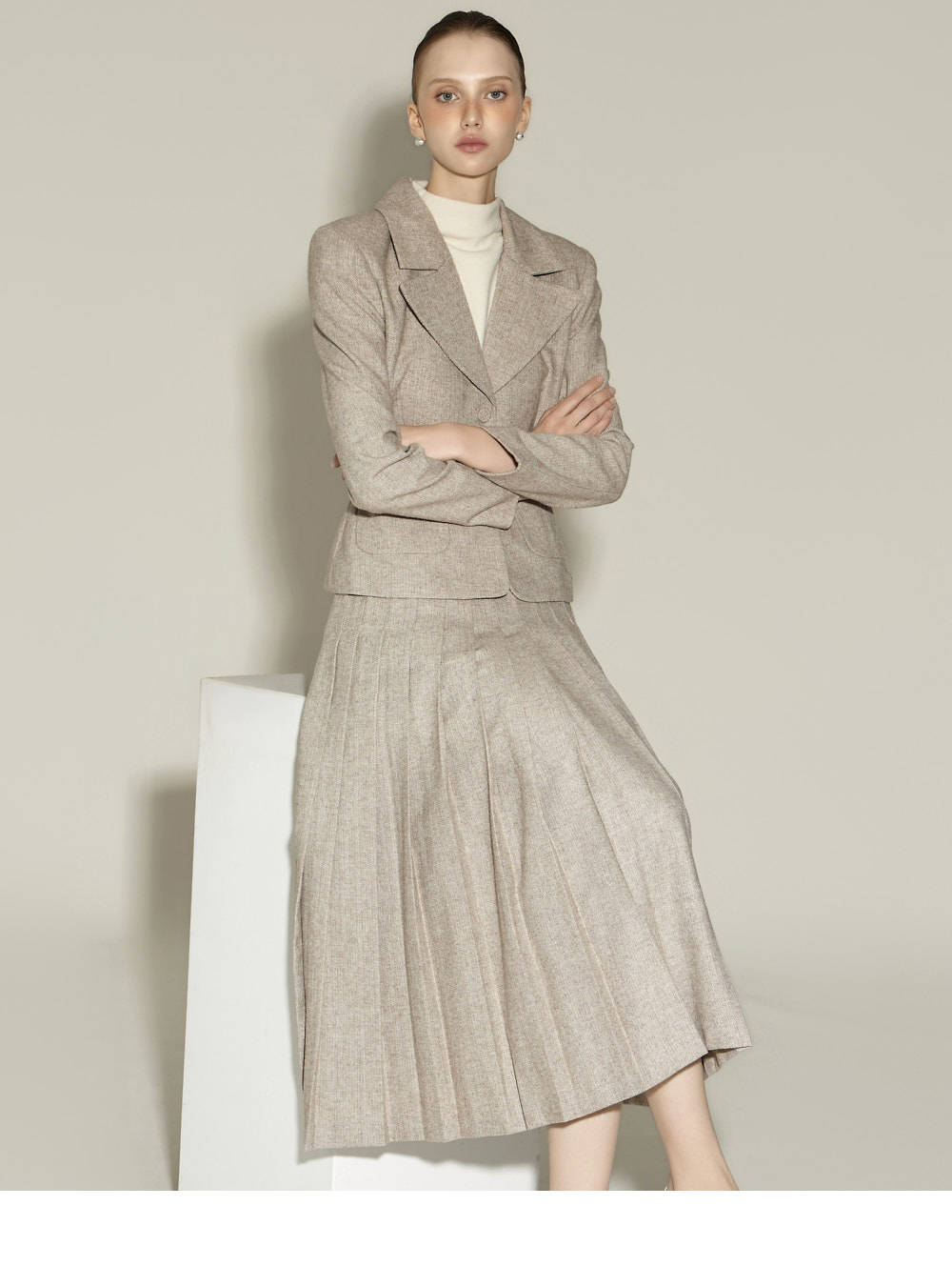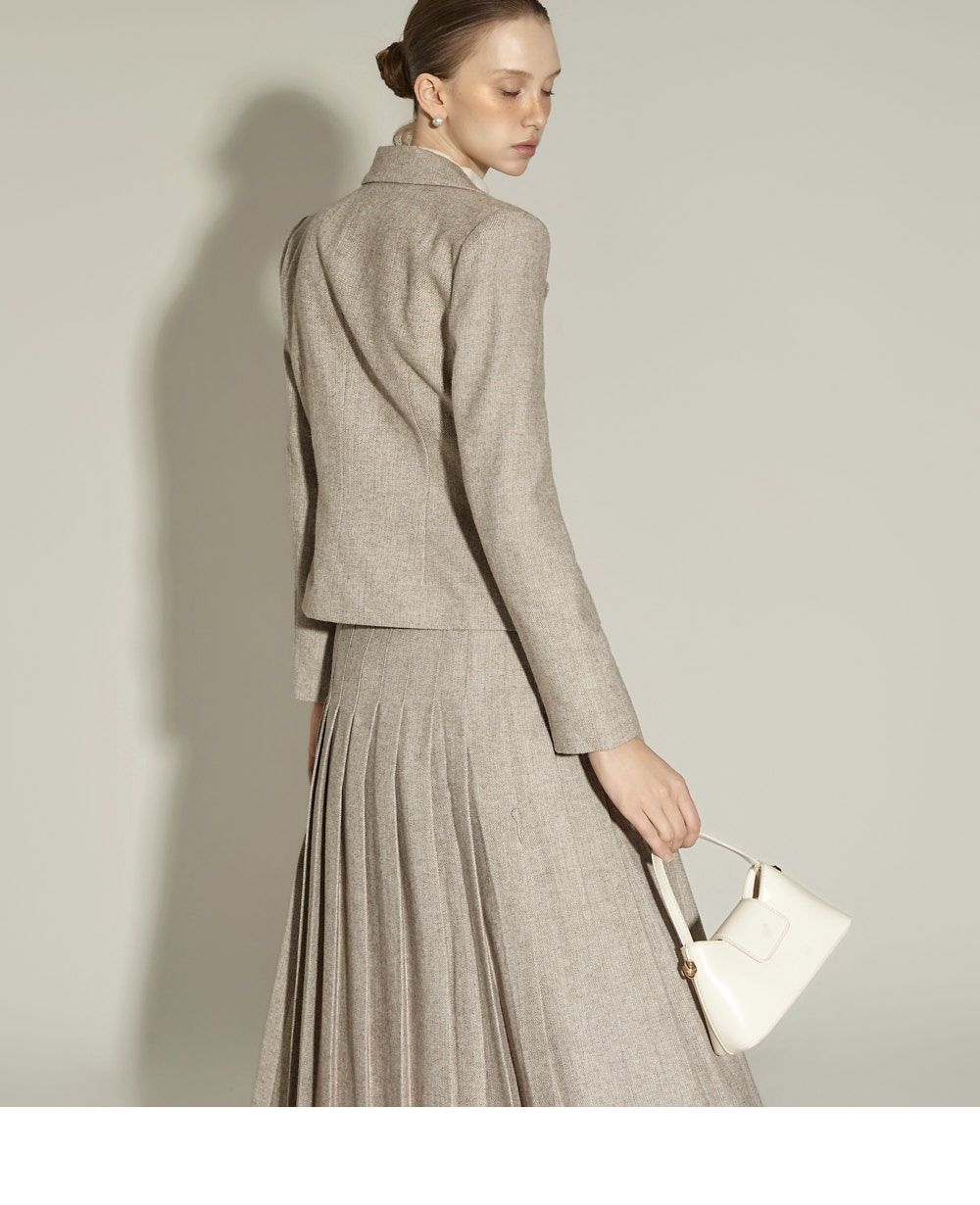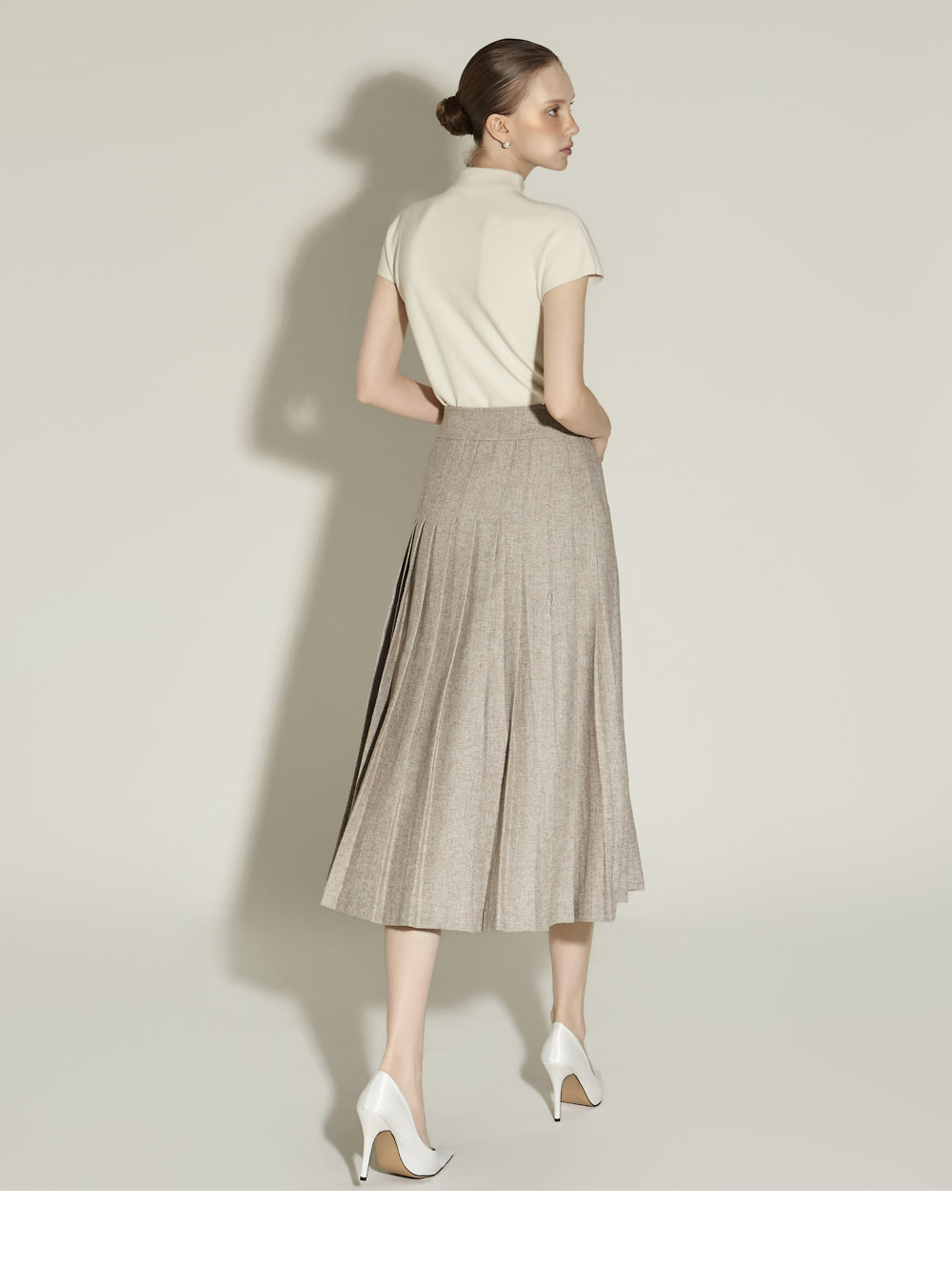 休闲风格的毛呢羊毛半身裙。 由羊毛与聚酯混纺面料制成,带来温暖的穿着感,同时增添经典气质。 长款剪裁与自然散开的 A 字版型,既能修饰身形,又展现女性优雅的氛围,微妙的百褶设计为造型增添不单调的精致感。 与同材质夹克搭配成套穿着,能打造更整洁且有品味的日常造型,单独穿着时也可轻松与毛衣、衬衫等多种上衣搭配。 174CM 模特,穿 S 码,BEIGE 色。