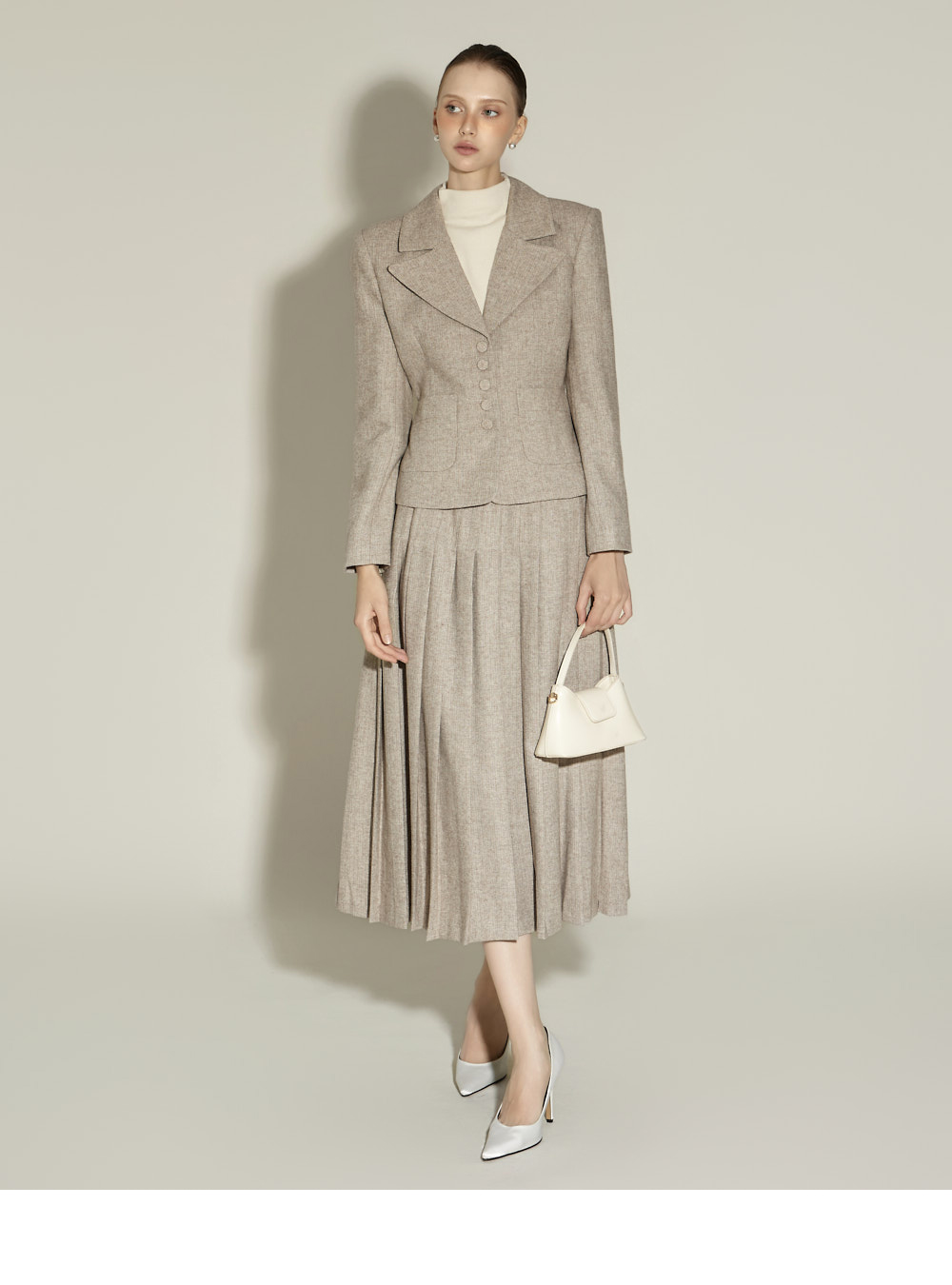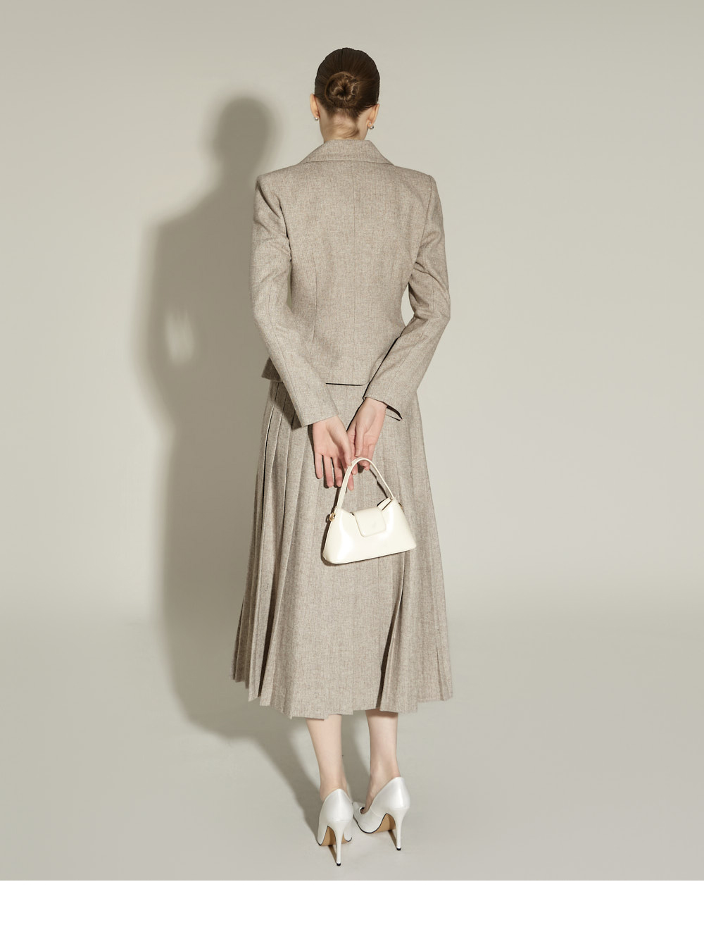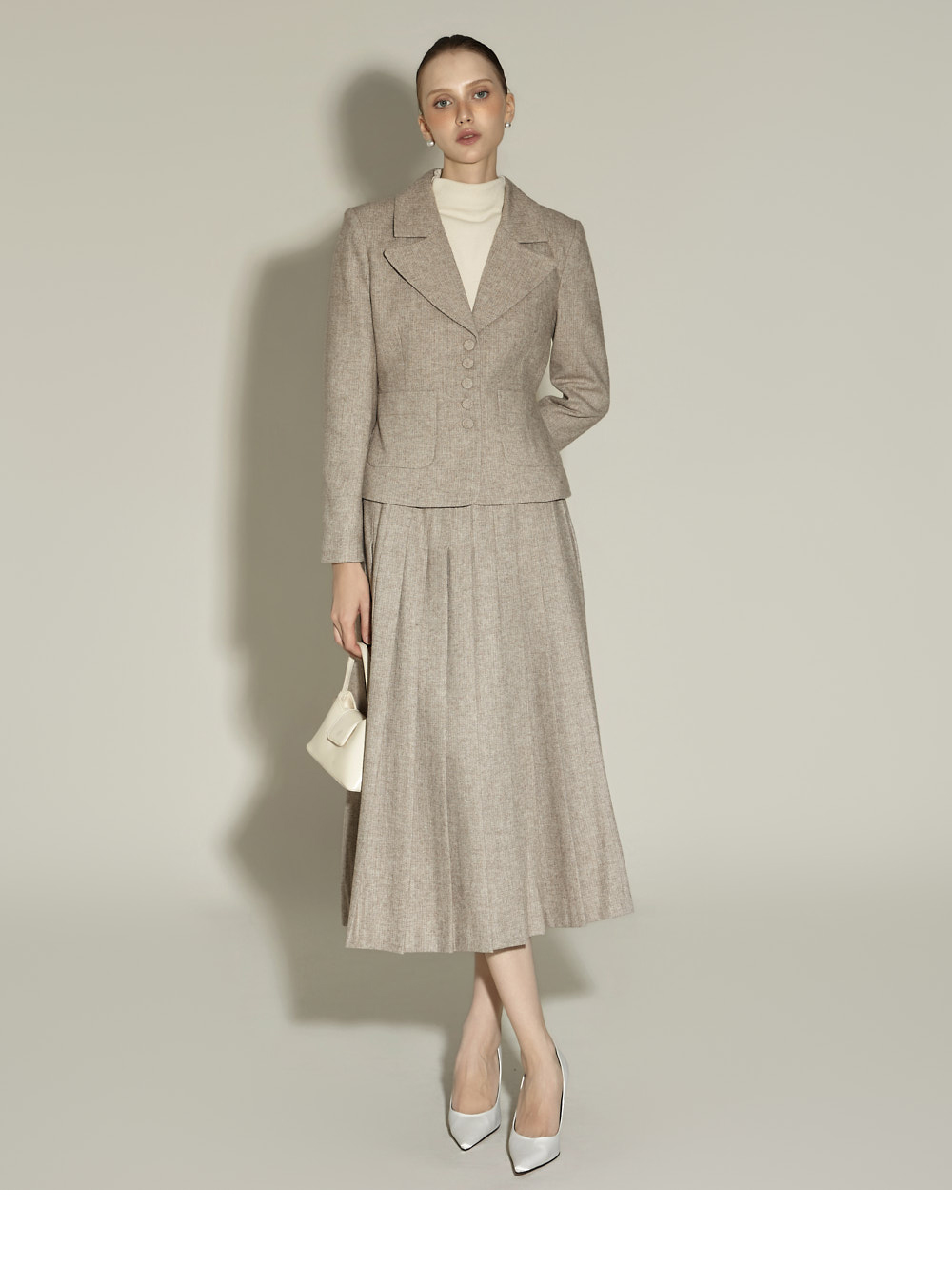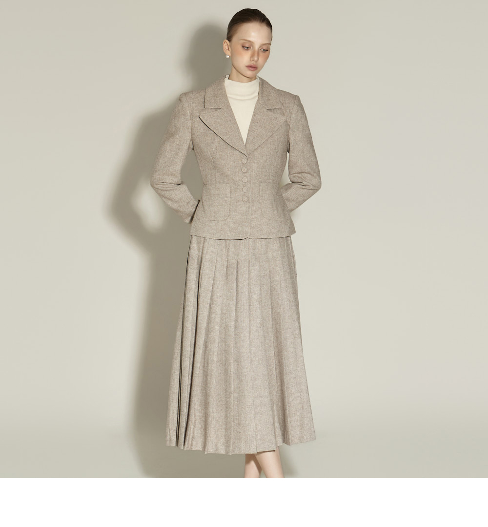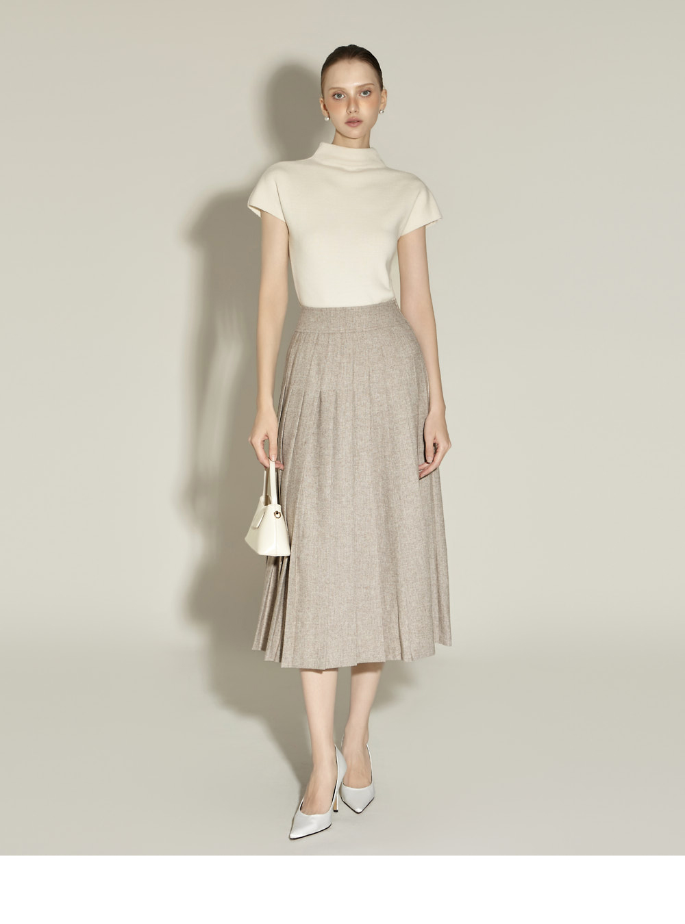 休闲风格的毛呢羊毛半身裙。 由羊毛与聚酯混纺面料制成,带来温暖的穿着感,同时增添经典气质。 长款剪裁与自然散开的 A 字版型,既能修饰身形,又展现女性优雅的氛围,微妙的百褶设计为造型增添不单调的精致感。 与同材质夹克搭配成套穿着,能打造更整洁且有品味的日常造型,单独穿着时也可轻松与毛衣、衬衫等多种上衣搭配。 174CM 模特,穿 S 码,BEIGE 色。