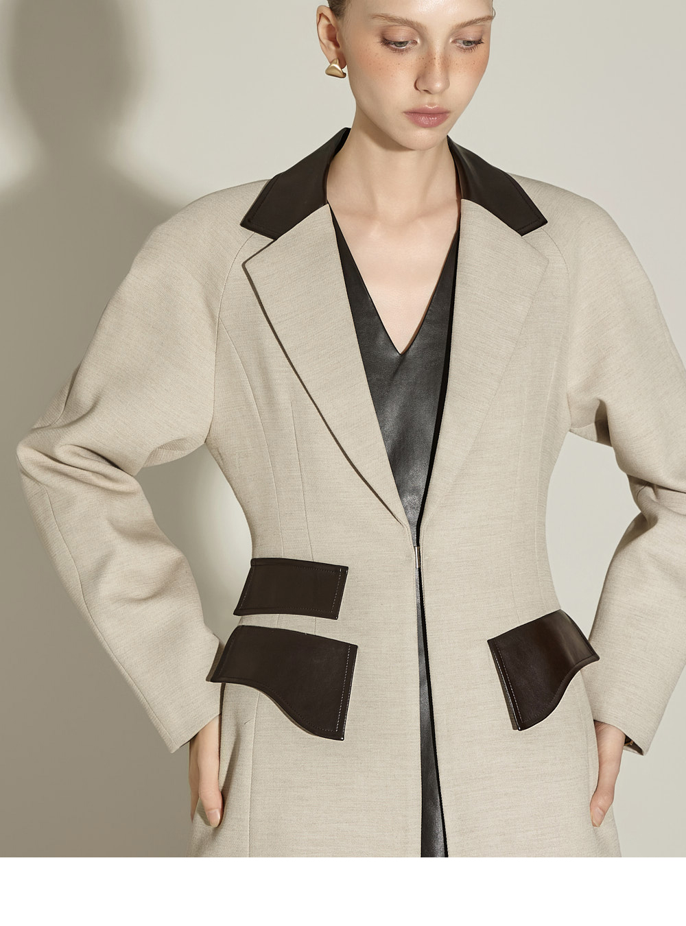 这是一款散发时尚气息的套袖皮革夹克。采用聚酯纤维、粘纤、聚氨酯和羊毛混纺面料制作,带皮革装饰的部分使用聚氨酯与粘纤混纺面料制作。尺寸分为S和M两码,可根据个人喜好选择合适尺码。稳定落肩的版型配合肩垫设计,塑造出结构感十足的线条,前襟搭扣设计及双口袋增加实用性。口袋和领口的皮革细节提升高级感,既适合日常穿搭,也适合上班或聚会造型,可轻松搭配多种风格。模特身高173CM,穿S码,米色。