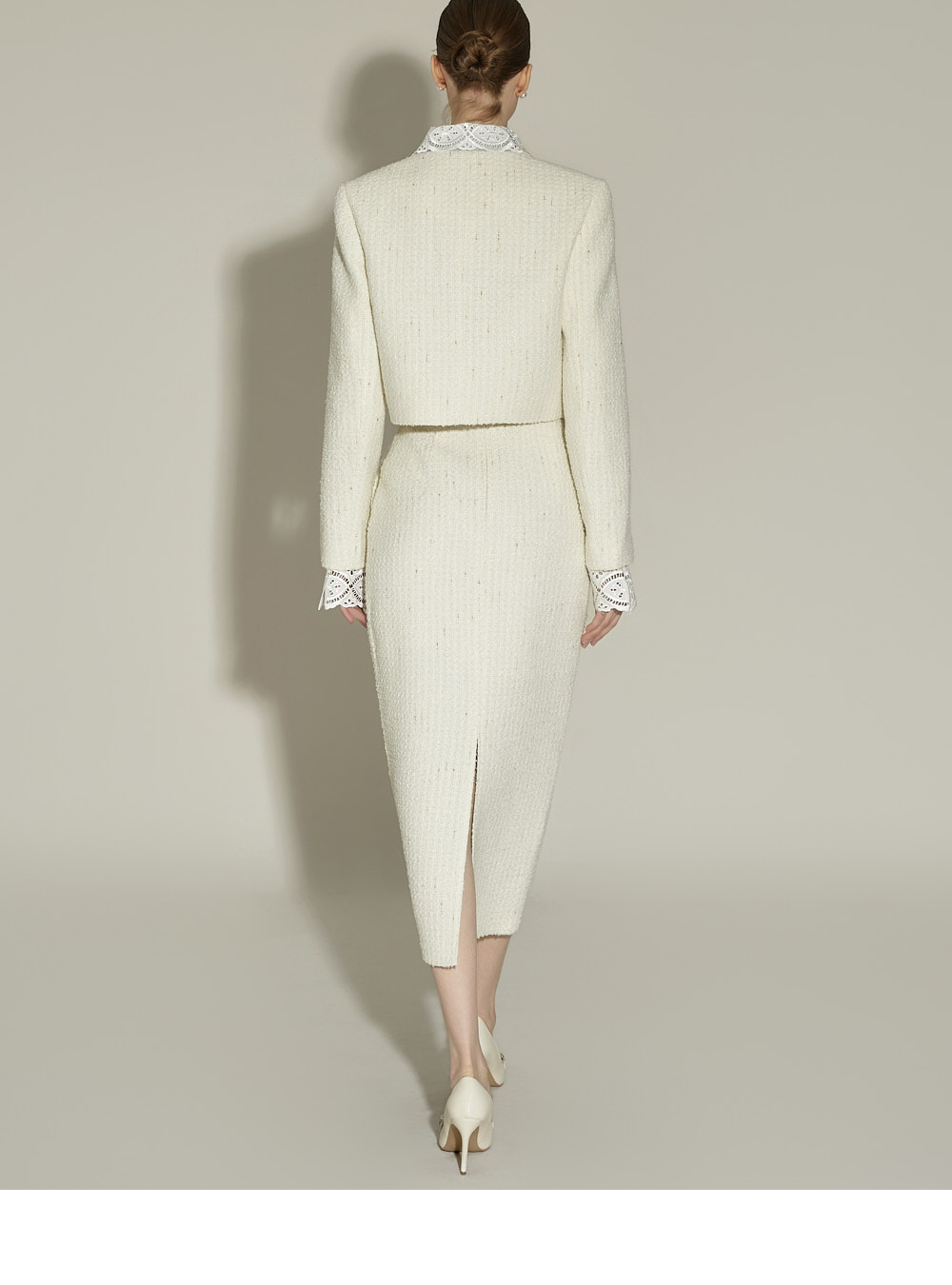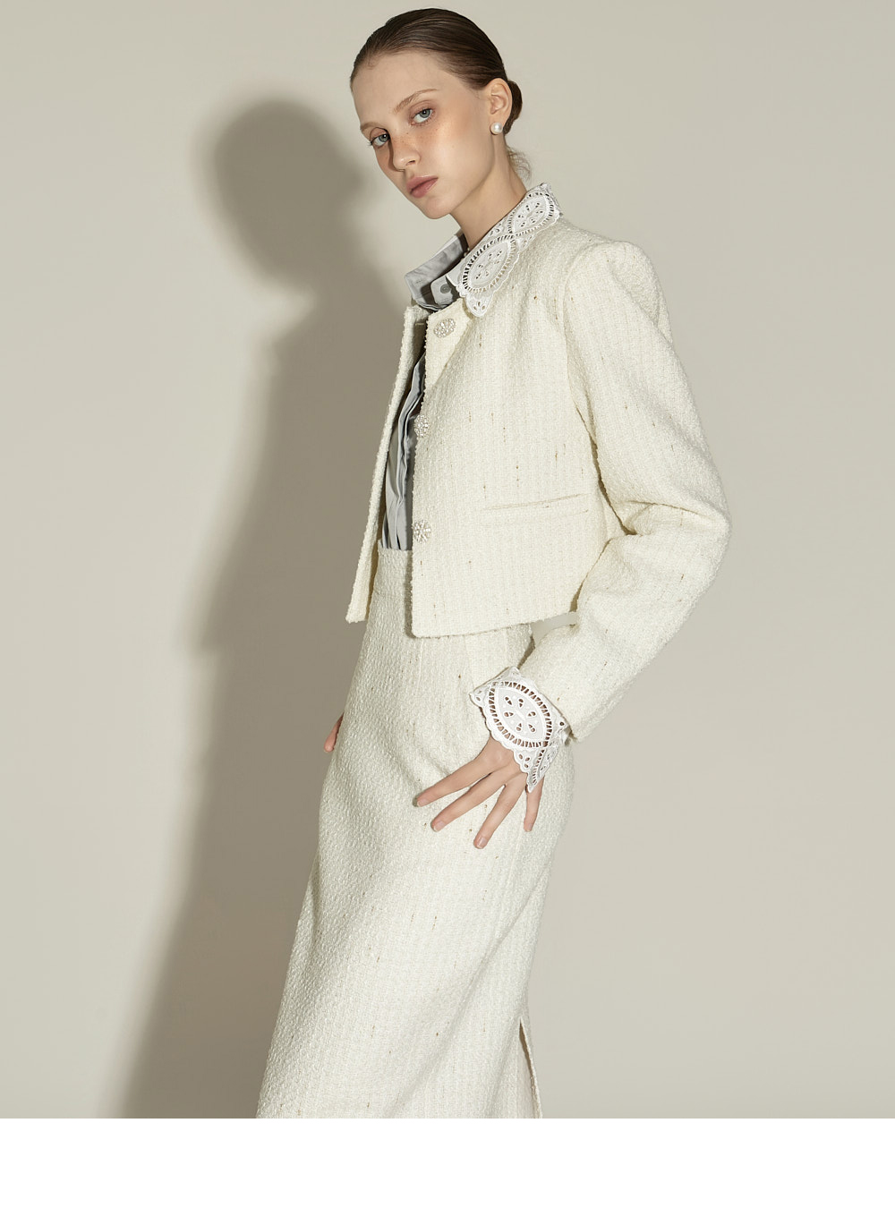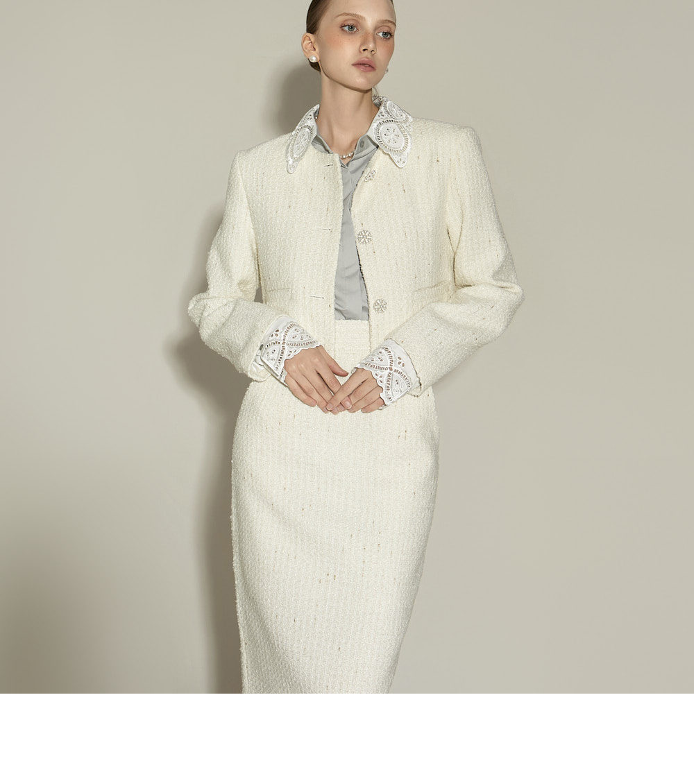 174CM 模特外套 ONE 尺码 / 半身裙 S 尺码,象牙色。