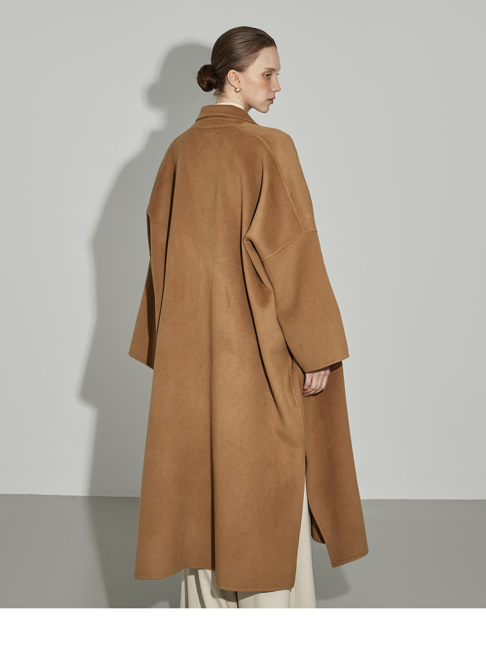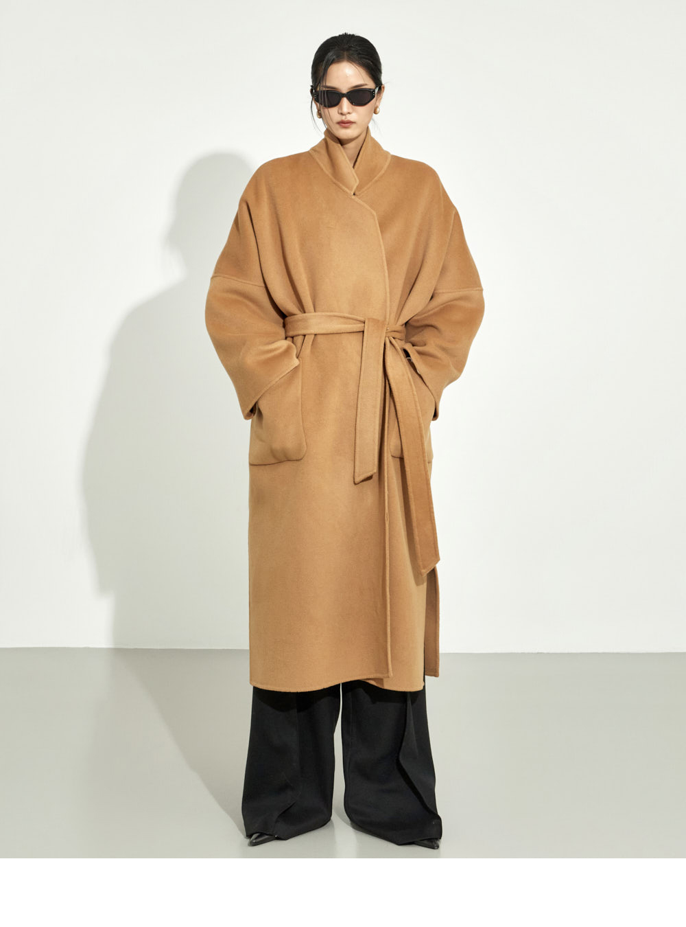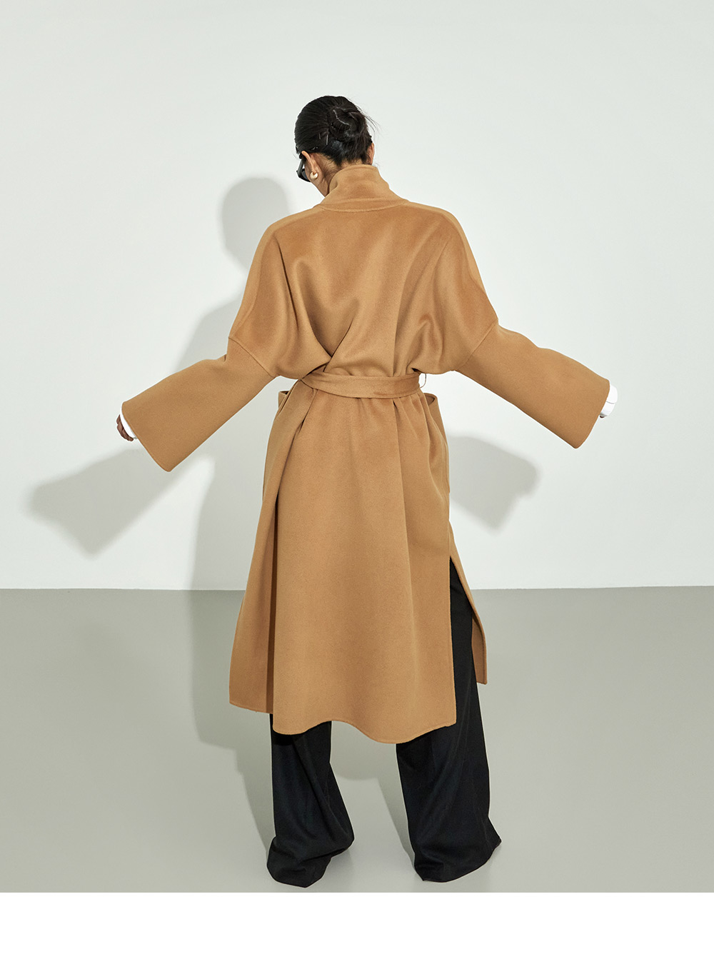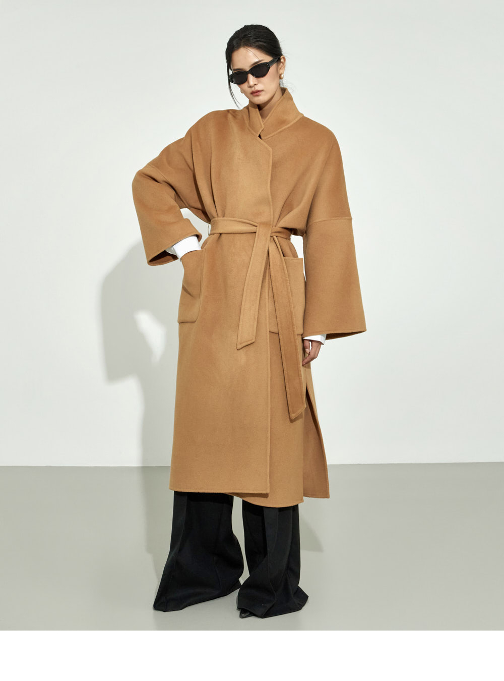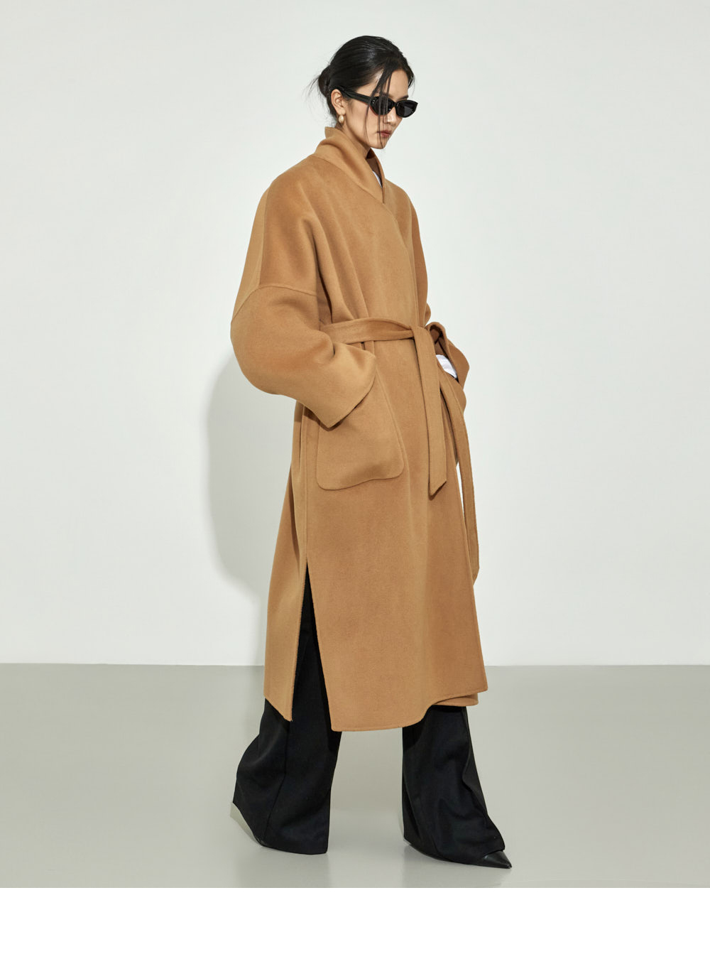 模特身高174CM,穿着ONE码,颜色为CAMEL。