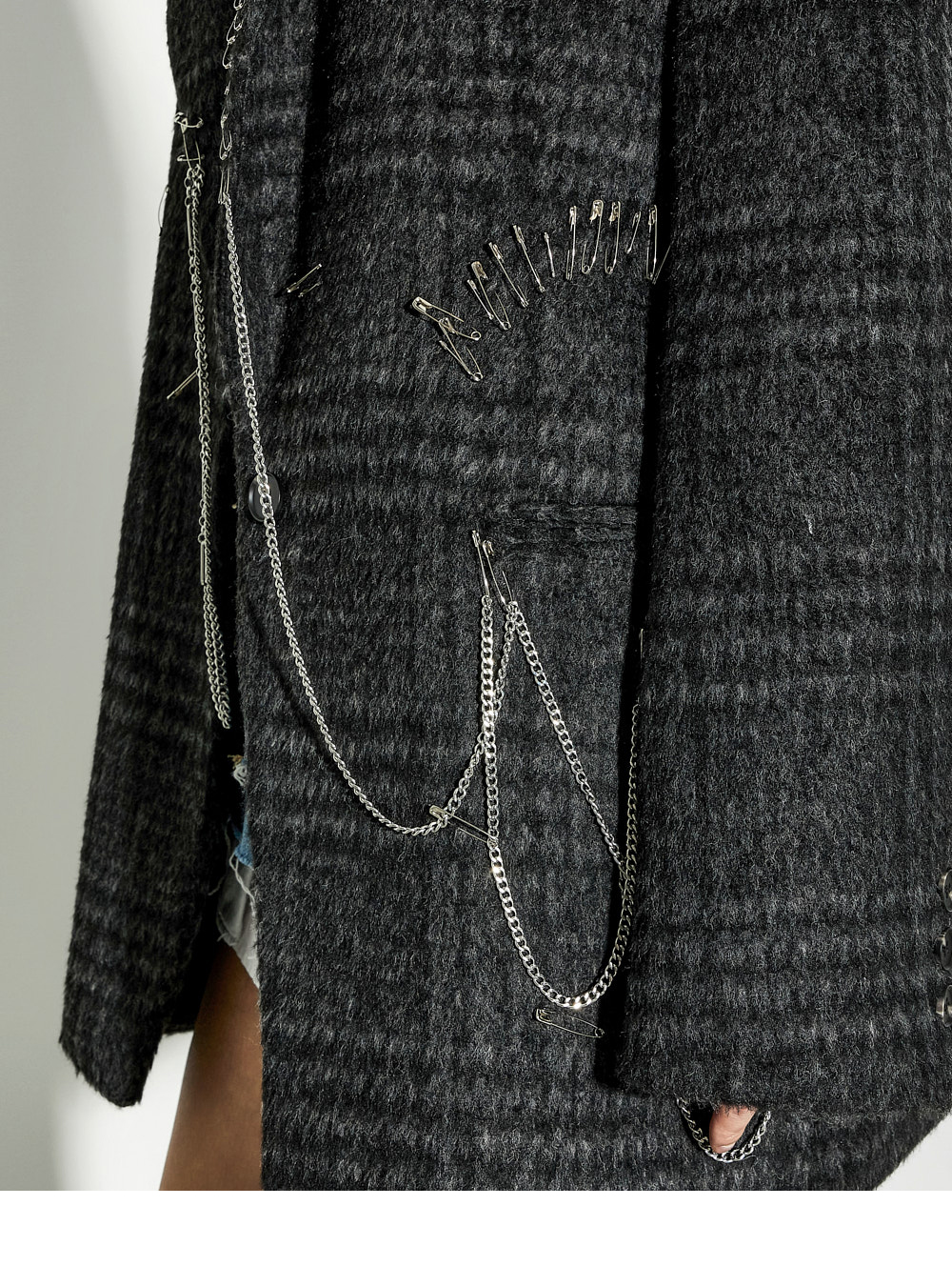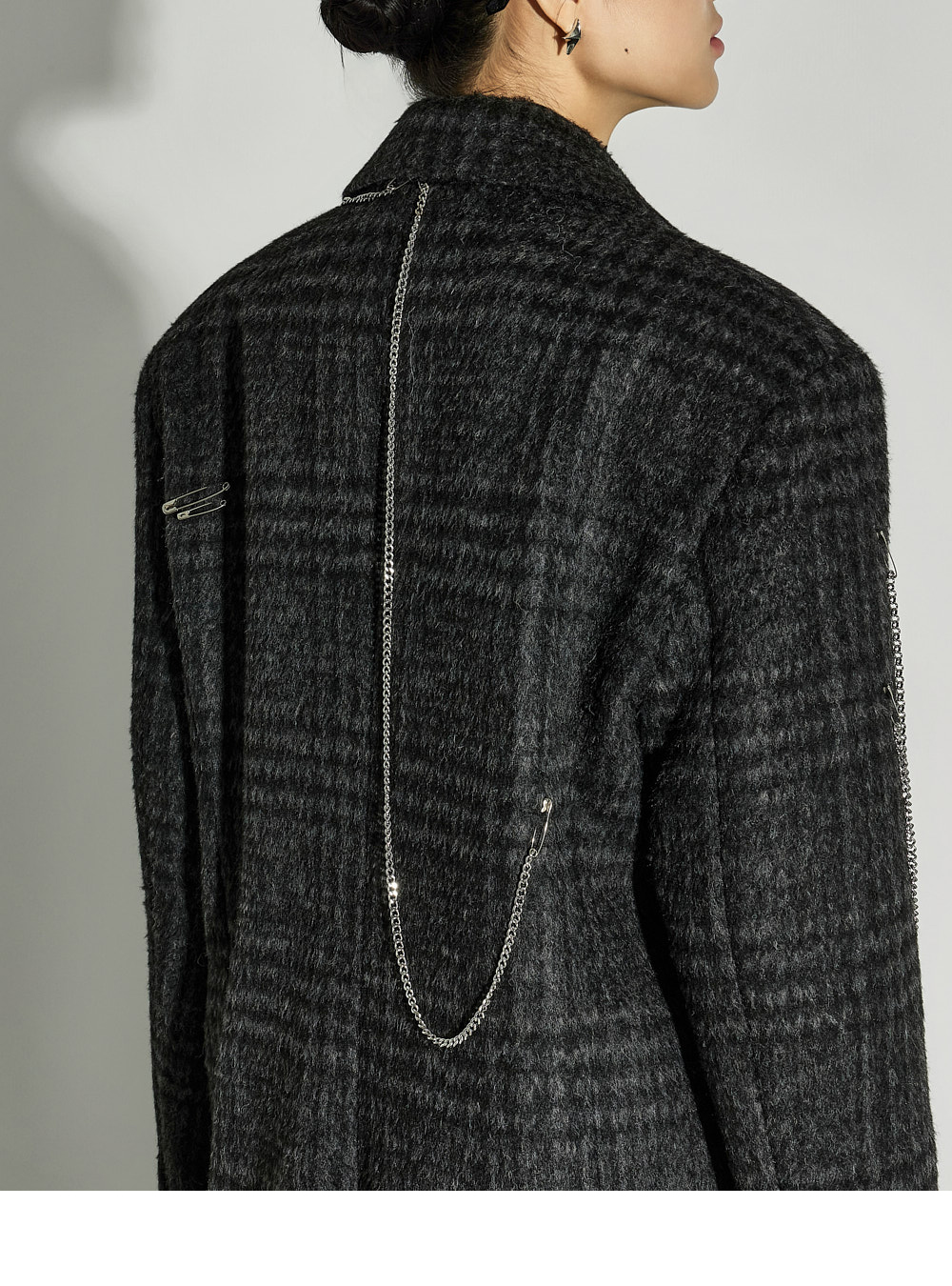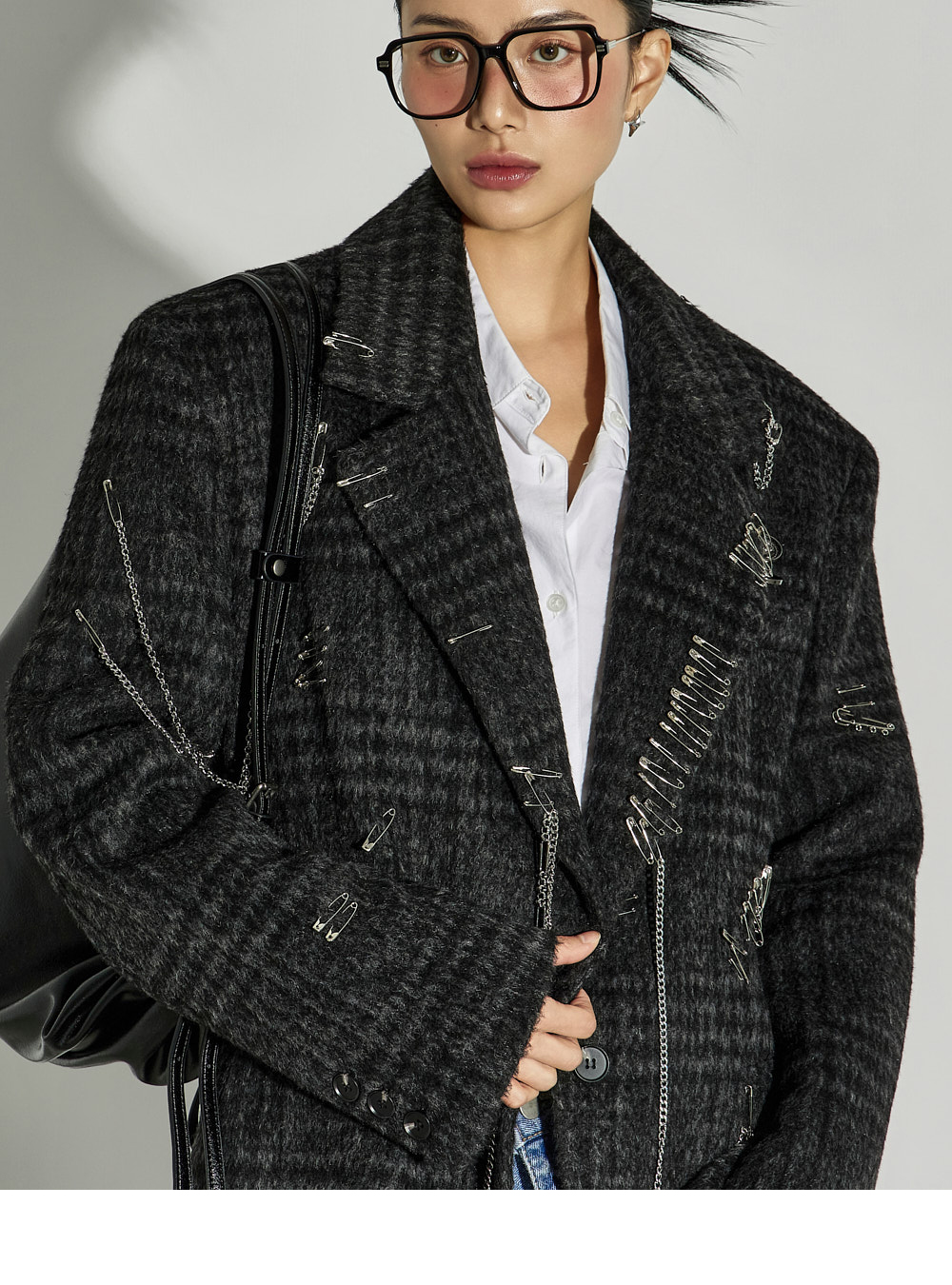 多款尺寸的夹子胸针装饰作为亮点,强调独特而有感的风格,低调格纹图案增添精致氛围。