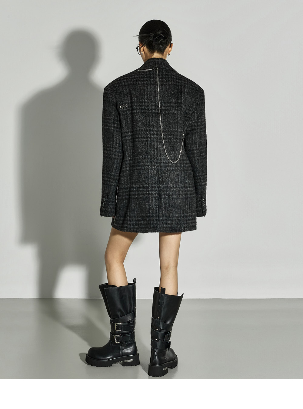 前襟纽扣开合、双侧口袋及后开衩细节提升实用性与整体完成度,宽松廓形与肩垫结合,打造结构感且时尚的线条。
