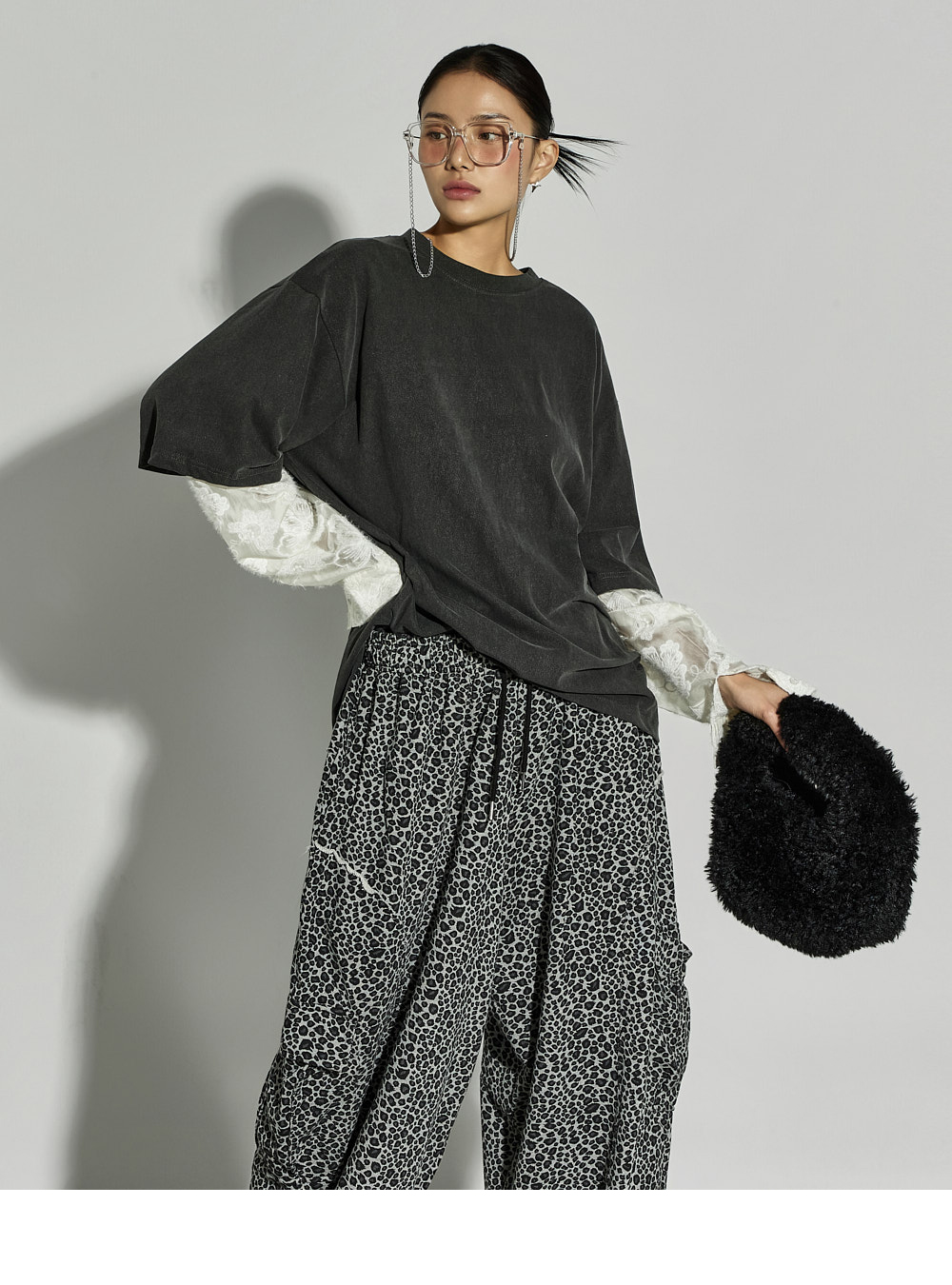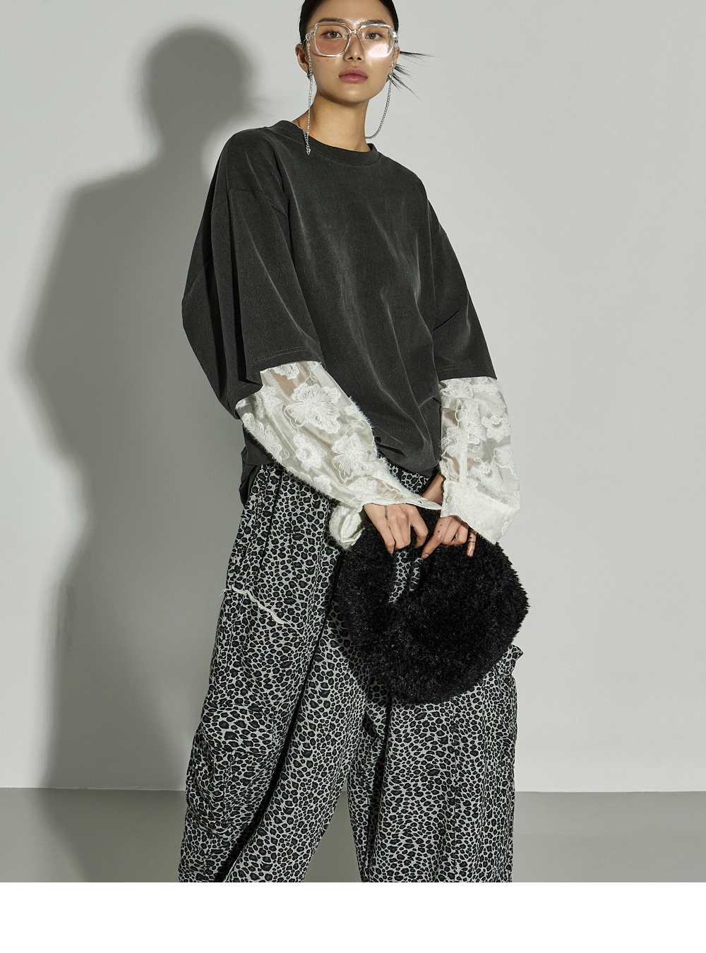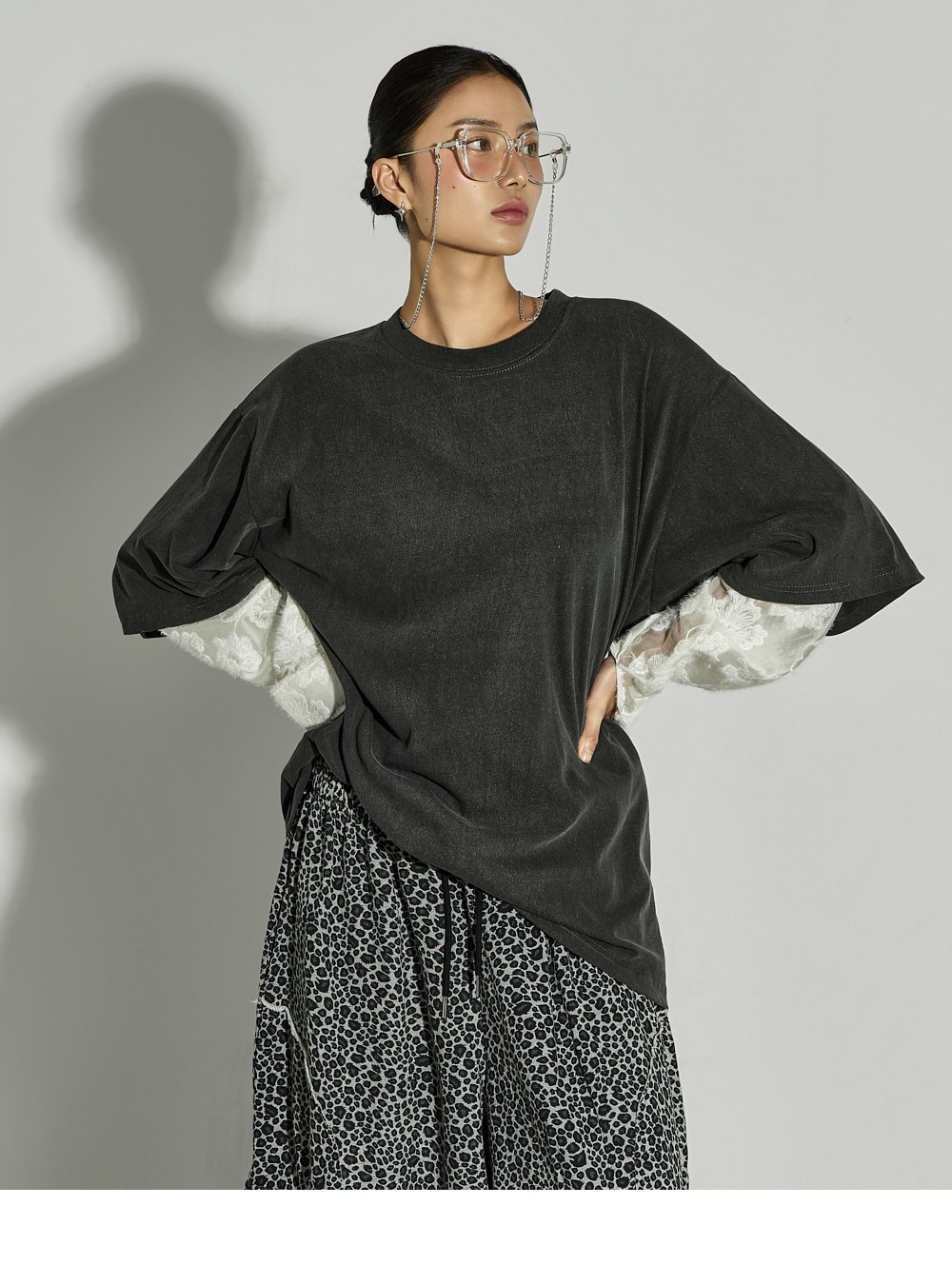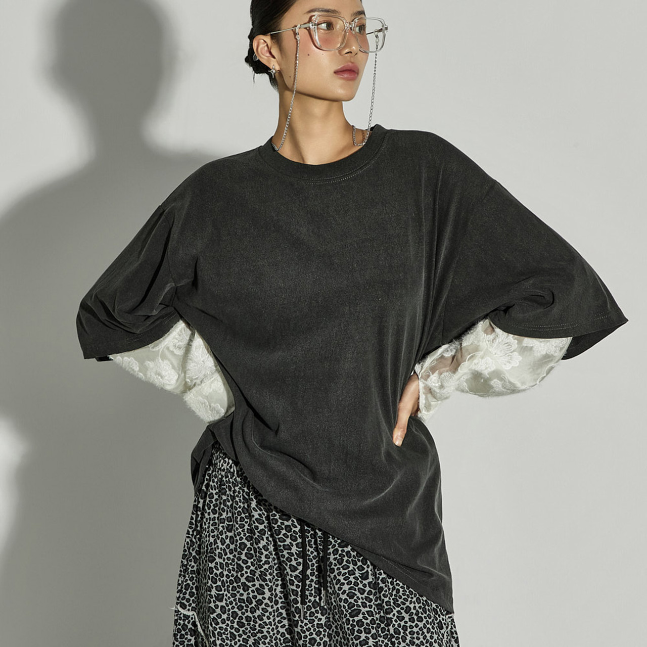 独特风格的上衣。 采用棉质面料制作,柔软轻盈,穿着舒适。 ONE码设计,宽松的oversize剪裁自然遮盖体型,穿着轻松自在。 圆领设计带来干净利落的印象,袖口拼色蕾丝细节增添独特又女性化的亮点。 局部轻微透视,营造精致氛围,适度弹性让活动更舒适,单穿亦能成为造型焦点。 可与多种外套叠穿,轻松打造有感的搭配。 171CM模特,穿着ONE码,炭灰+象牙色。