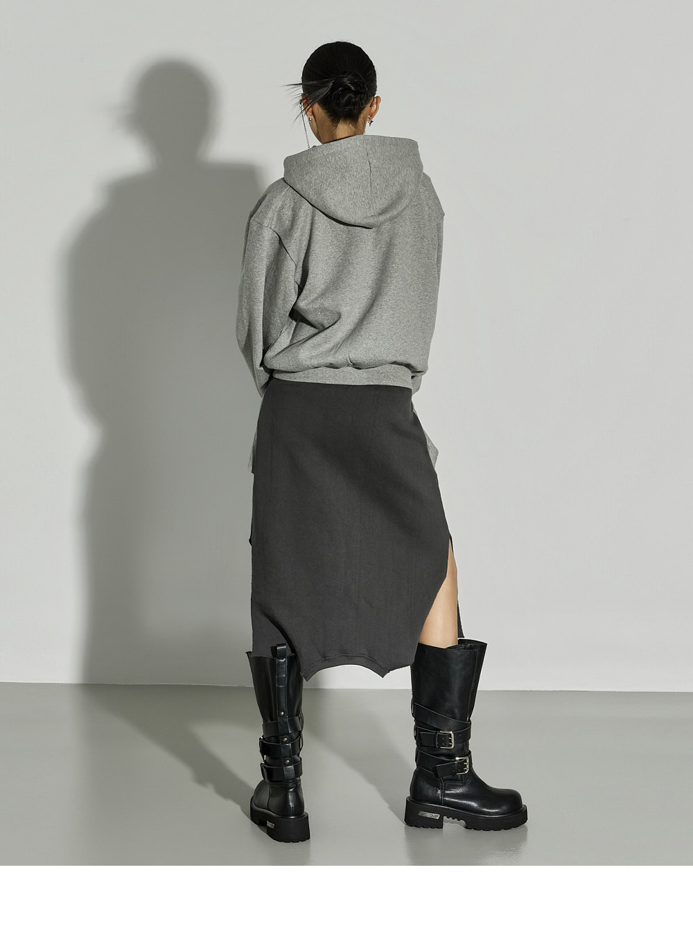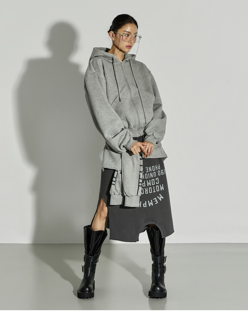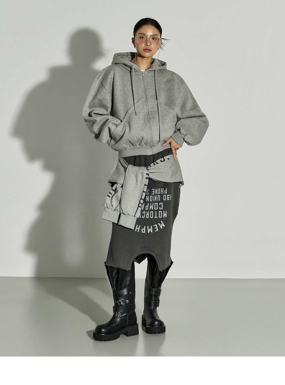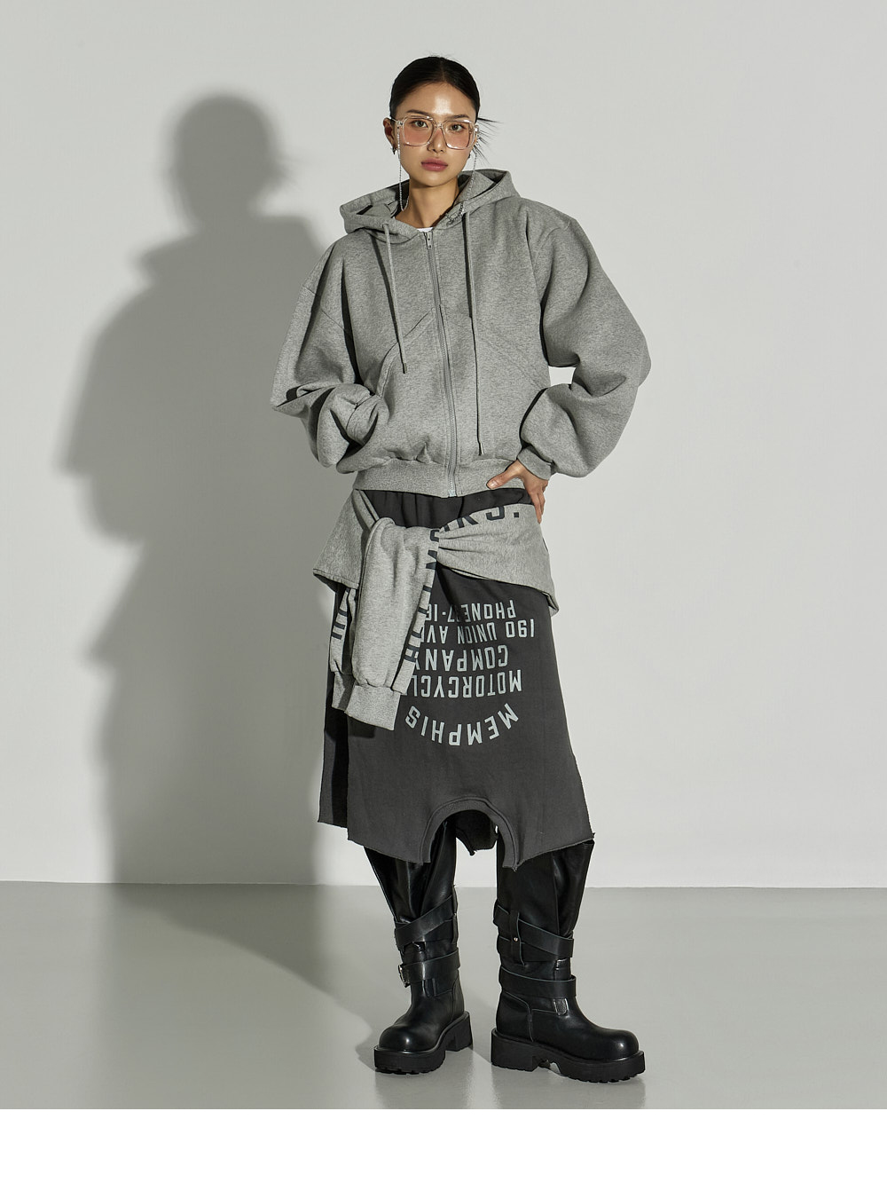 这是一款休闲风格的绑带叠层半裙。 采用棉与聚酯纤维混纺面料制作,穿着舒适且稳固,内侧带绒里增强保暖性,适合冬季穿搭,实用性高。 腰部全松紧设计,穿着轻松自在,下摆自然裁切,并搭配不对称裙摆设计,呈现独特轮廓。 侧开衩提升活动性,绑带细节如同双袖设计,可多样化搭配,营造叠穿感般的时尚亮点。 与宽松针织衫、连帽衫或oversize外套搭配,即可打造时尚休闲造型。 模特身高171CM,穿着ONE尺寸,颜色为CHARCOAL。