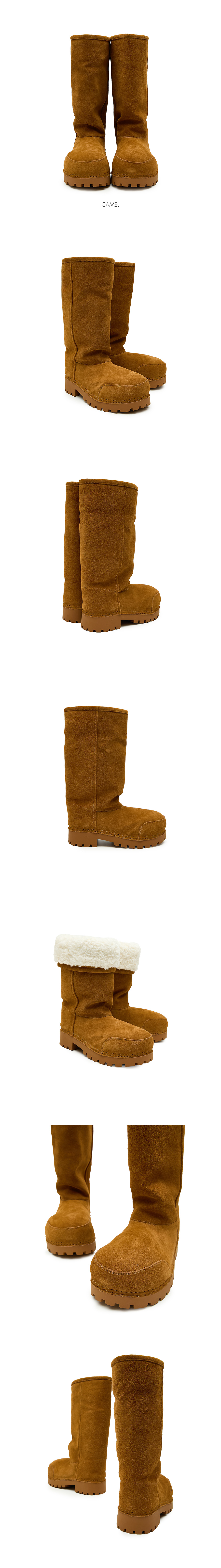 温暖氛围的绒面革雪地靴。 采用柔软的绒面革材质制作,可感受到温暖而高贵的质感,内里全覆盖毛绒衬里,即使在寒冬也能提供出色的保暖性。 适中的中筒高度能稳妥地包裹小腿,如果翻折穿着,毛绒衬里会露出,营造更加温暖舒适的氛围。 厚实的外底带来稳定的穿着感,坚固的鞋底纹路可防止滑倒。 自然的色调与各种冬季穿搭相得益彰,从休闲日常造型到温暖居家风格都能广泛搭配的单品。