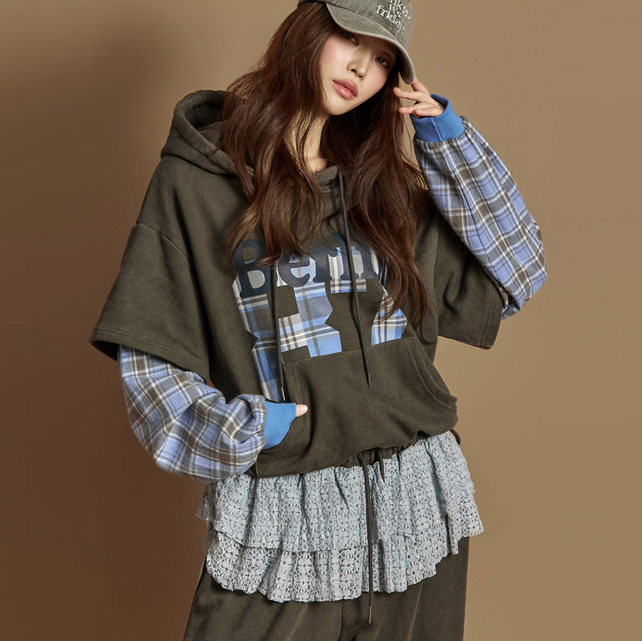 체크 배색 후드 디테일로 레이어드된 듯한 포인트를 줍니다.