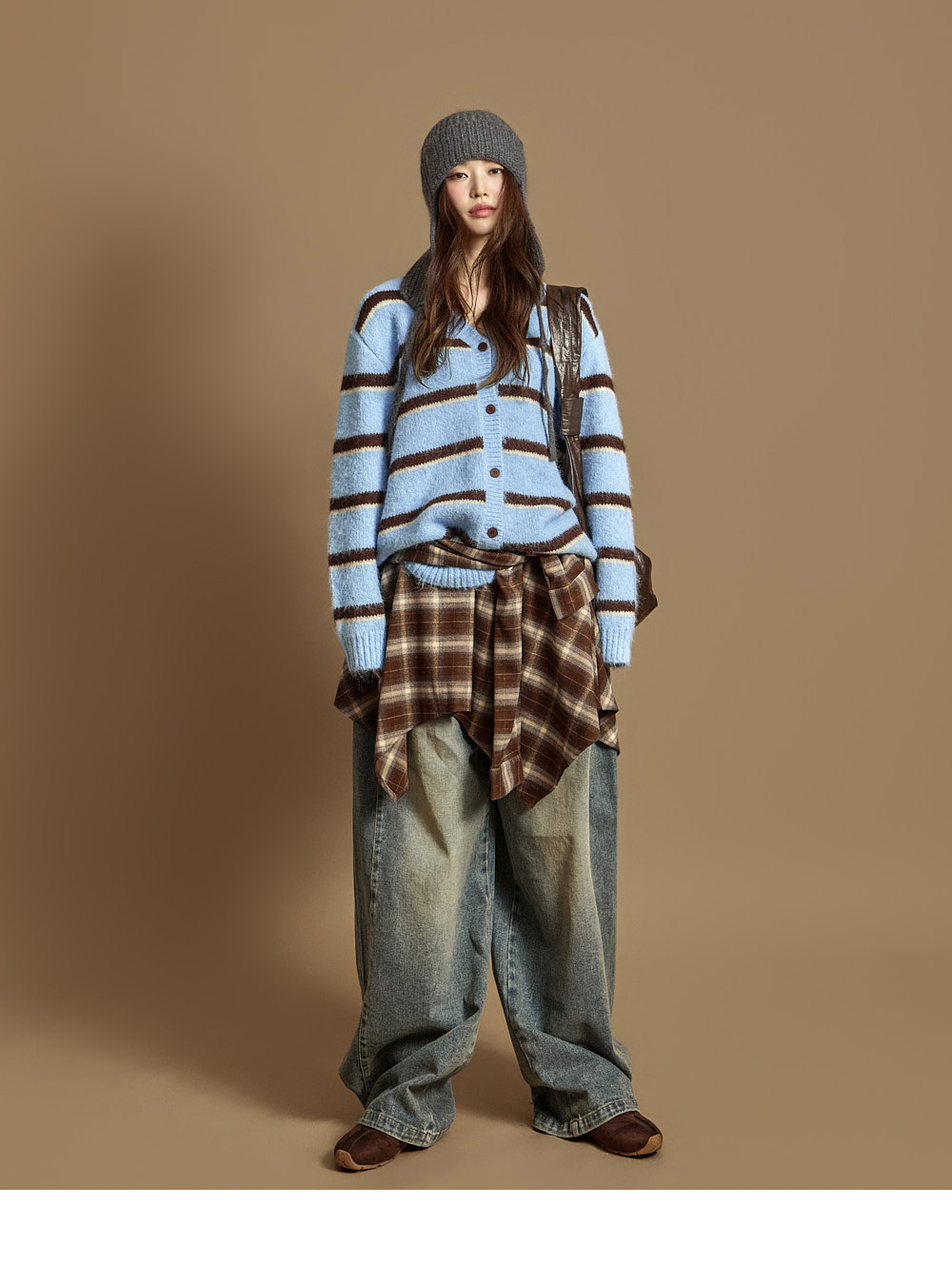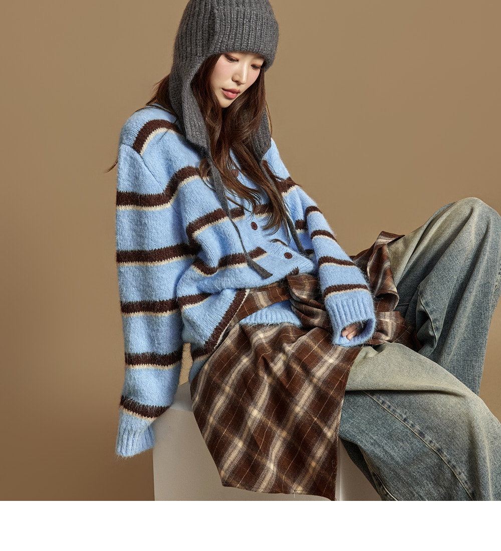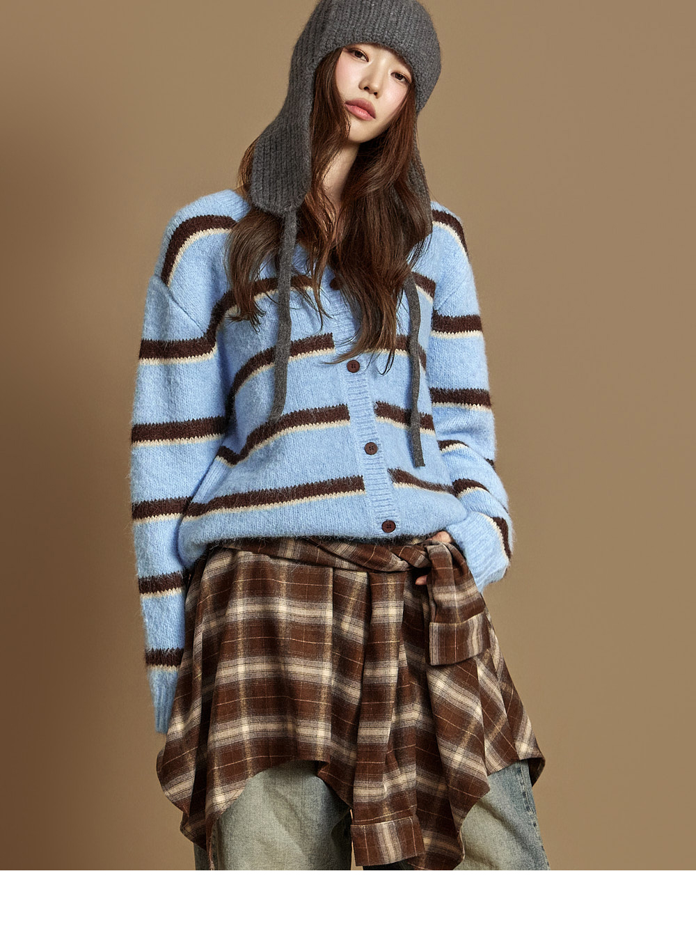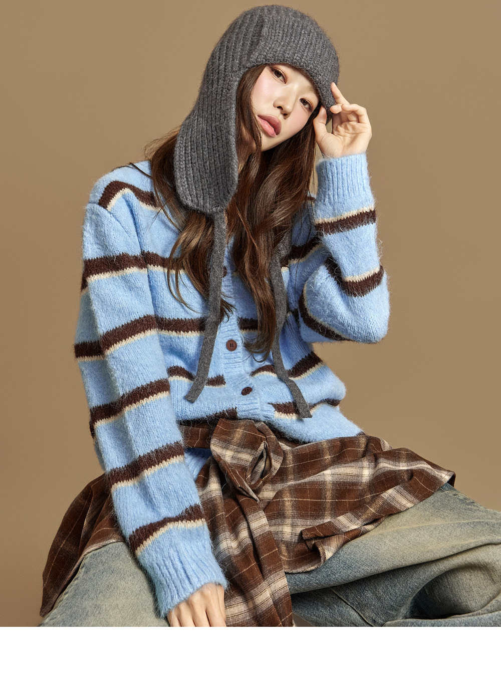 充满休闲气息的条纹羊毛开衫。 采用再生纤维、聚酯纤维、尼龙与羊毛混纺材质制成,轻盈柔软,带来温暖舒适的穿着感。 宽松版型自然垂坠,配以条纹图案,展现出休闲又时尚的氛围。 V领设计便于与内搭叠穿,前襟纽扣开合方便穿脱,材质具备良好弹性,活动更加自如。 无论搭配牛仔裤、半身裙等多种下装,都能轻松打造出随性又有格调的造型。 171CM 模特穿着 ONE 码,颜色为 SKY BLUE。