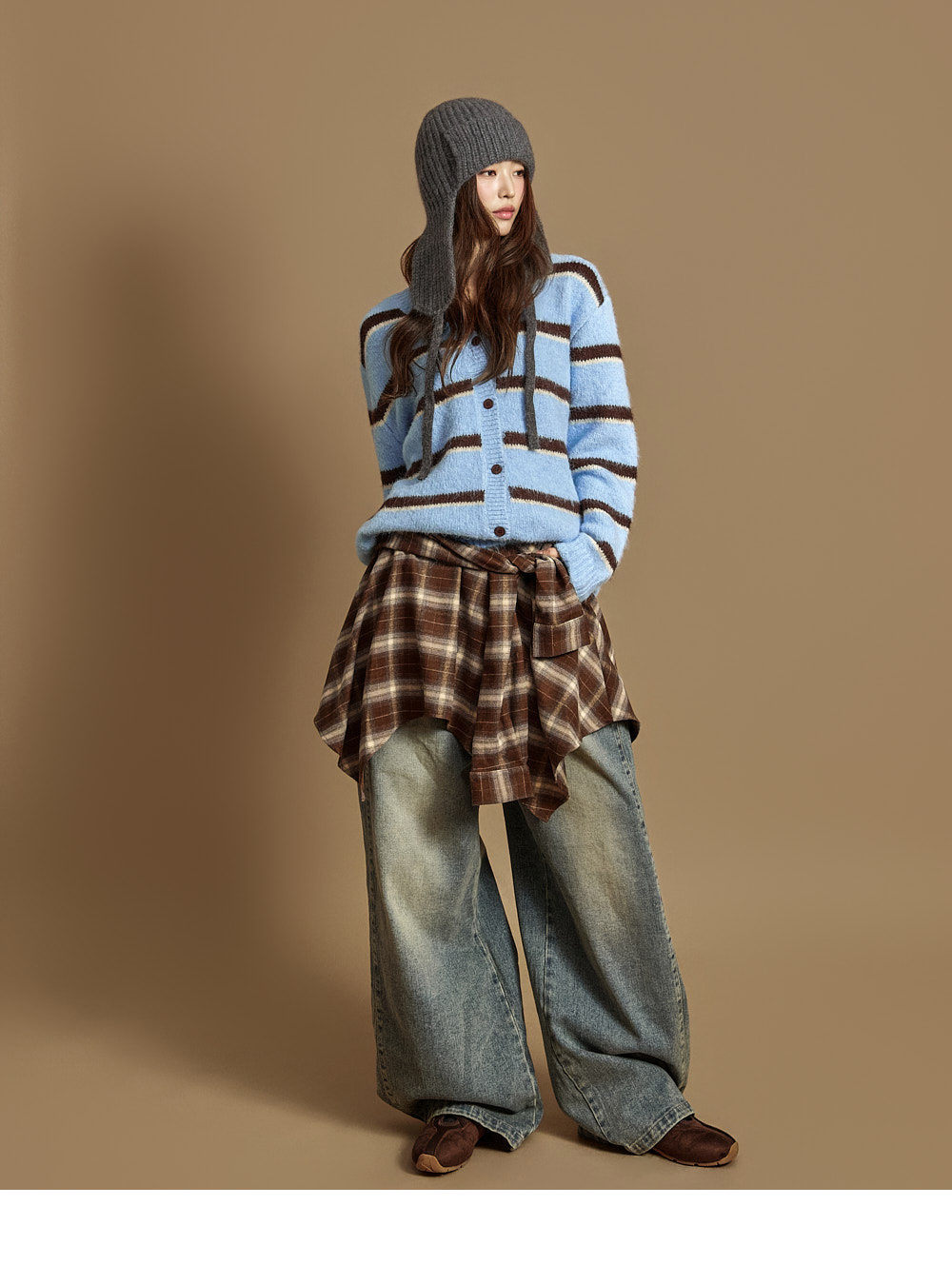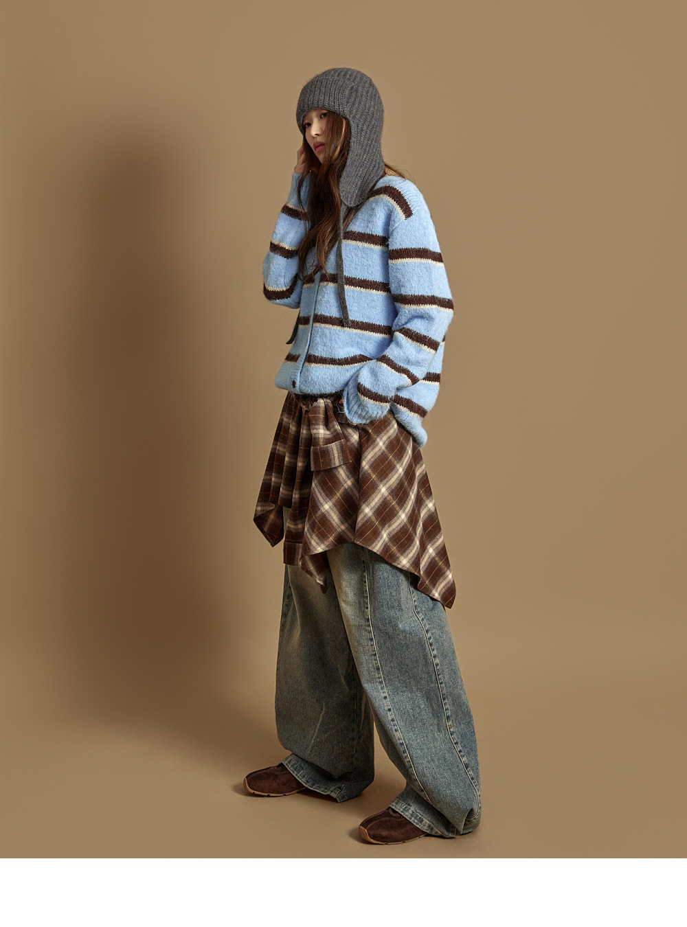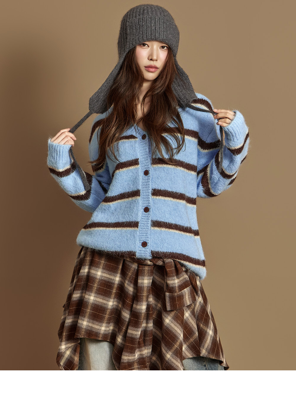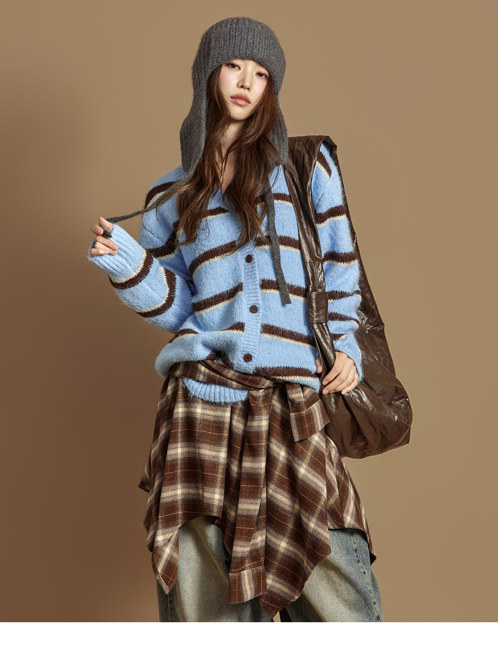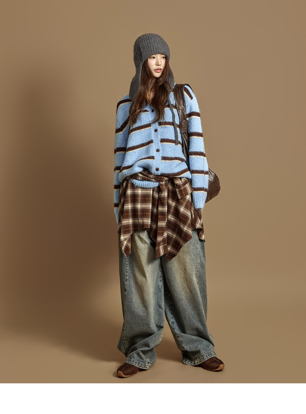 充满休闲气息的条纹羊毛开衫。 采用再生纤维、聚酯纤维、尼龙与羊毛混纺材质制成,轻盈柔软,带来温暖舒适的穿着感。 宽松版型自然垂坠,配以条纹图案,展现出休闲又时尚的氛围。 V领设计便于与内搭叠穿,前襟纽扣开合方便穿脱,材质具备良好弹性,活动更加自如。 无论搭配牛仔裤、半身裙等多种下装,都能轻松打造出随性又有格调的造型。 171CM 模特穿着 ONE 码,颜色为 SKY BLUE。