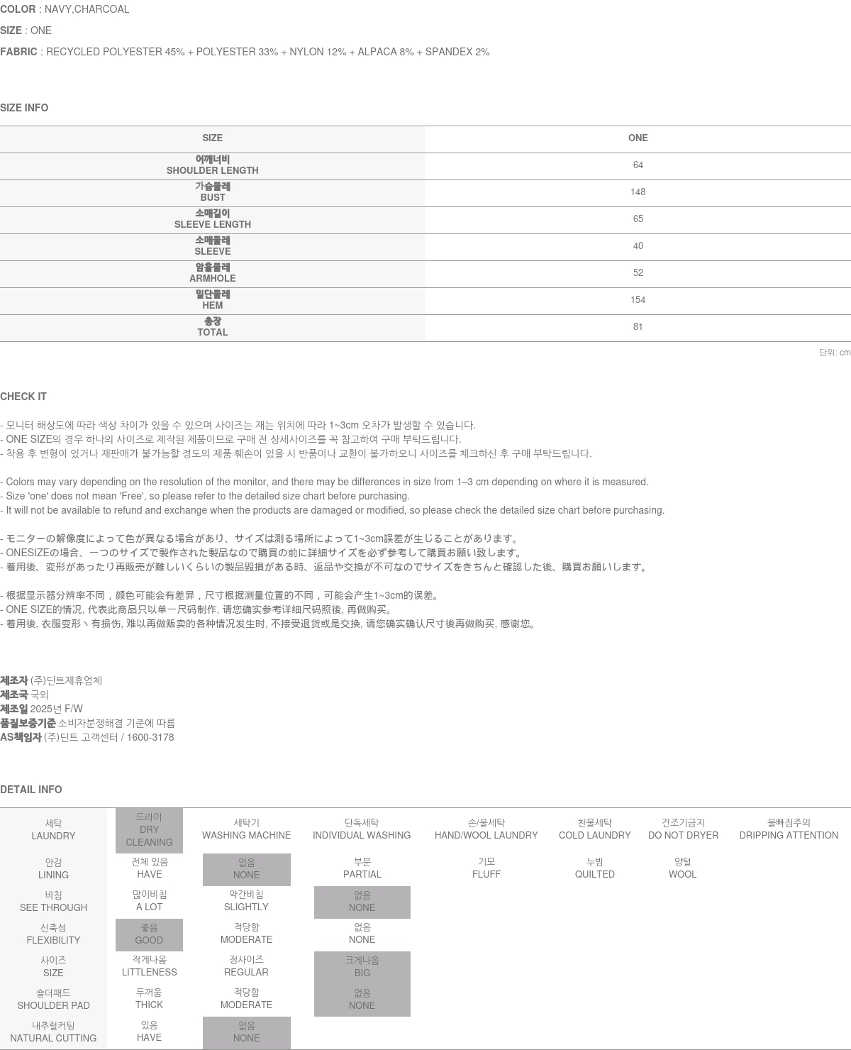 換貨 與 退貨 收到商品後, 7日內能在我的頁面申請交換或退貨, 申請後請將商品寄回DINT. 申請後, 請填寫包裹裡一同寄去的撤回申請書, 再將包裹包裝成一開始您收到時的狀態(包裝袋、衣架、贈品皆要一起寄送回來)發送至DINT即可. 因爲顧客變心所申請的換貨與退貨, 運費將由顧客負擔;誤送或是商品瑕疵的部分, 將由DINT負擔運費. 退貨住所爲:首爾市 衿川區 加山洞 459-8號 大韓通運 7樓 DINT股份有限公司 品質保證標準說明:符合電子商務等有關消費者保護法律規定的消費者可申請交換或是退貨.