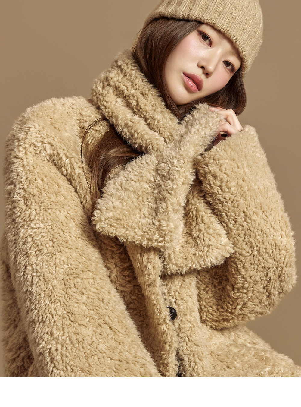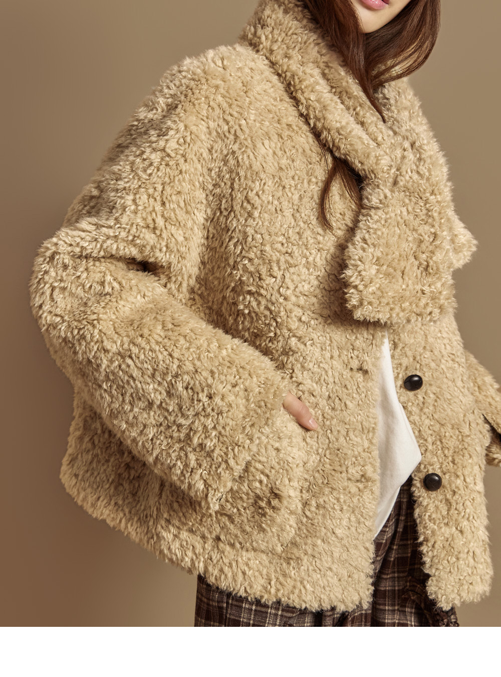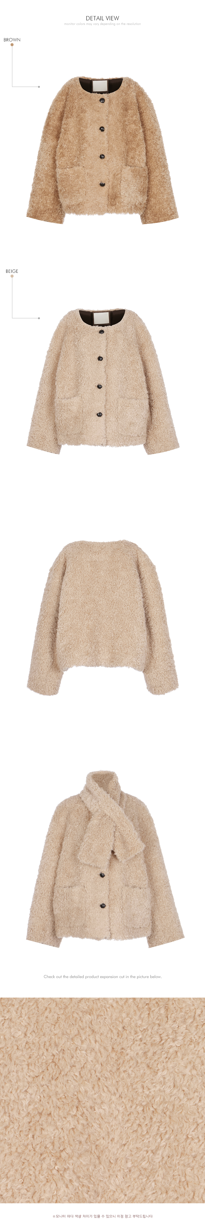 充满休闲气息的圈圈绒外套。 采用聚酯纤维材质制成,轻盈柔软,带来温暖舒适的穿着感。细腻的圈圈绒面料营造出温暖且富有质感的视觉效果。 前襟纽扣开合,穿脱方便,两侧配有前口袋,提升实用性。随衣搭配的围巾套装,可灵活运用于多种造型中,兼具保暖性与造型亮点。 宽松的廓形自然垂坠,既舒适又展现出时髦的轮廓感。无论是日常出行还是校园造型,都能轻松搭配,展现活力休闲的氛围。 171CM 模特穿着 ONE 码,颜色为 BEIGE。