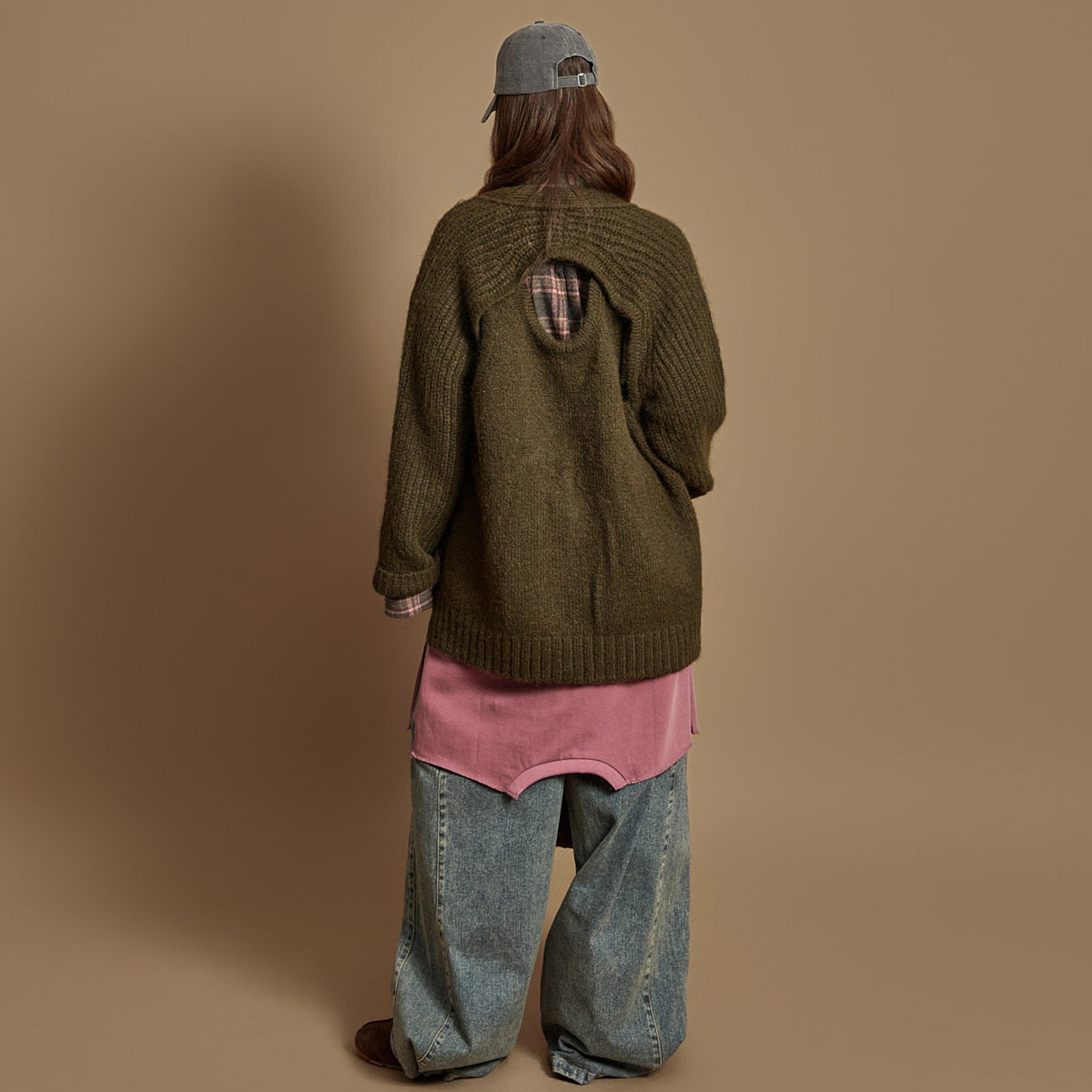 这是一款休闲风格的后开衩针织开衫。采用柔软温暖的混纺针织材质制作,穿着舒适,富有弹性,增加活动便利性。背部如同小披肩般的开衩设计是亮点,为基础廓形增添独特感,同时有助于自然遮盖身形。双侧开衩设计方便叠穿造型,前方口袋和纽扣开合提升实用性。是一款适合日常穿着的开衫,可轻松搭配无袖上衣或T恤,适合早秋至晚秋季节穿着,实用性高。模特身高171CM,穿着ONE尺码,卡其色。