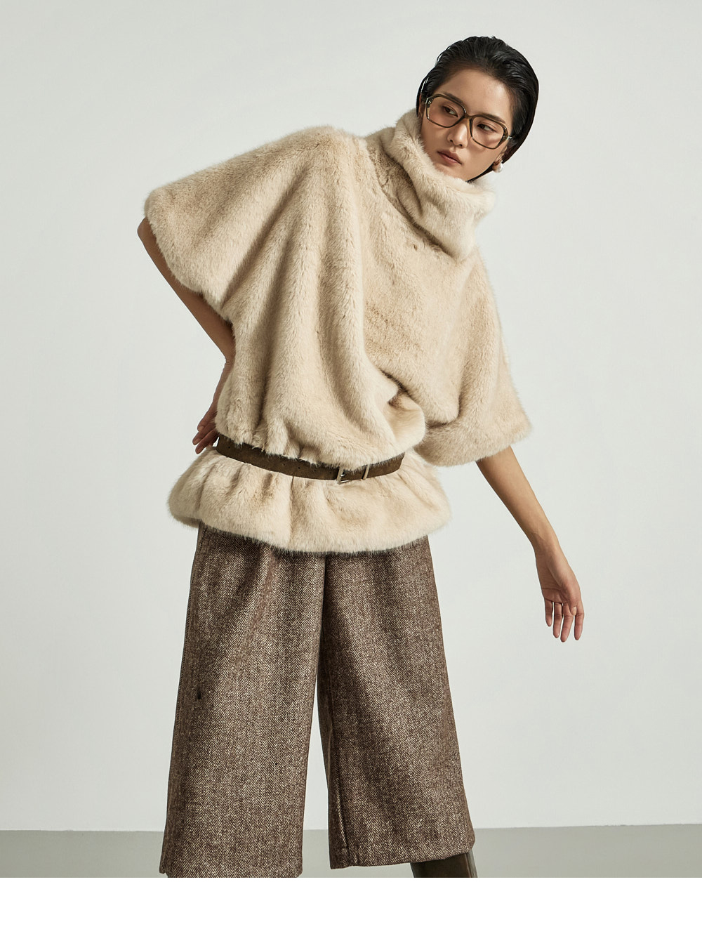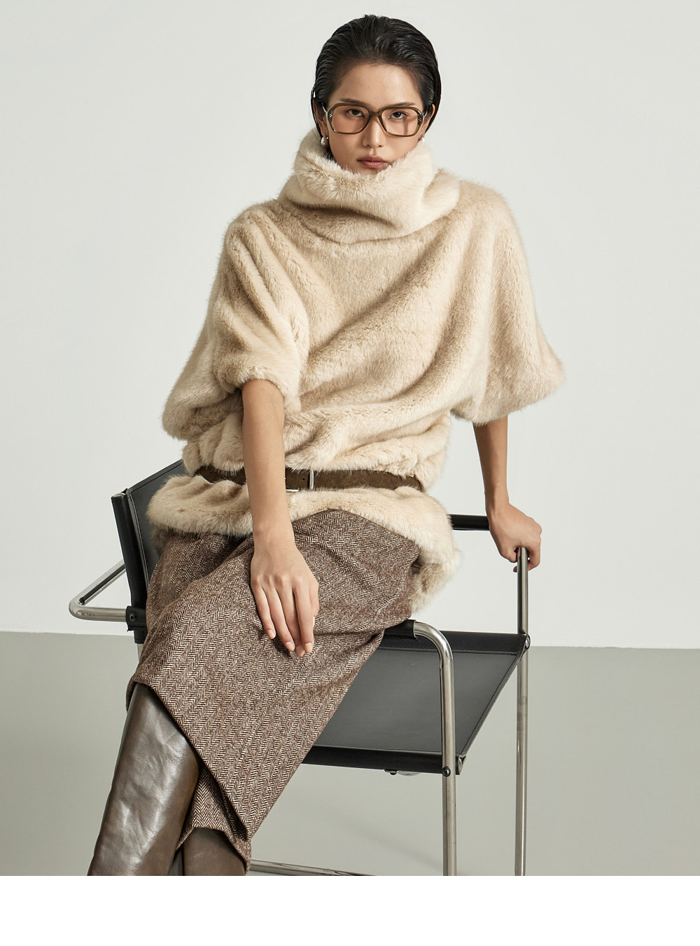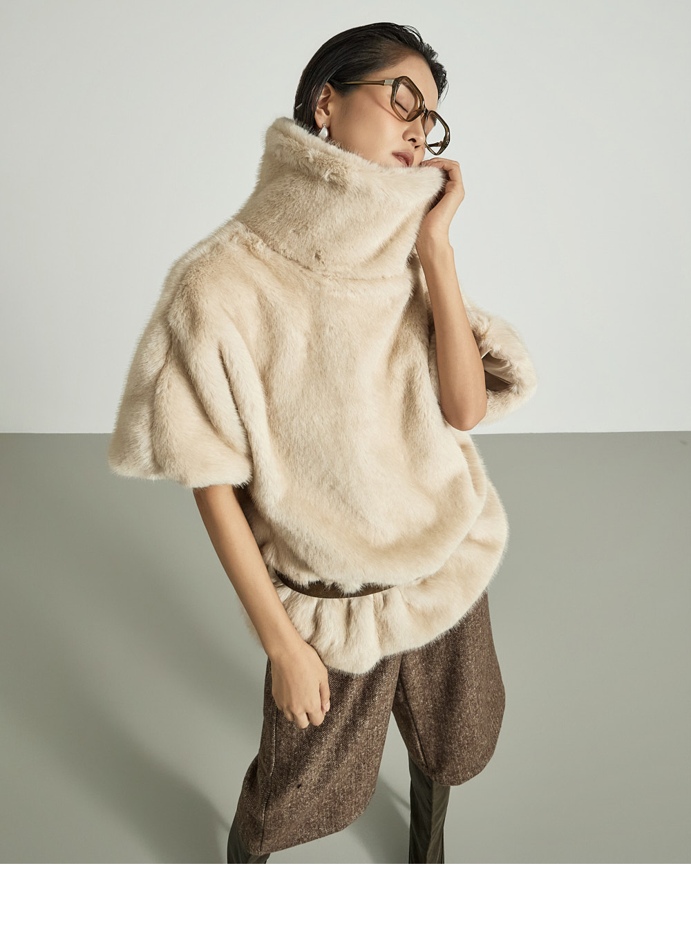 模特身高173CM,穿着ONE码,颜色为象牙色。