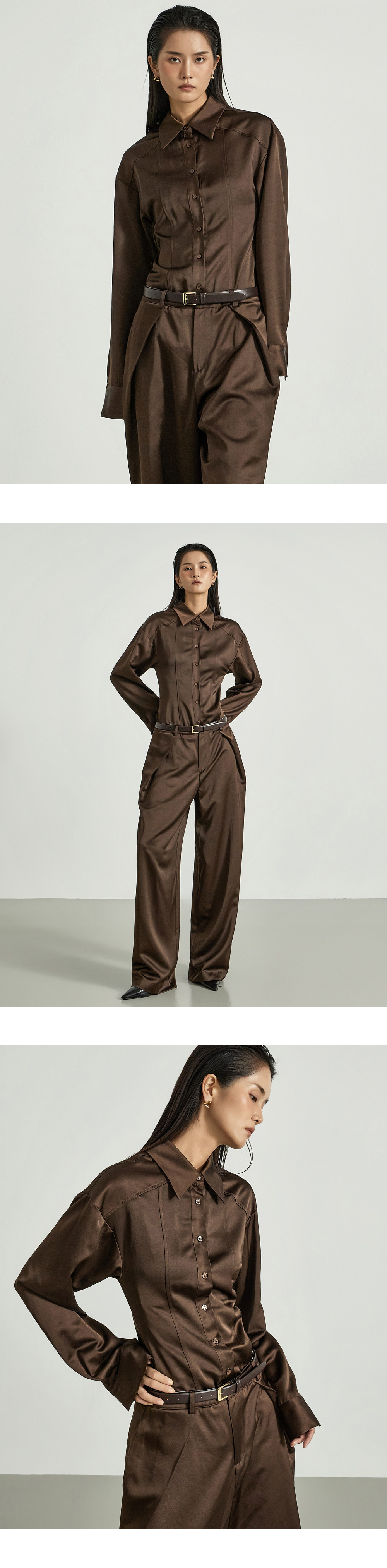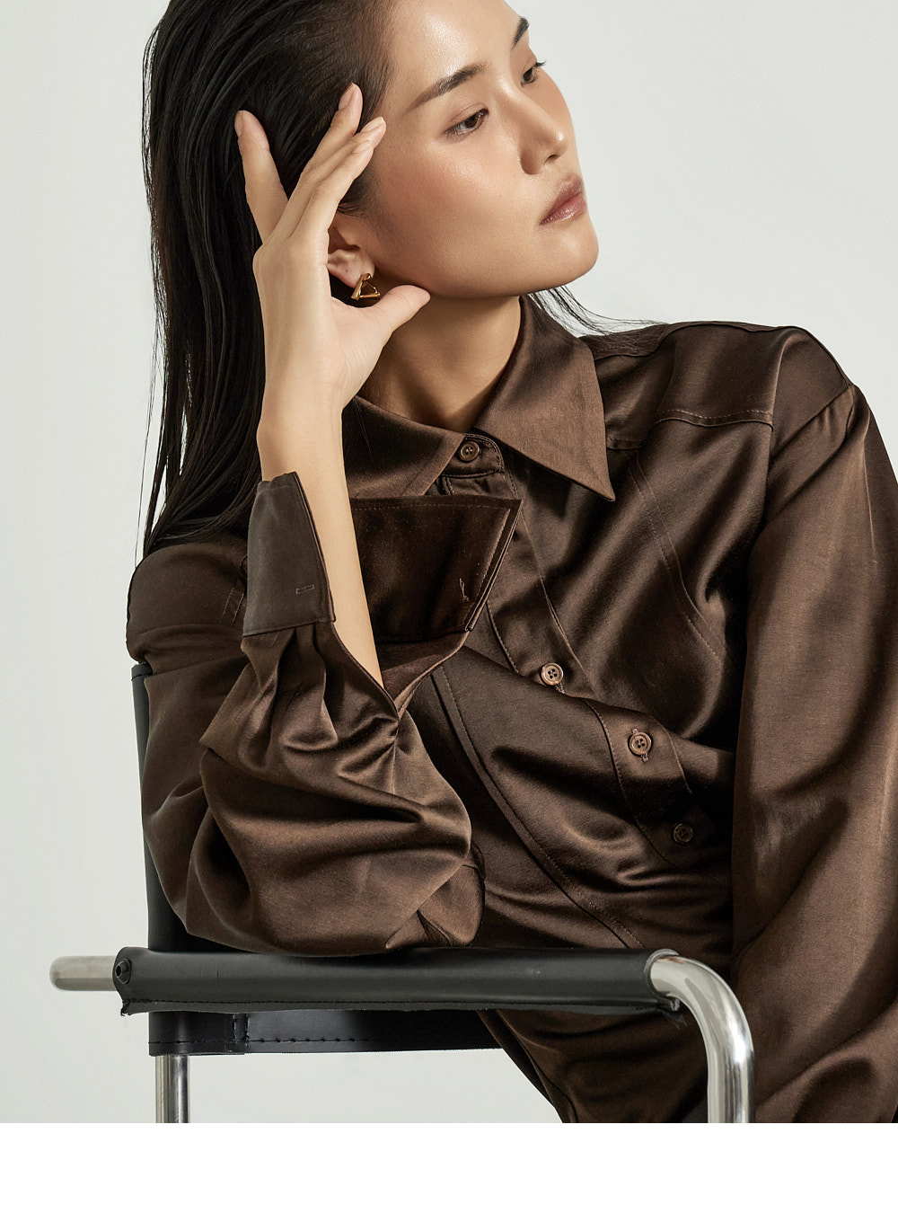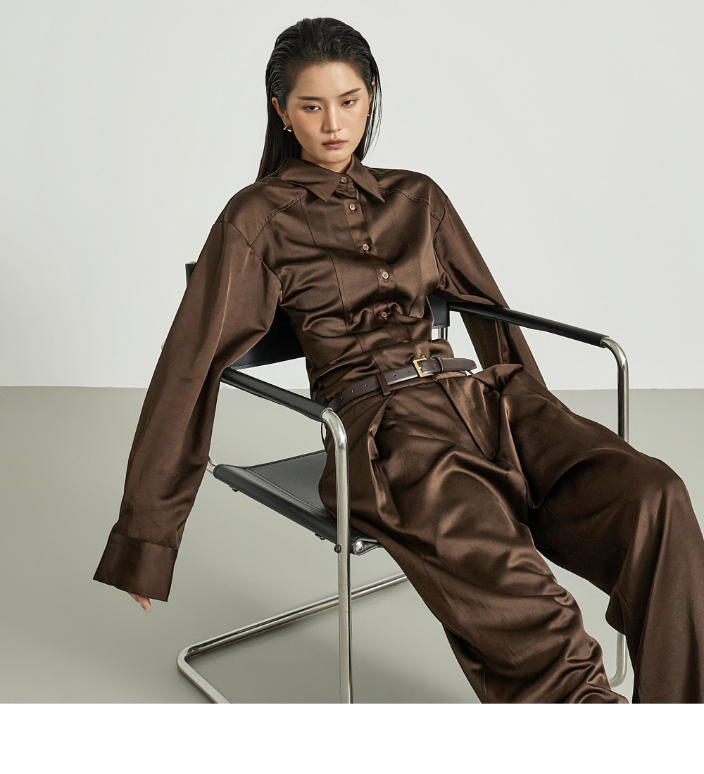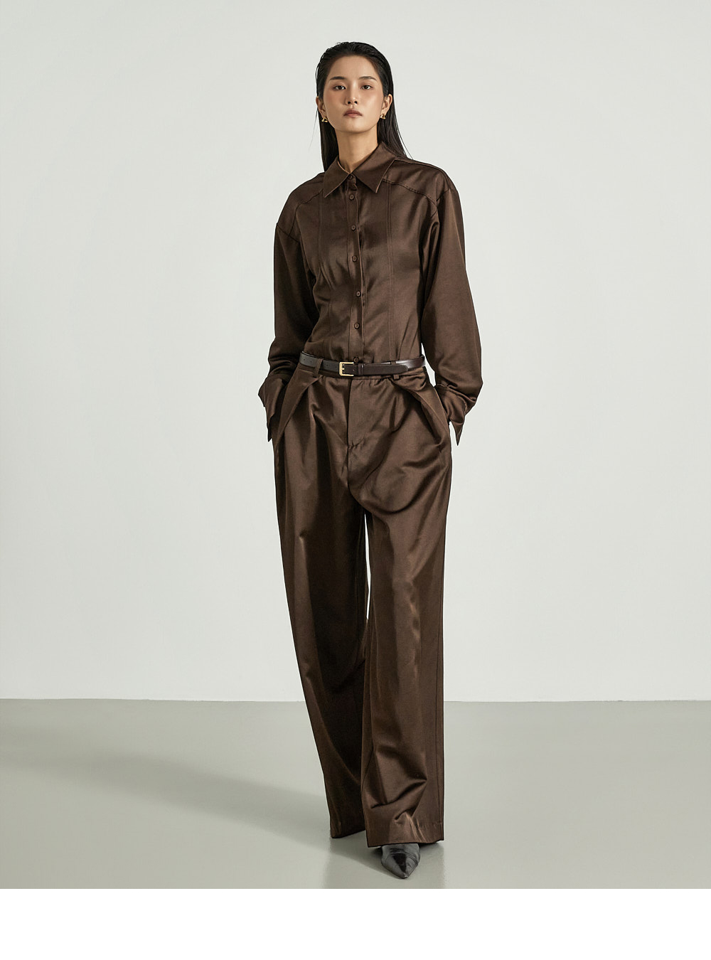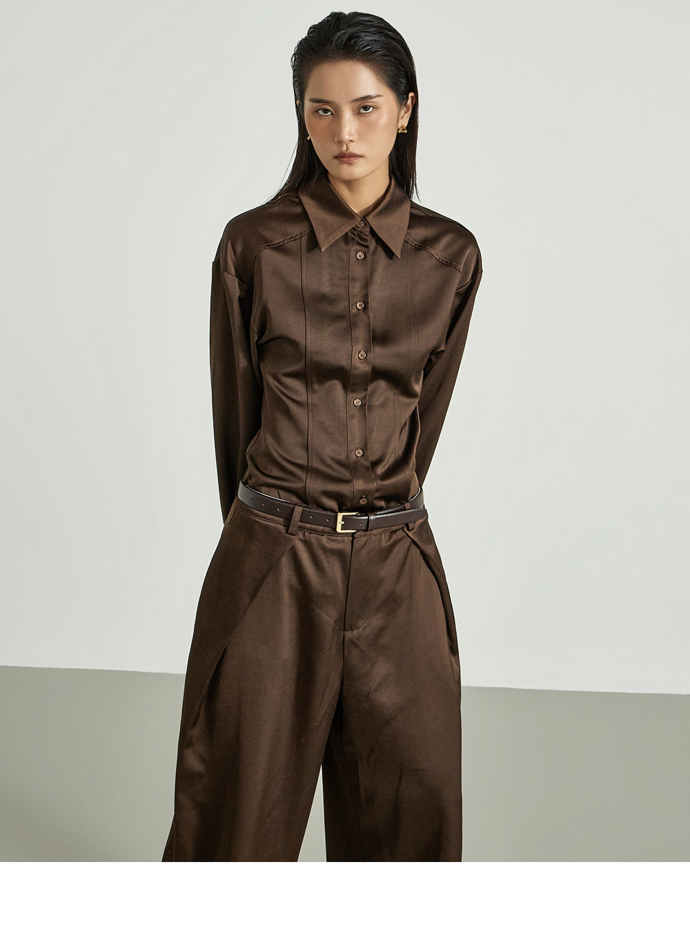 这是一款展现高级气质的缎面长裤。 采用天丝与聚酯混纺面料制成,质地柔软顺滑,穿着舒适,缎面材质散发出淡雅光泽,增添奢华感。 宽松的直筒版型搭配臀部褶饰设计,勾勒出自然流畅的线条,展现独特的廓形。前拉链与扣环开合设计,穿着稳固便捷,两侧口袋增加实用性。 面料本身自带亮点,即使搭配简约上装也能轻松打造时尚造型。这款长裤兼具高雅与个性,无论是正式场合还是日常穿搭,都能展现出洗练而摩登的气质。 模特身高173CM,穿着S码,颜色为深棕色。