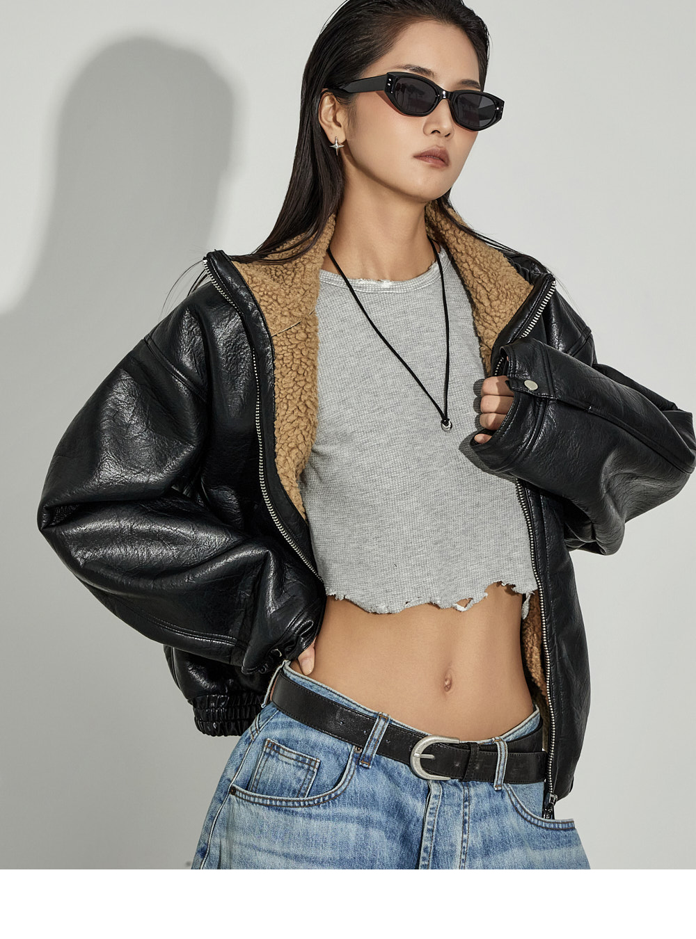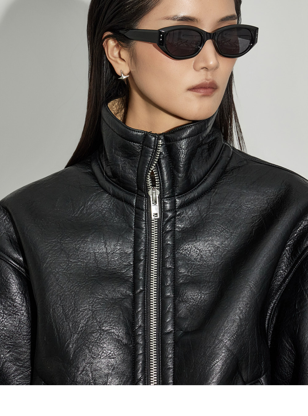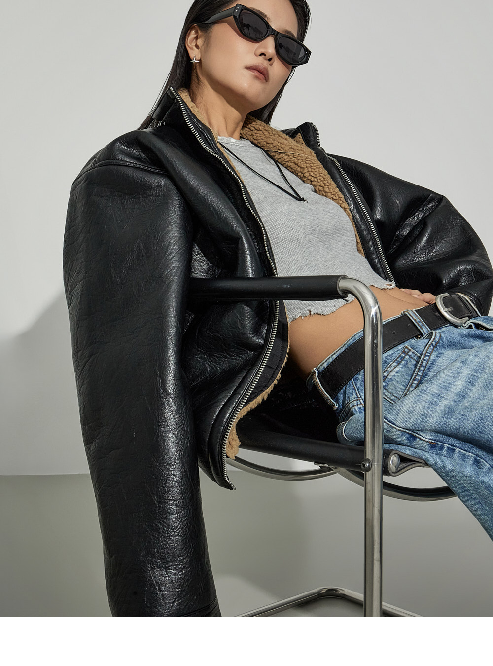 酷感风格的高领皮革夹克。 采用聚氨酯材质制作,塑造挺括的轮廓,内部添加羊毛内衬,提供温暖舒适的穿着体验。 短款宽松版型设计,打造时尚且比例协调的轮廓感,前置双向拉链与下摆松紧设计兼顾实用性与造型感。 双侧口袋增添休闲亮点,单穿即可呈现酷感且时尚的秋冬季外套造型。 模特身高173CM,穿着ONE码,黑色。
