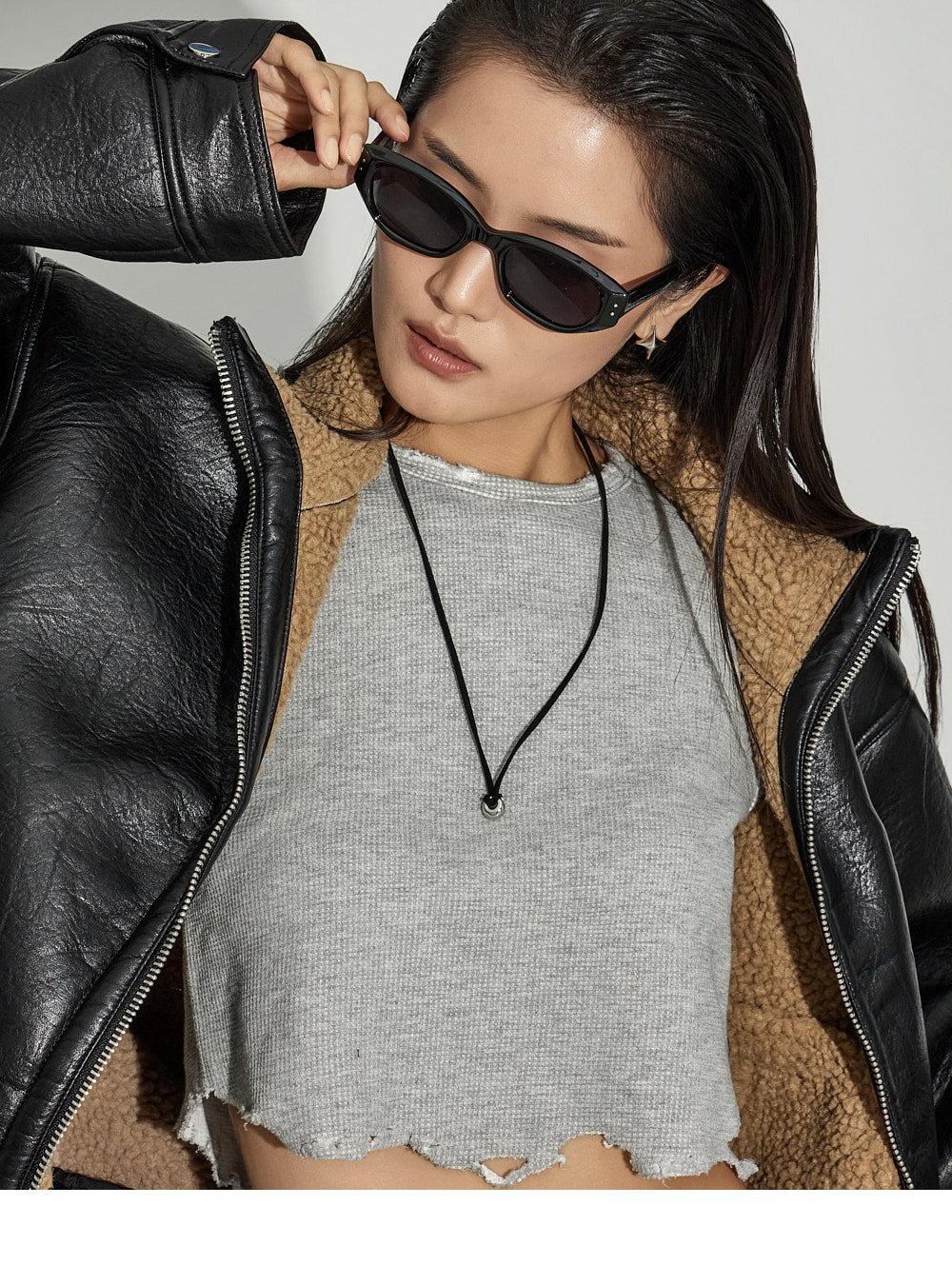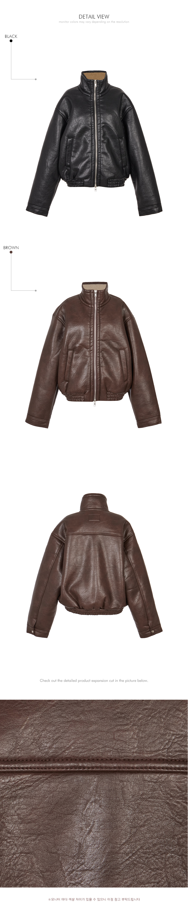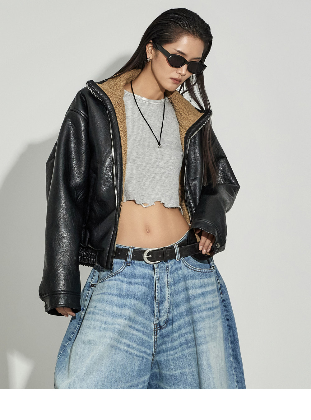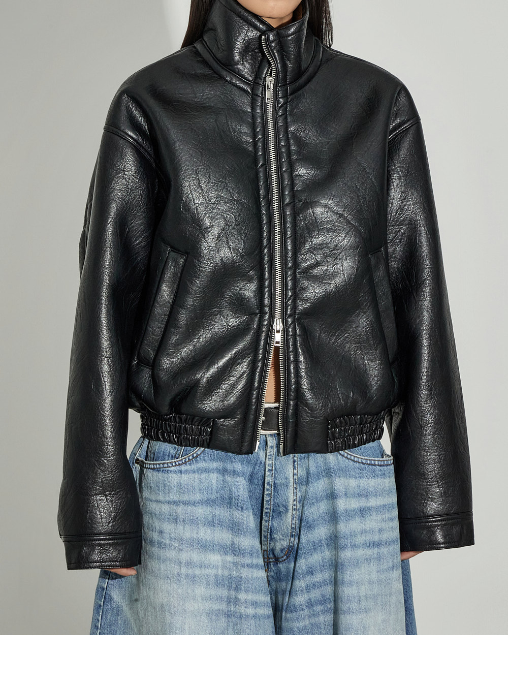 酷感风格的高领皮革夹克。 采用聚氨酯材质制作,塑造挺括的轮廓,内部添加羊毛内衬,提供温暖舒适的穿着体验。 短款宽松版型设计,打造时尚且比例协调的轮廓感,前置双向拉链与下摆松紧设计兼顾实用性与造型感。 双侧口袋增添休闲亮点,单穿即可呈现酷感且时尚的秋冬季外套造型。 模特身高173CM,穿着ONE码,黑色。