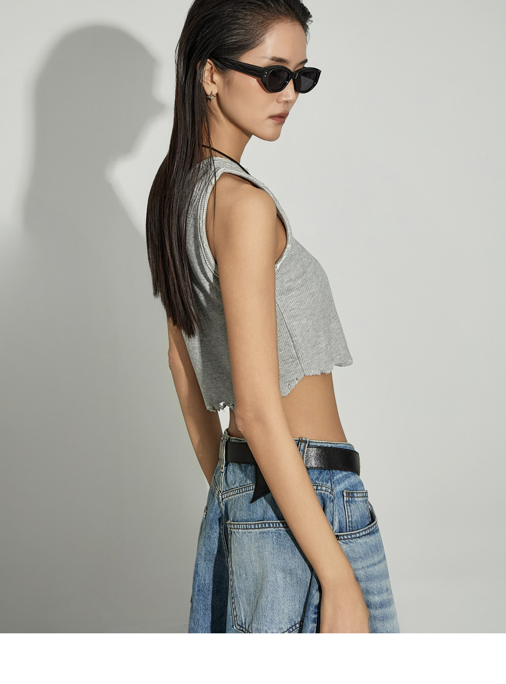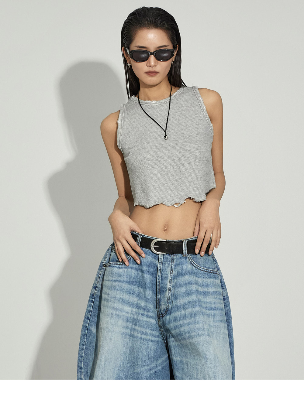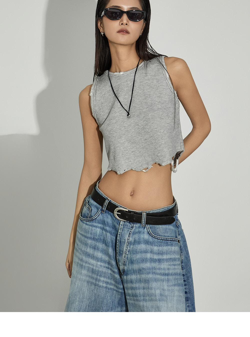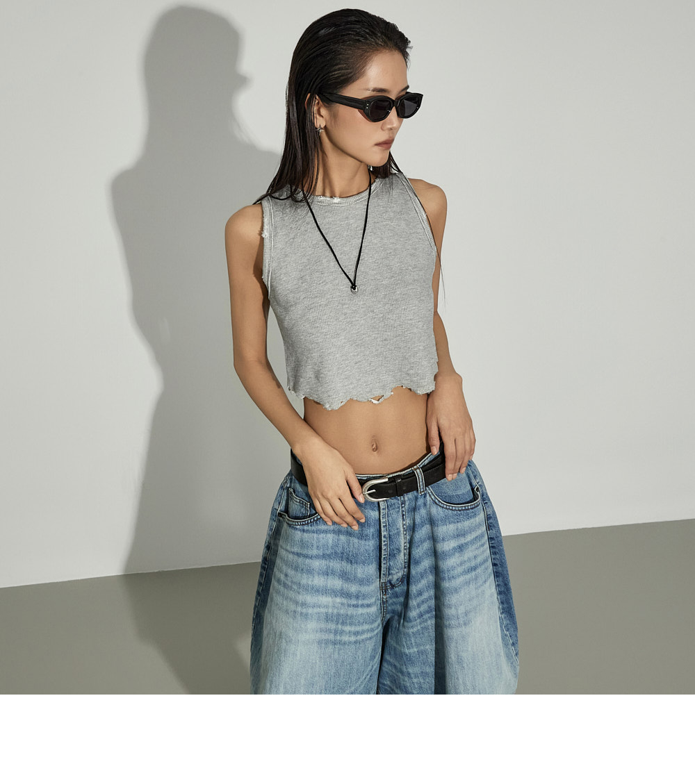 街头风格的短款无袖上衣。 采用棉、粘纤与氨纶混纺材质制作,柔软且具有适度弹性,提供舒适的穿着感。 下摆自然剪裁并加入破坏感设计,呈现独特且复古的风格,宽松圆领设计,无负担地穿着。 使用保暖性较高的秋冬季面料,可单穿,也可作为各种外套内搭。 是打造潮流街头风格的必备单品。 模特身高173CM,穿着ONE码,灰色。
