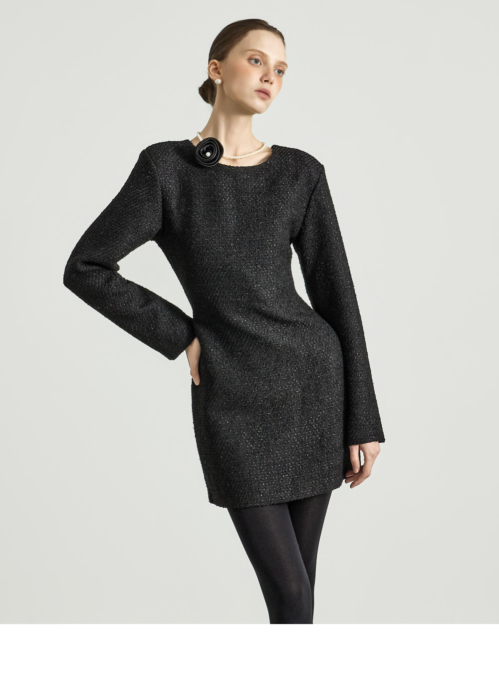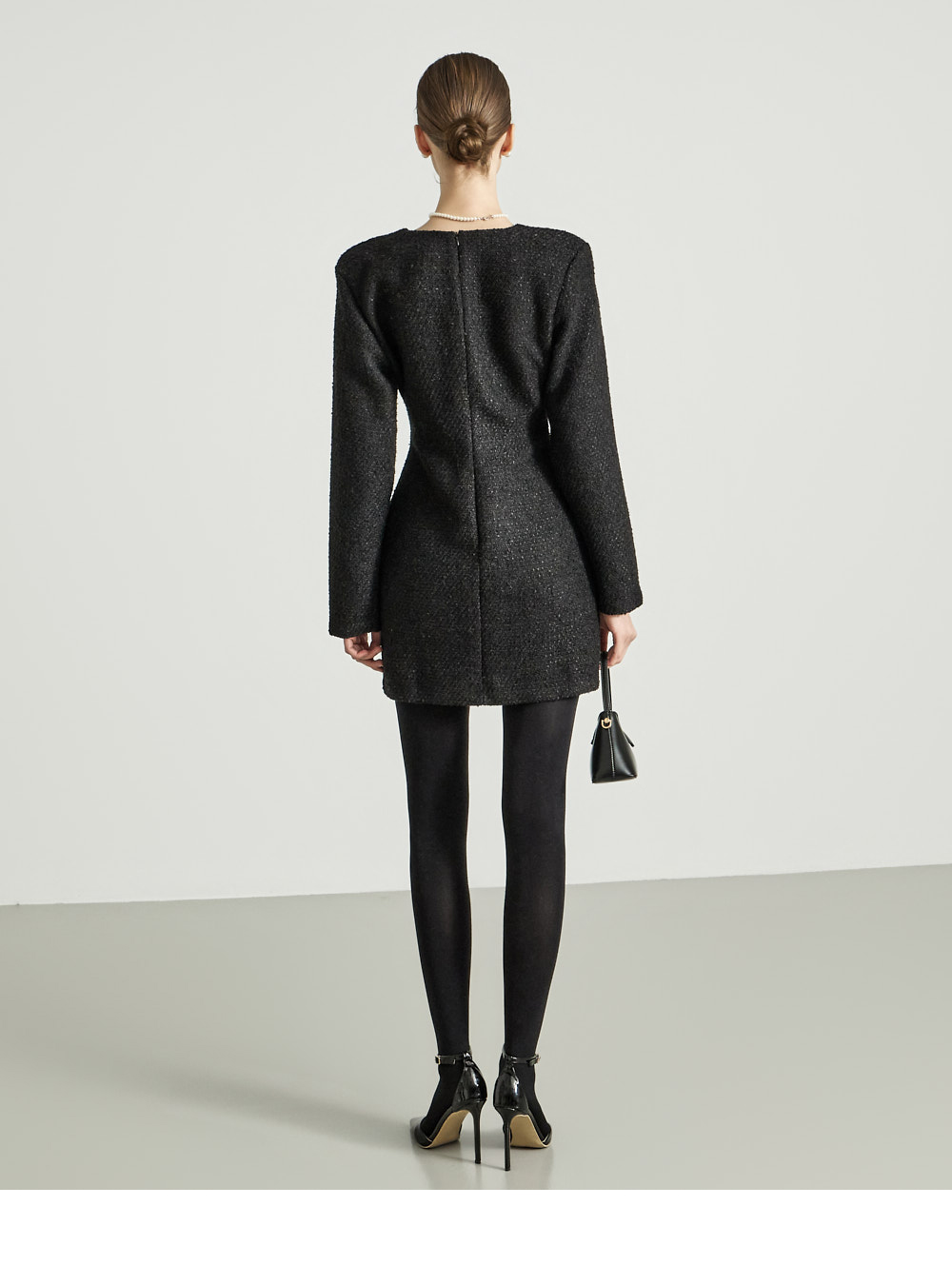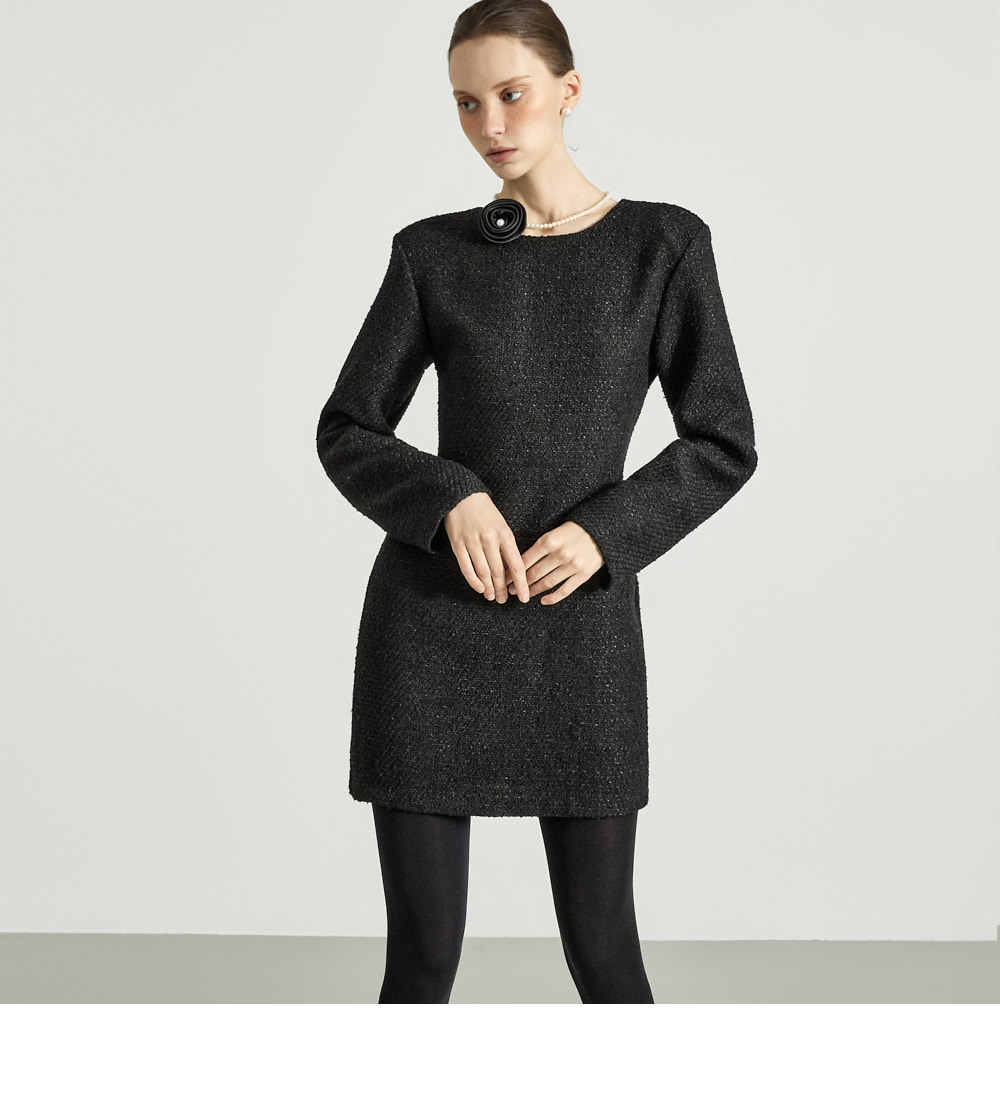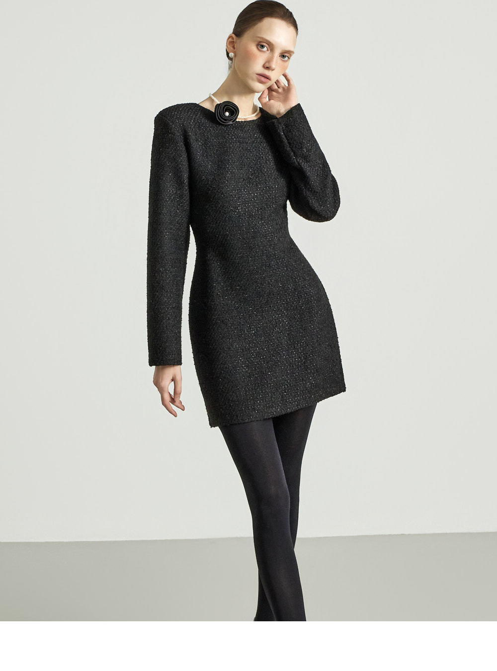 局部里衬设计增加穿着舒适感,背部拉链便于轻松穿脱,同时肩垫设计让整体剪裁更均衡。迷你裙长度能拉长腿部比例。