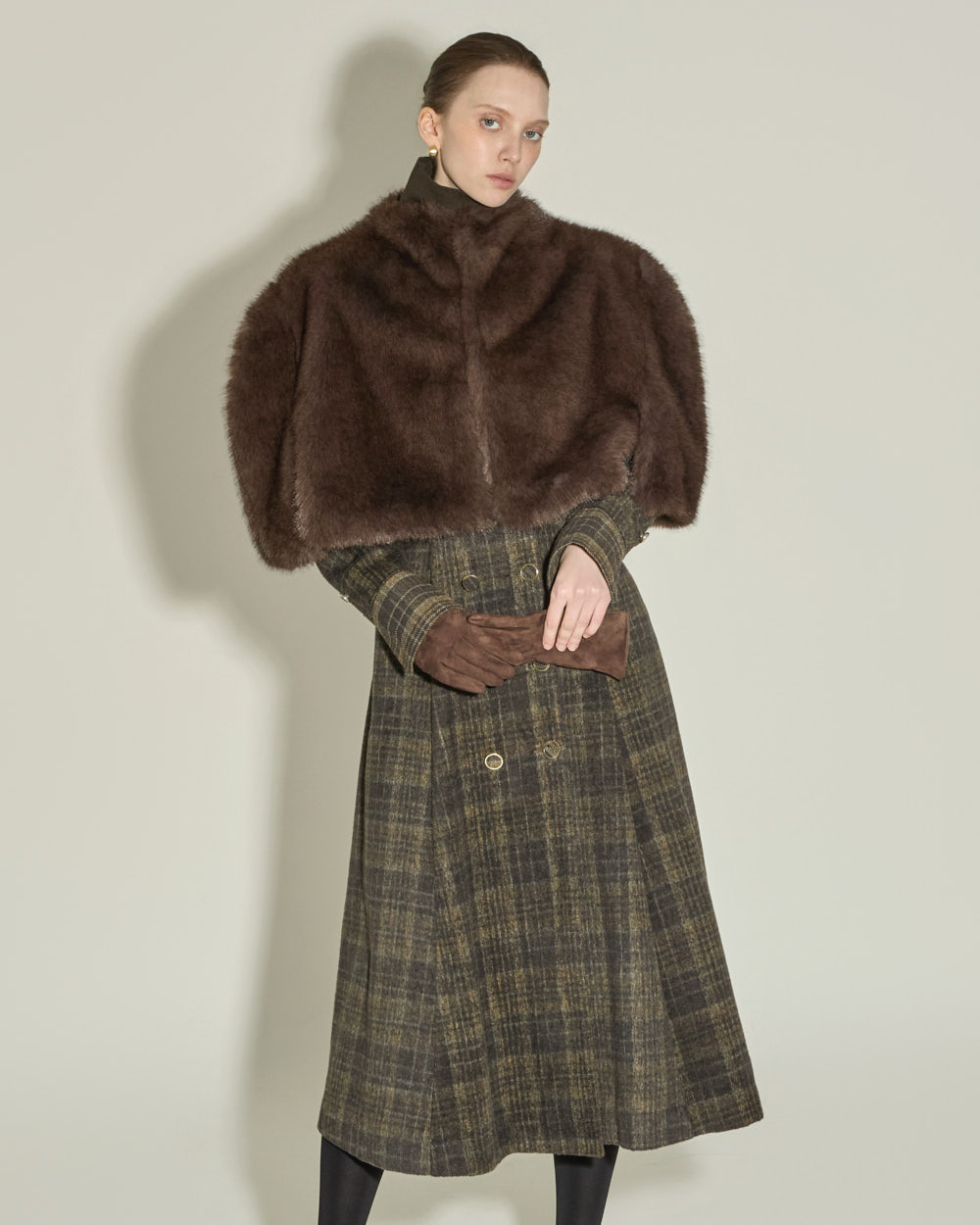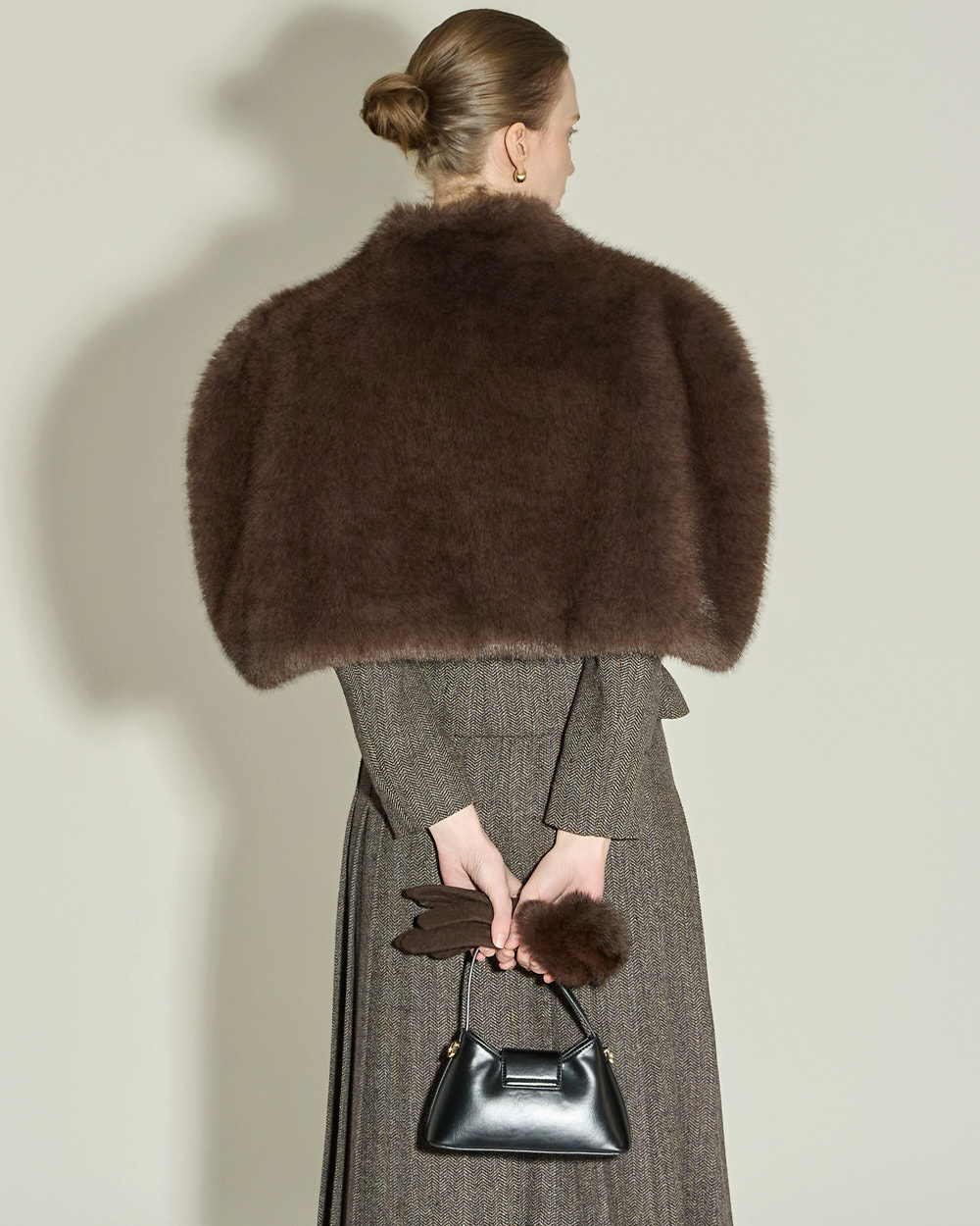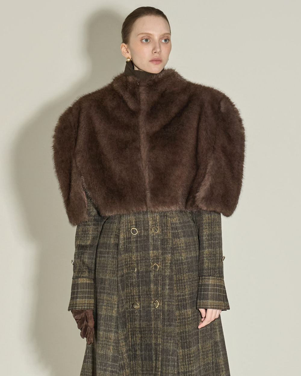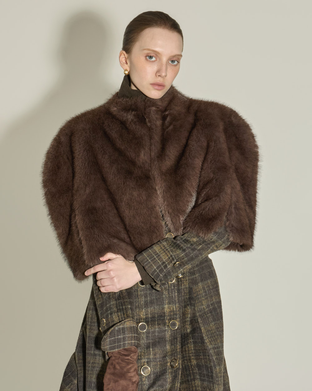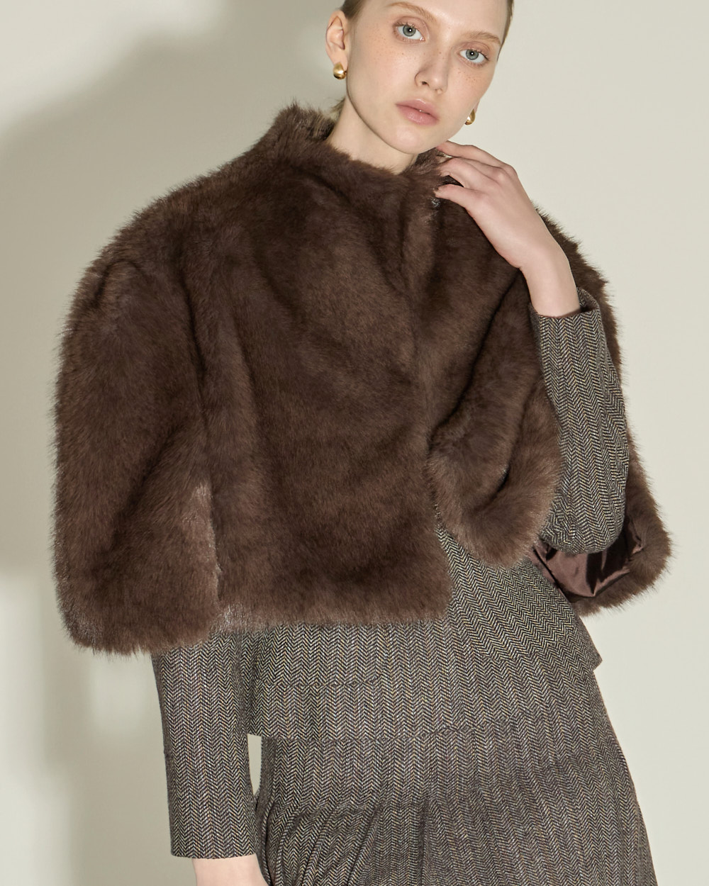 优雅氛围的毛绒斗篷。 采用聚酯纤维仿皮草面料制作,呈现出柔软温暖的质感,短款斗篷式廓形营造出精致利落的整体氛围。 袖口开衩细节提升自然活动度,正面搭配金属扣开合,增添经典格调。 整体内衬设计,穿着更加稳定舒适,是一款为整体造型增添高级亮点的单品。 173CM 模特穿着 ONE 尺码,DARK BROWN 颜色。