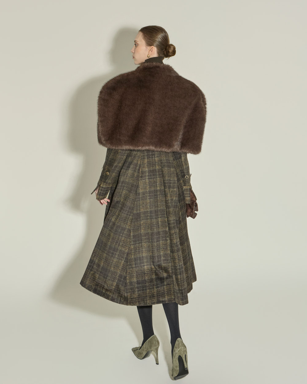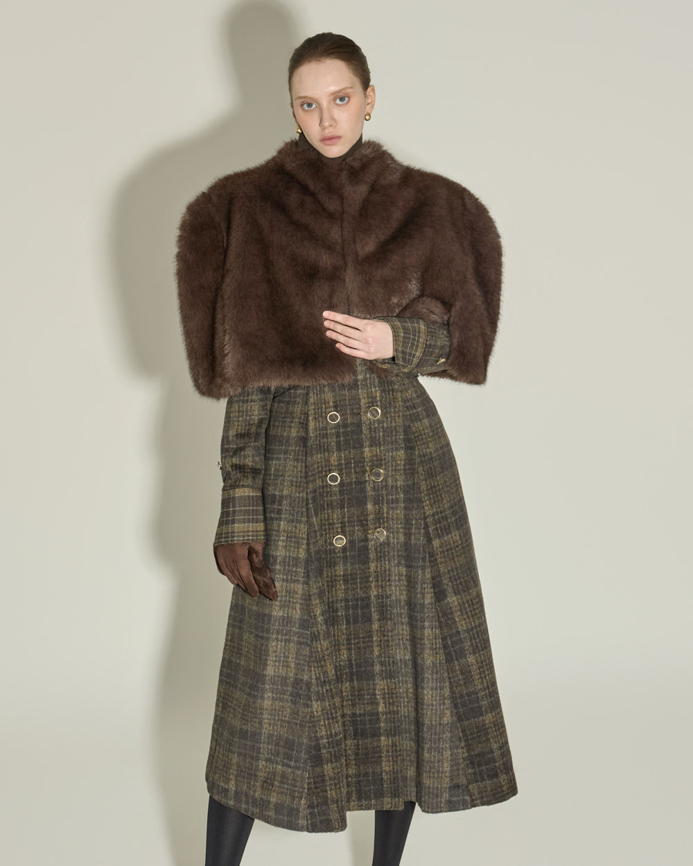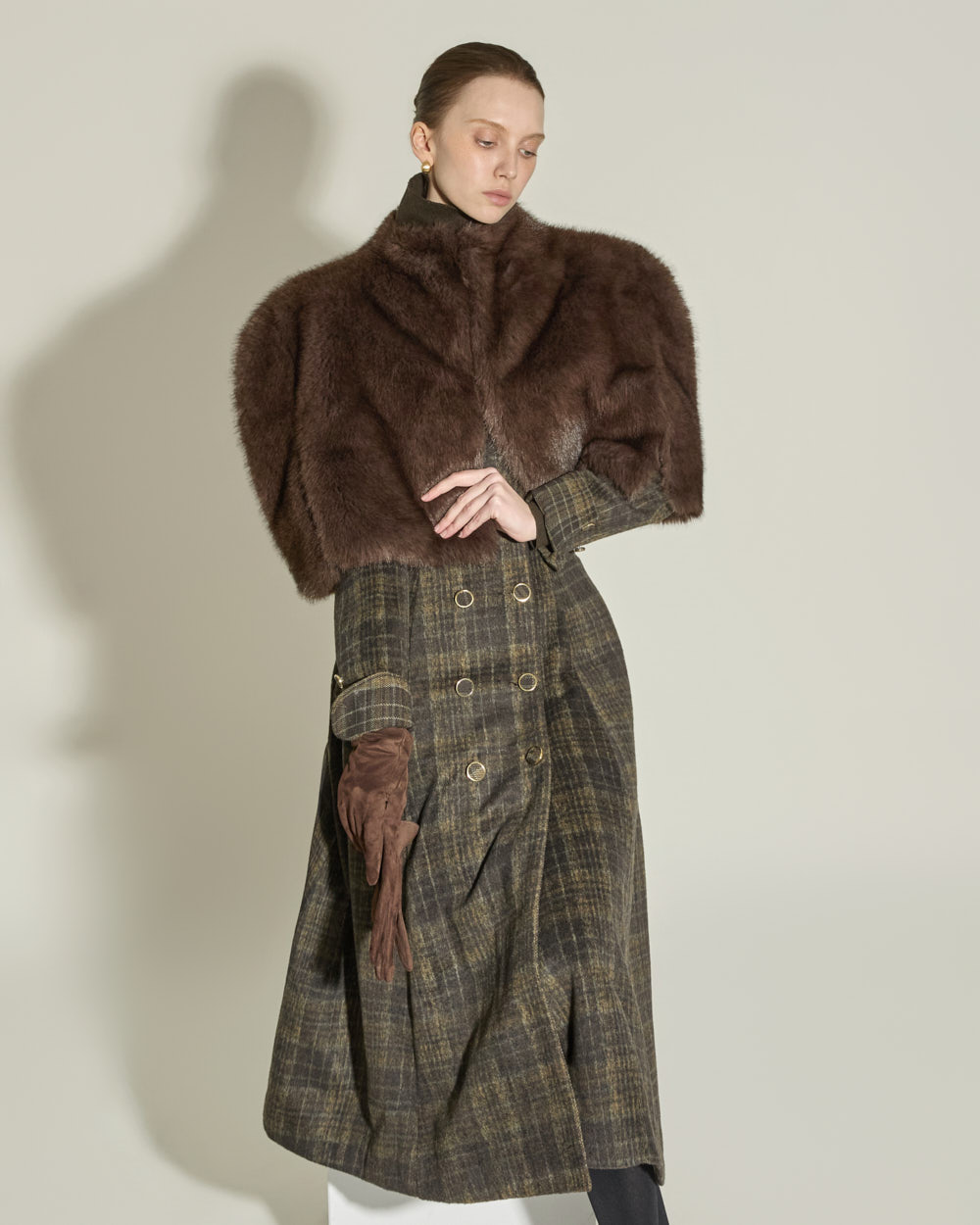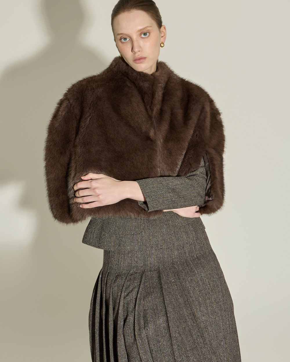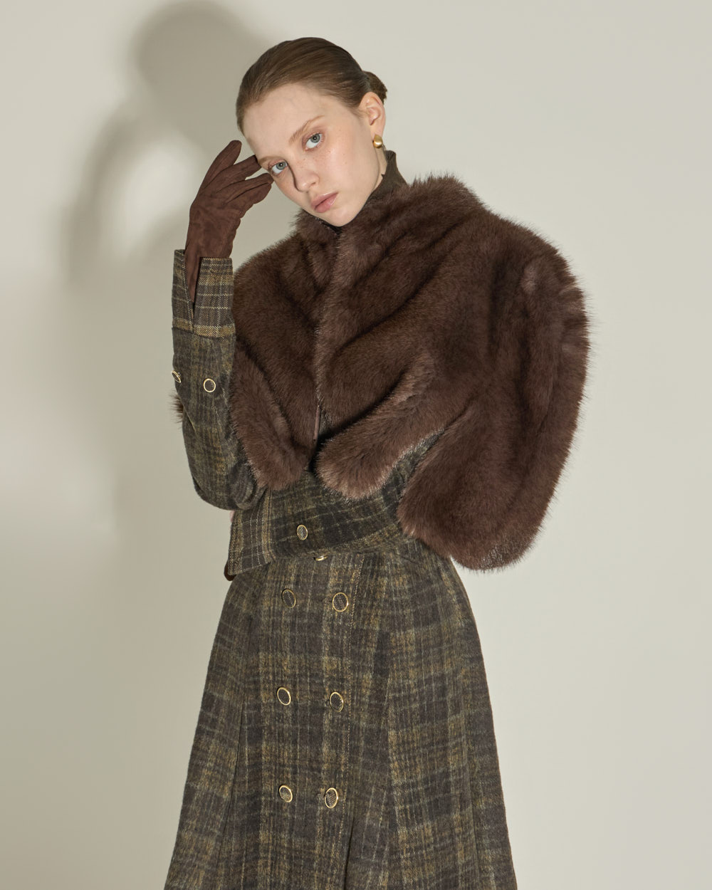 优雅氛围的毛绒斗篷。 采用聚酯纤维仿皮草面料制作,呈现出柔软温暖的质感,短款斗篷式廓形营造出精致利落的整体氛围。 袖口开衩细节提升自然活动度,正面搭配金属扣开合,增添经典格调。 整体内衬设计,穿着更加稳定舒适,是一款为整体造型增添高级亮点的单品。 173CM 模特穿着 ONE 尺码,DARK BROWN 颜色。