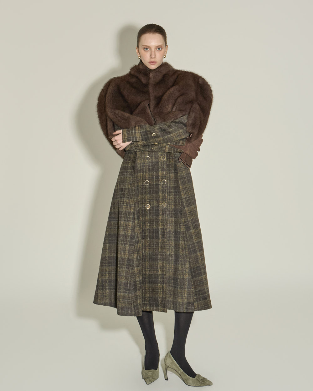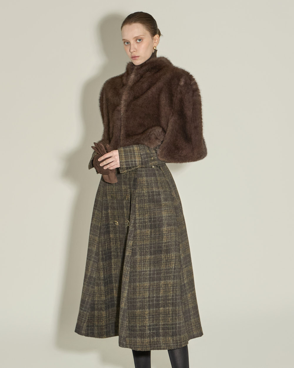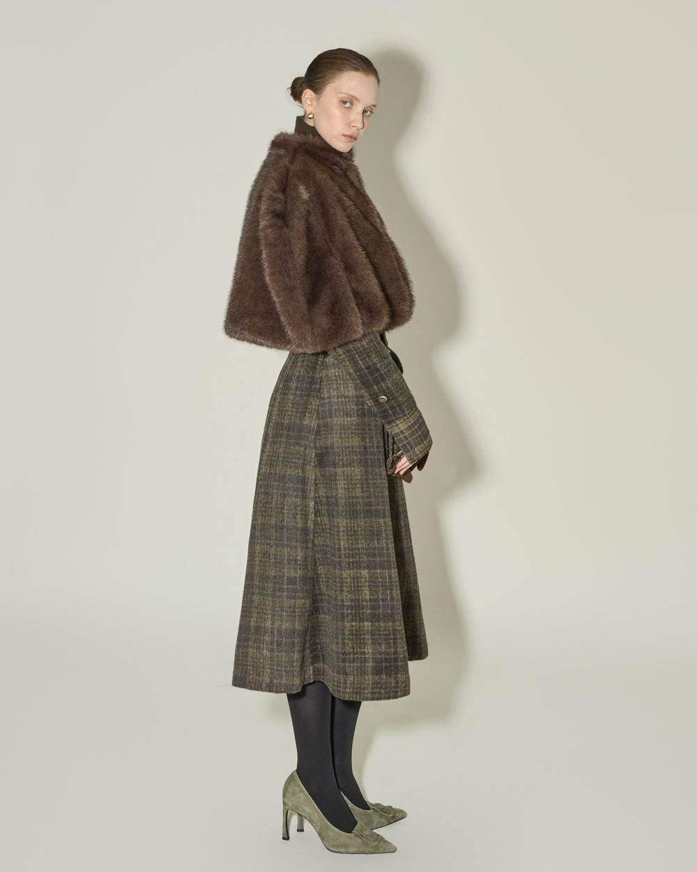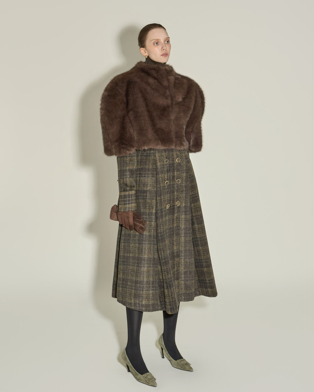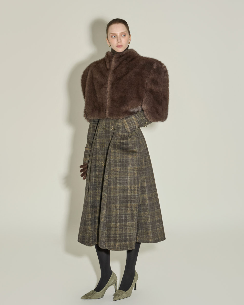 优雅氛围的毛绒斗篷。 采用聚酯纤维仿皮草面料制作,呈现出柔软温暖的质感,短款斗篷式廓形营造出精致利落的整体氛围。 袖口开衩细节提升自然活动度,正面搭配金属扣开合,增添经典格调。 整体内衬设计,穿着更加稳定舒适,是一款为整体造型增添高级亮点的单品。 173CM 模特穿着 ONE 尺码,DARK BROWN 颜色。