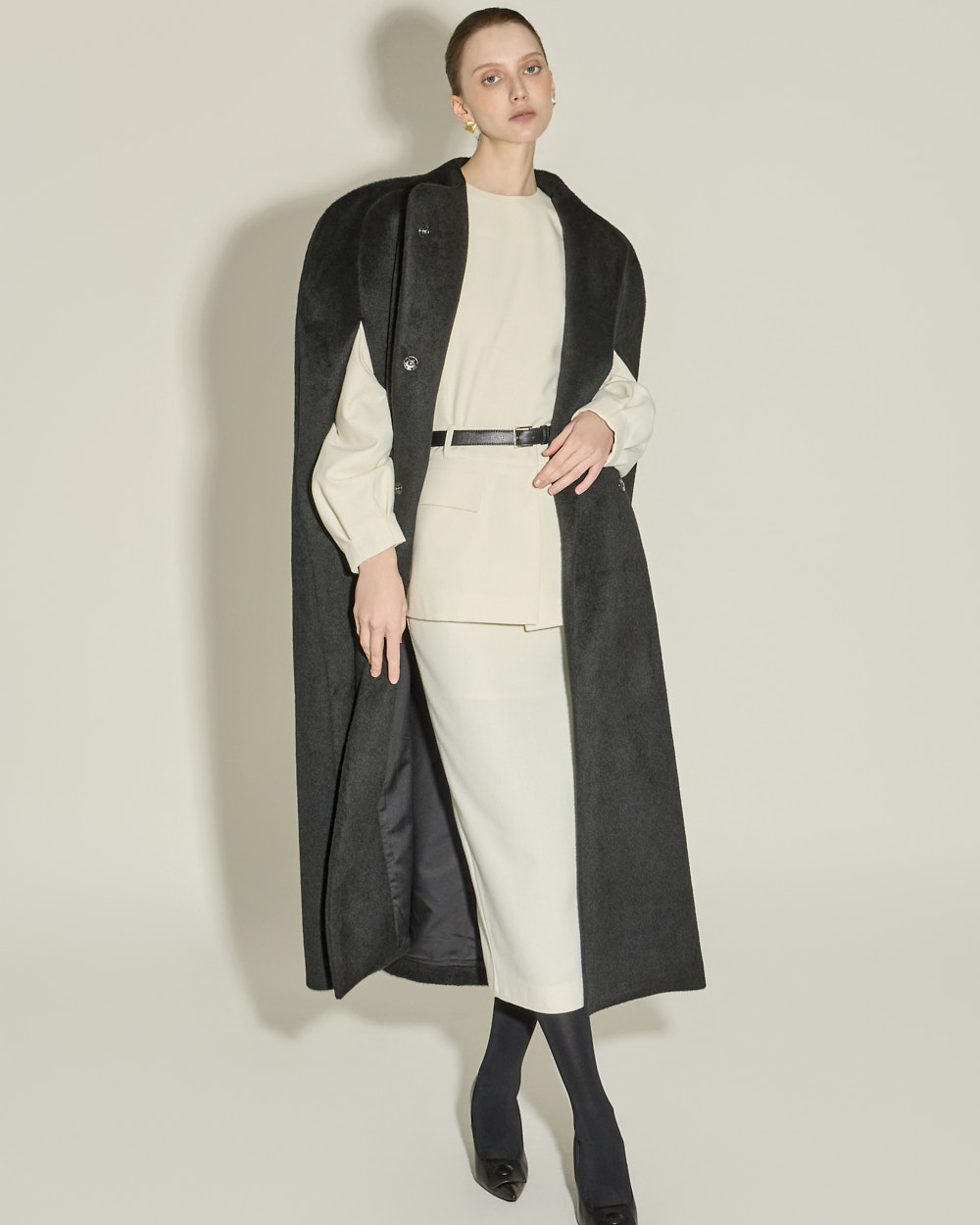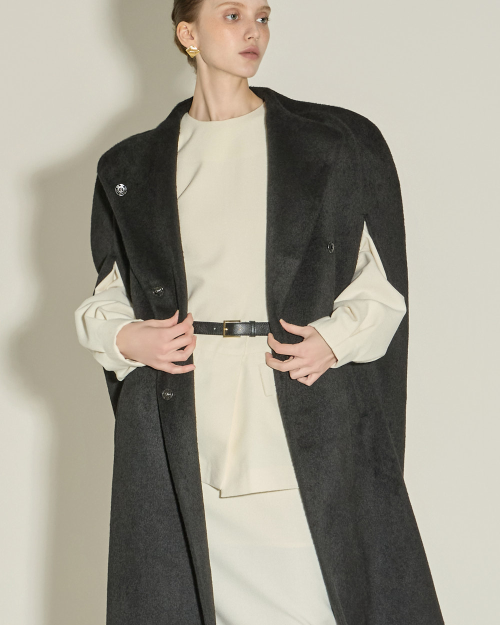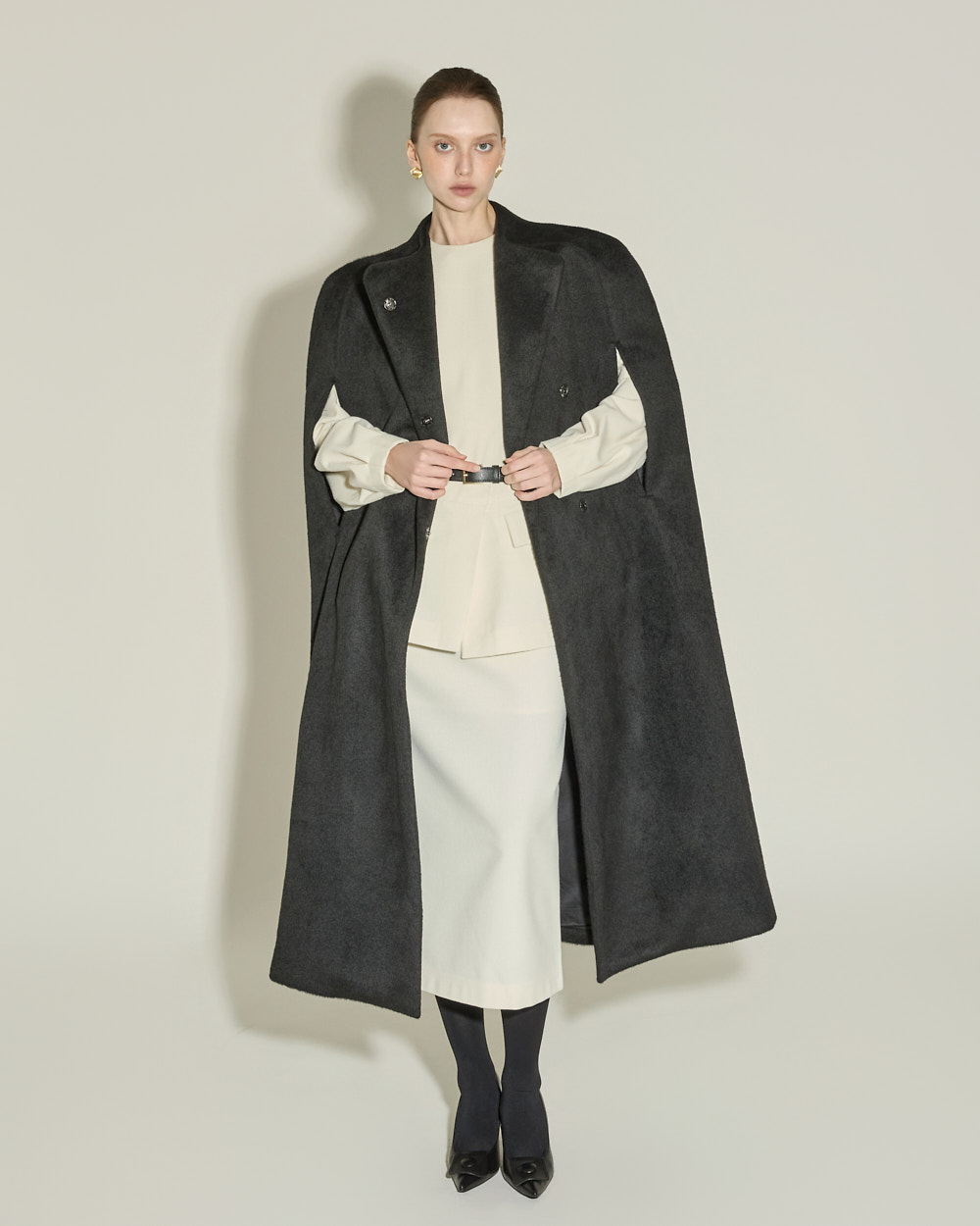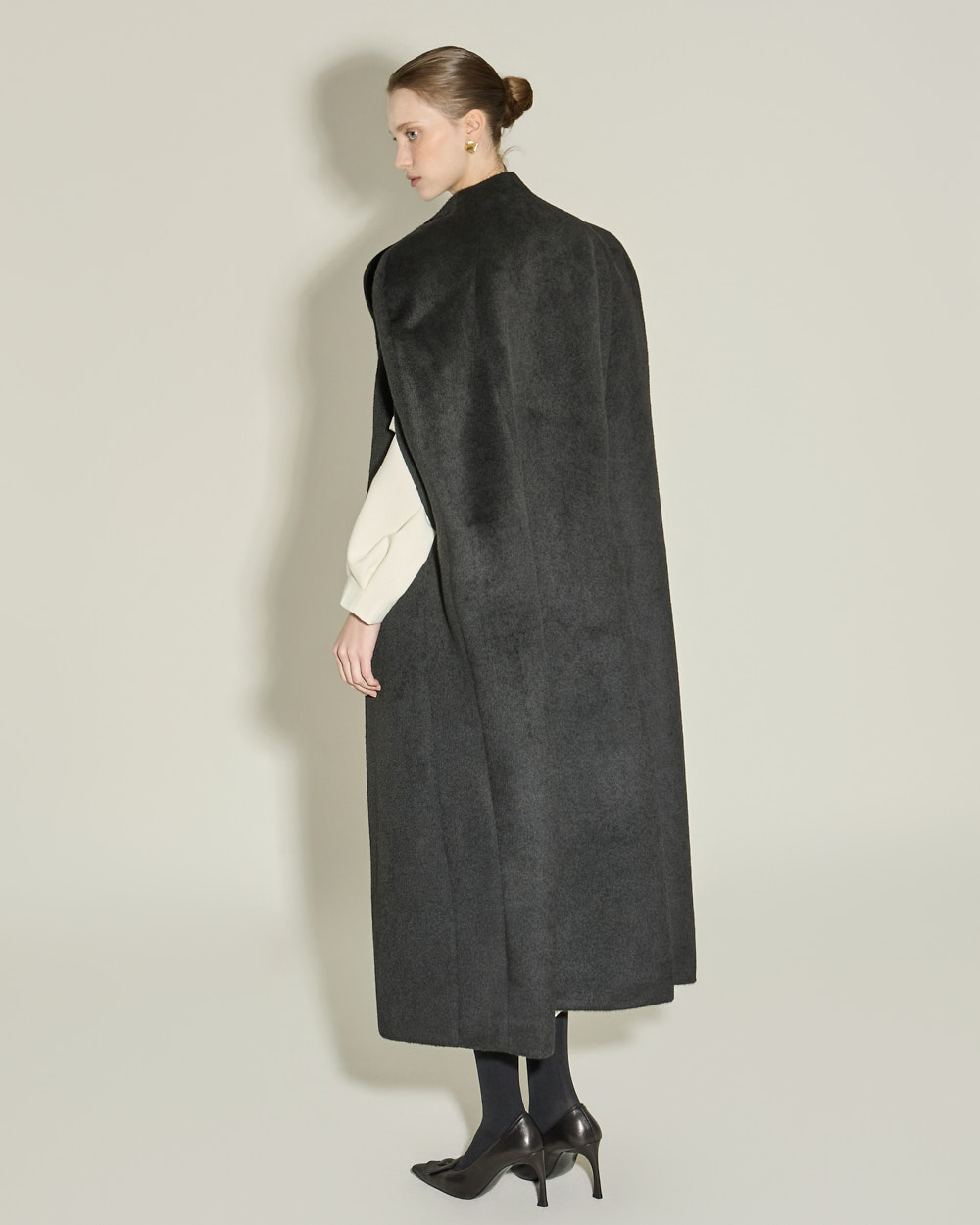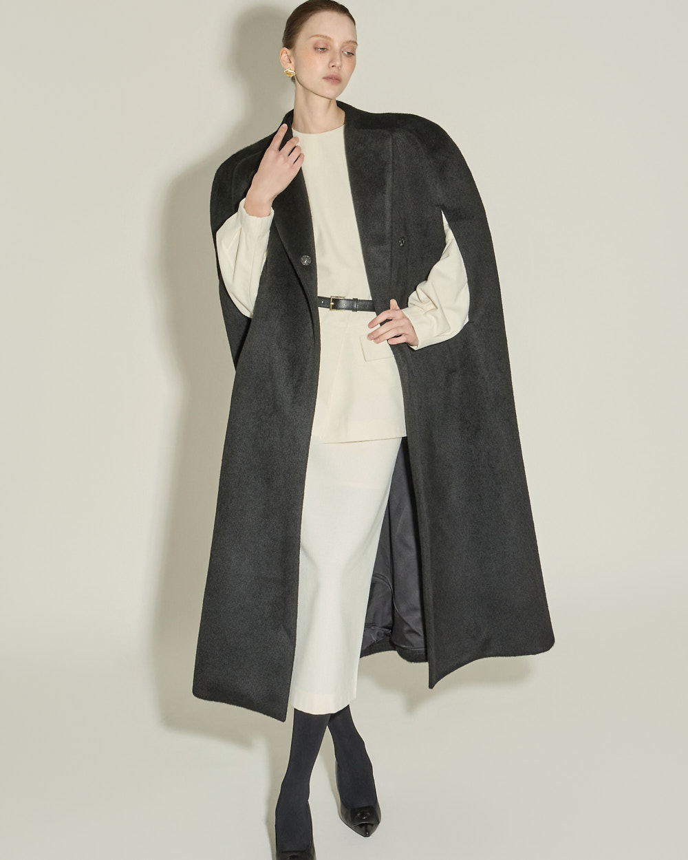 独特而优雅氛围的斗篷大衣。 采用聚酯纤维和羊毛混纺材质,可感受到高贵而温暖的穿着感,ONE 尺码可呈现宽松的版型。 超长衣长与极简设计相结合,营造戏剧感又克制的氛围,斗篷风格特有的开叉袖口和半高领细节打造结构感且精致的轮廓。 前襟按扣开合、双侧口袋、整体里衬处理提高实用性与成衣质感,可用于特殊场合或高端日常穿搭,单穿即可展现强烈存在感的外套。 173CM 模特穿着 ONE 尺码,BLACK 颜色。