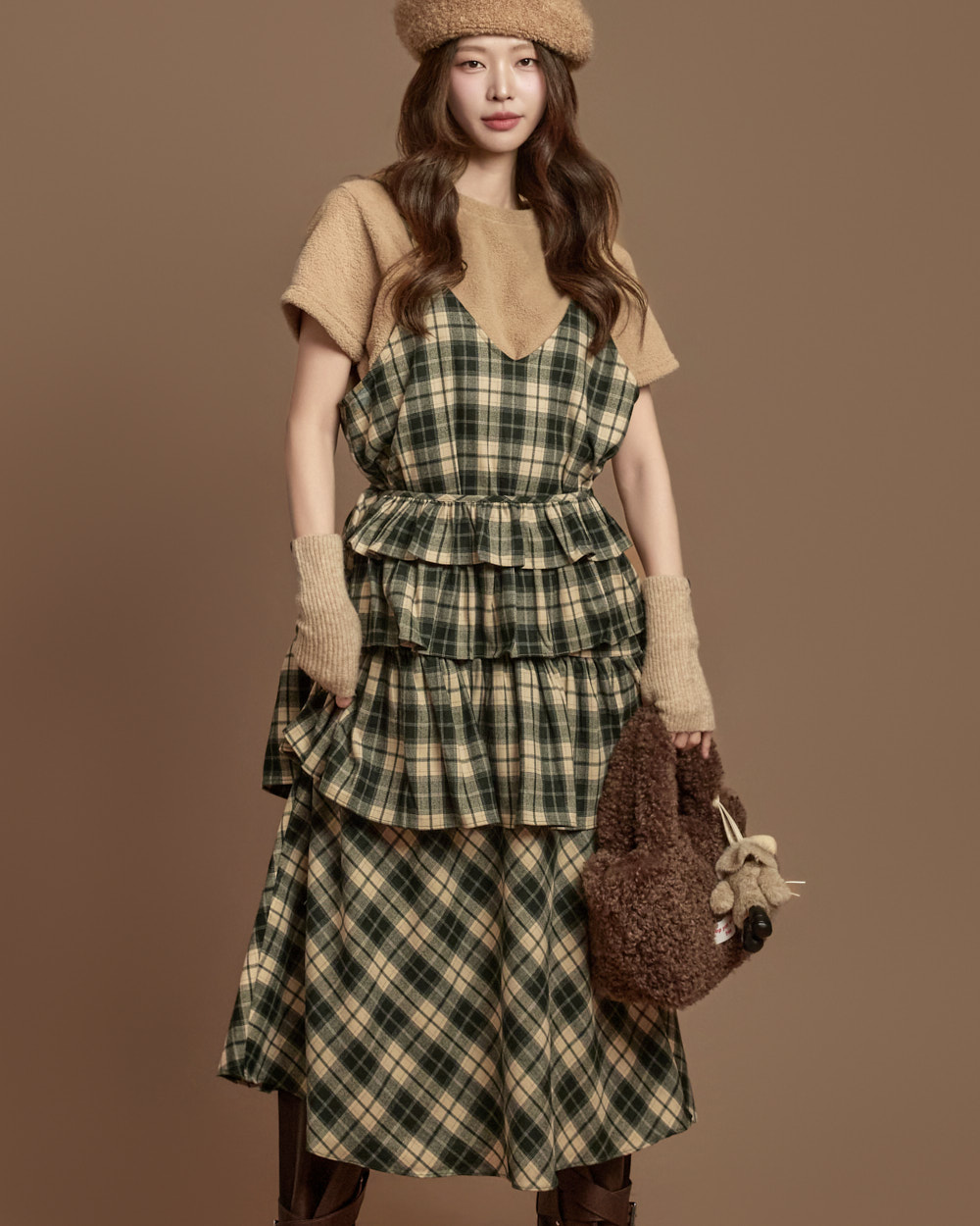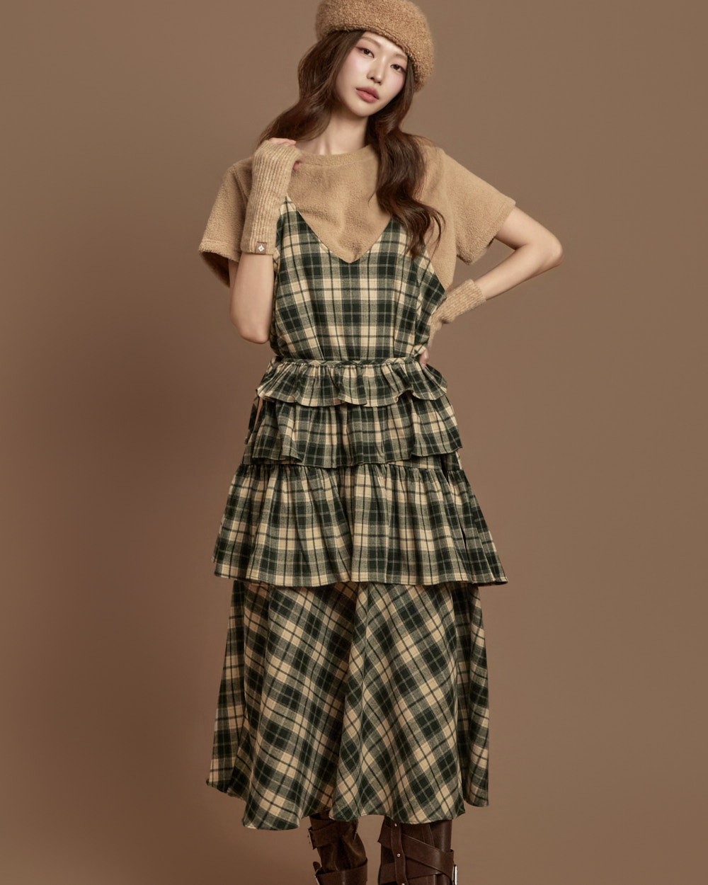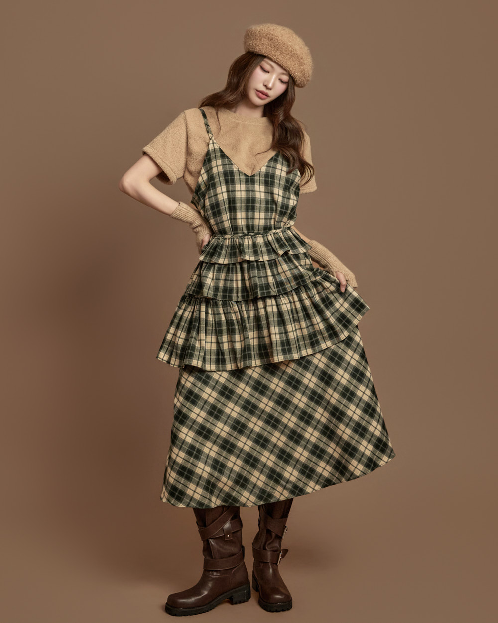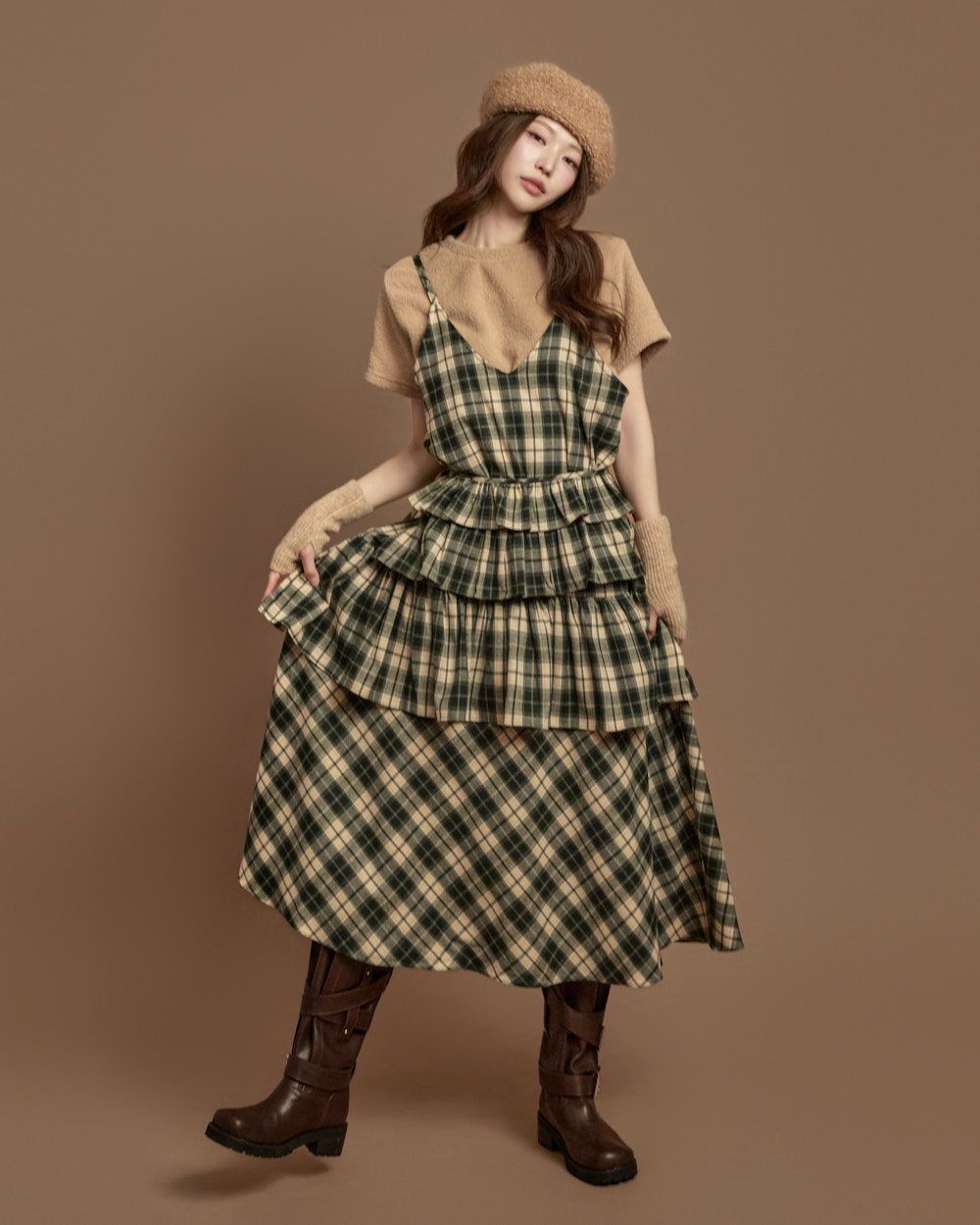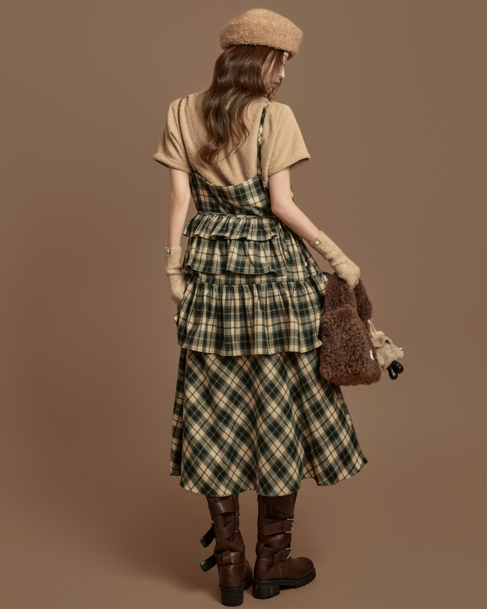 格纹图案的荷叶边半身裙