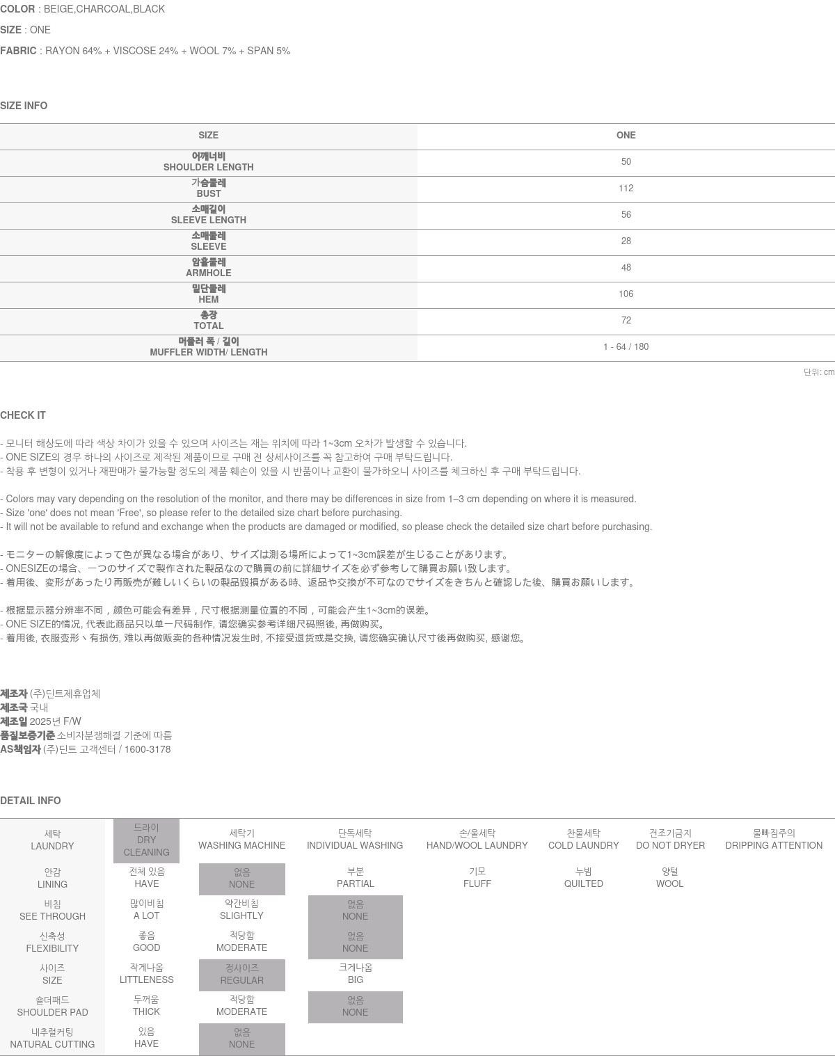 173CM 모델 ONE 사이즈, CHARCOAL 컬러 착용하였습니다.