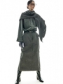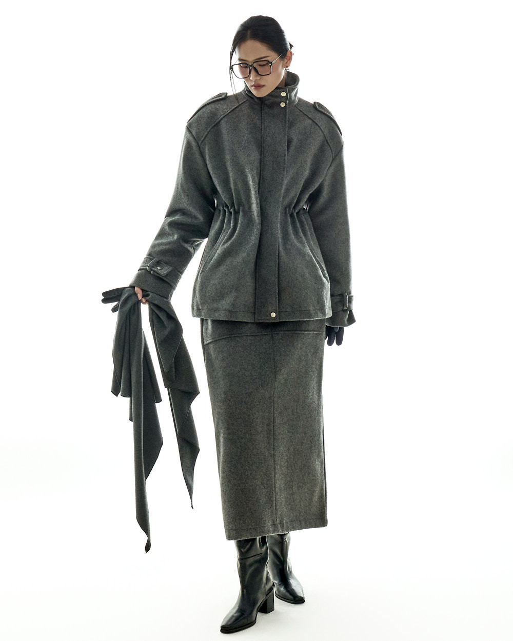 스커트는 H라인 실루엣에 전면 절개 라인과 백슬릿 디테일로