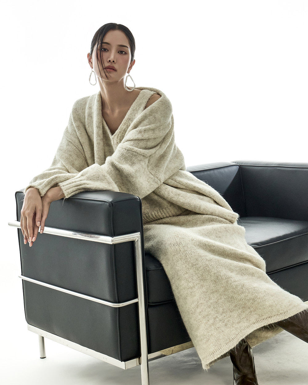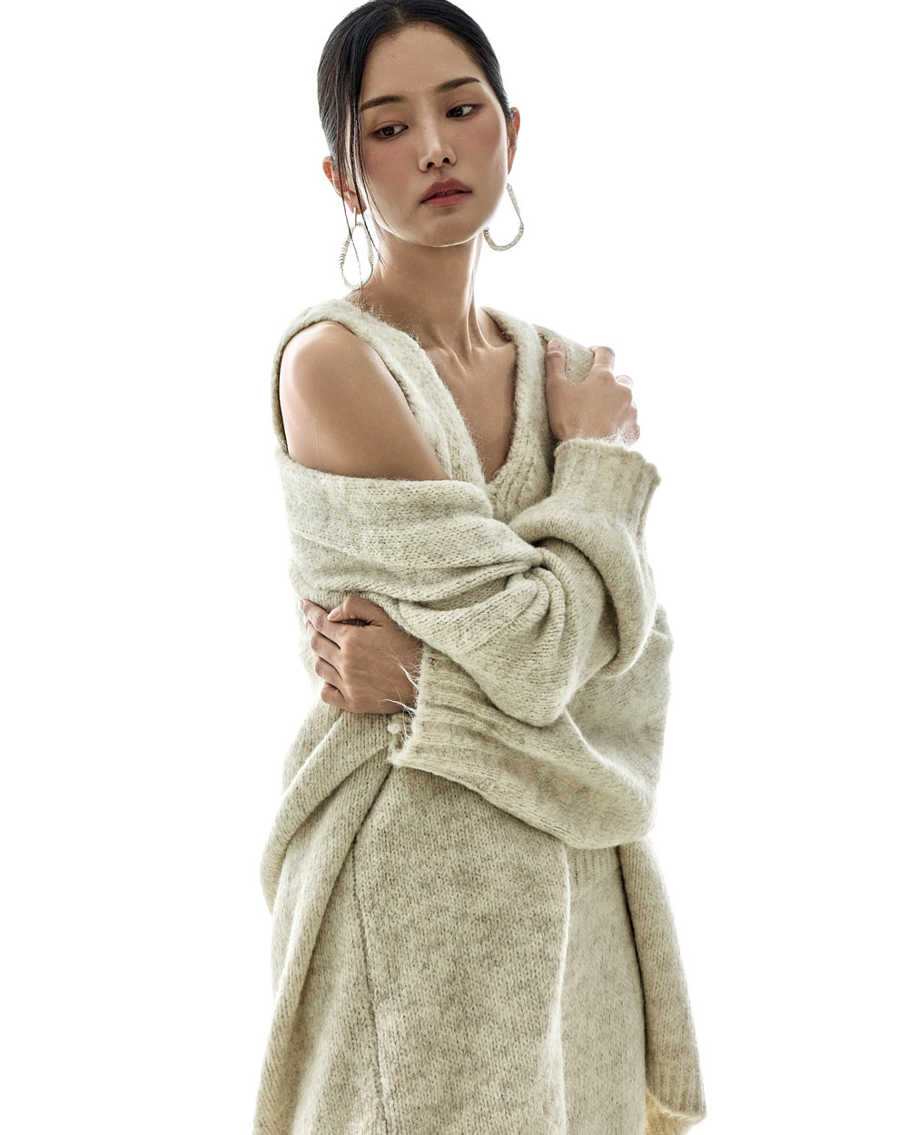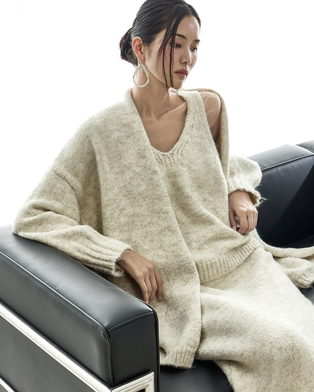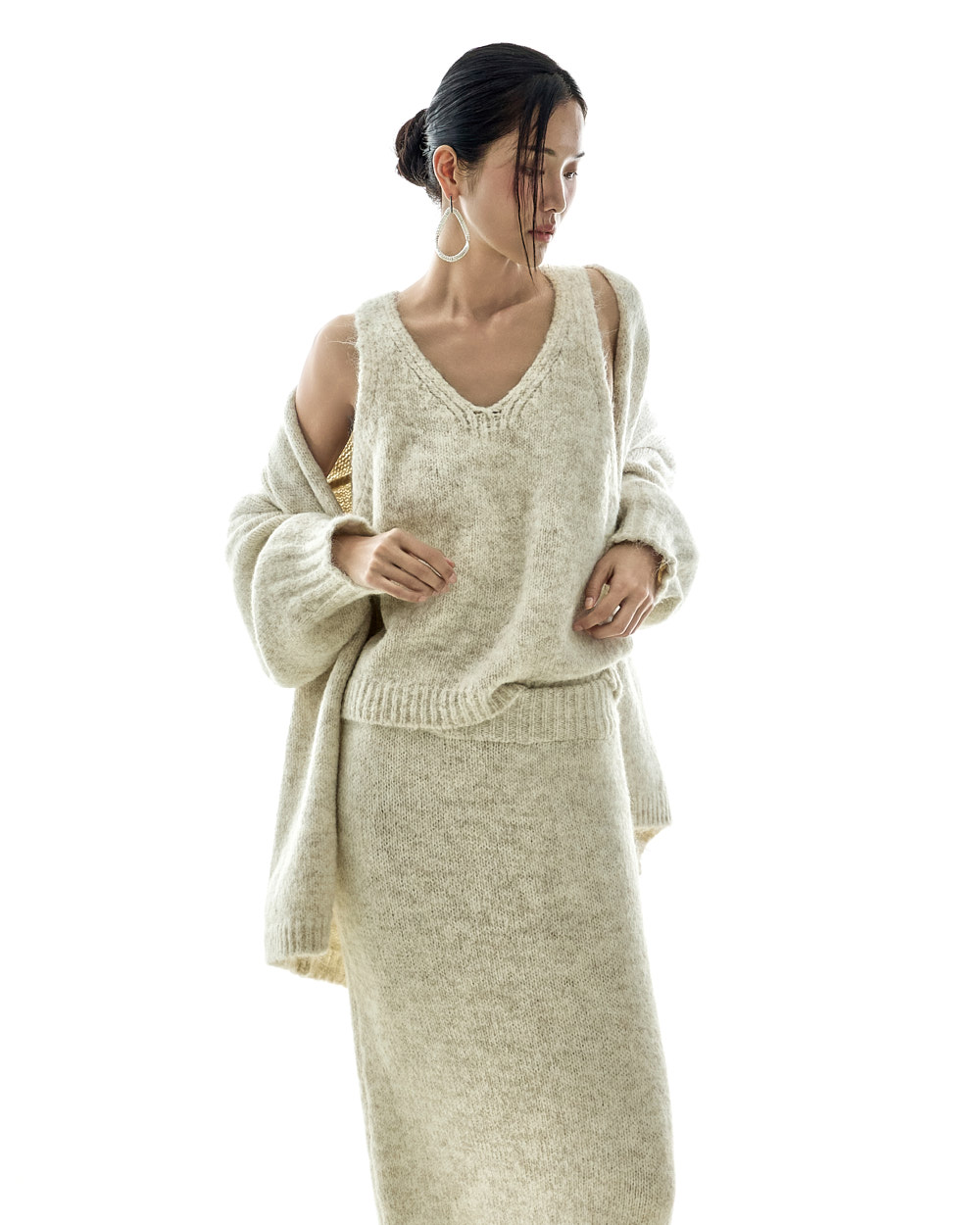 V 领无袖上衣与无扣开衫设计突出极简气质,