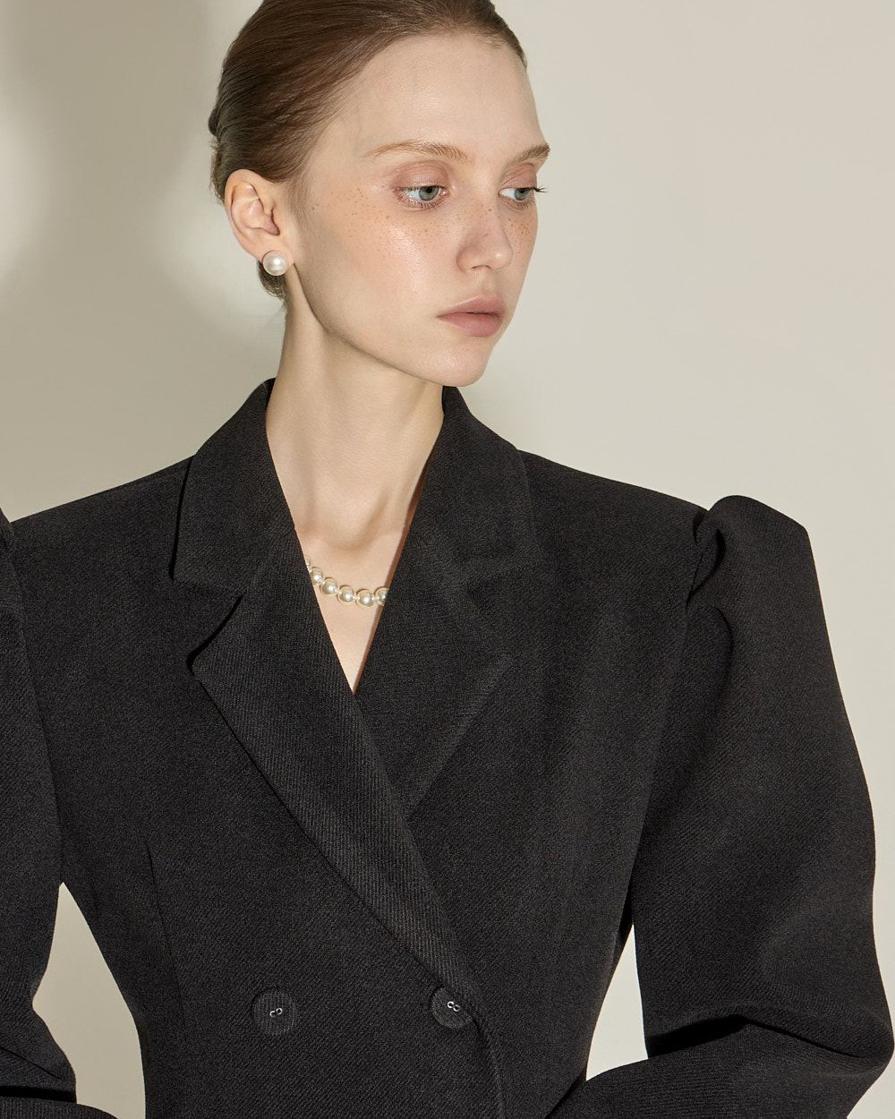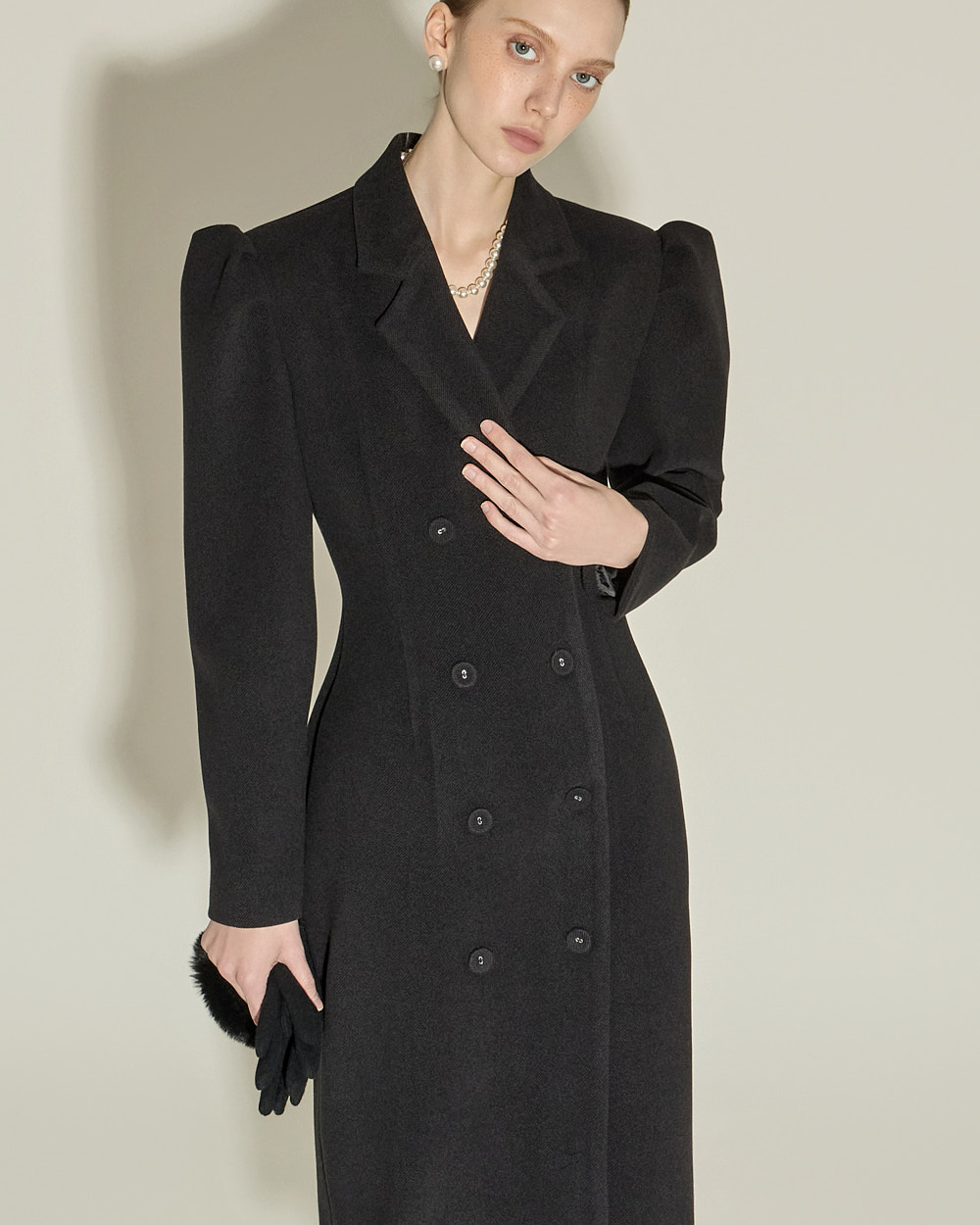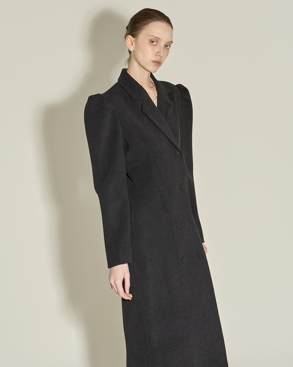 双排扣设计与肩部泡袖细节相互结合,