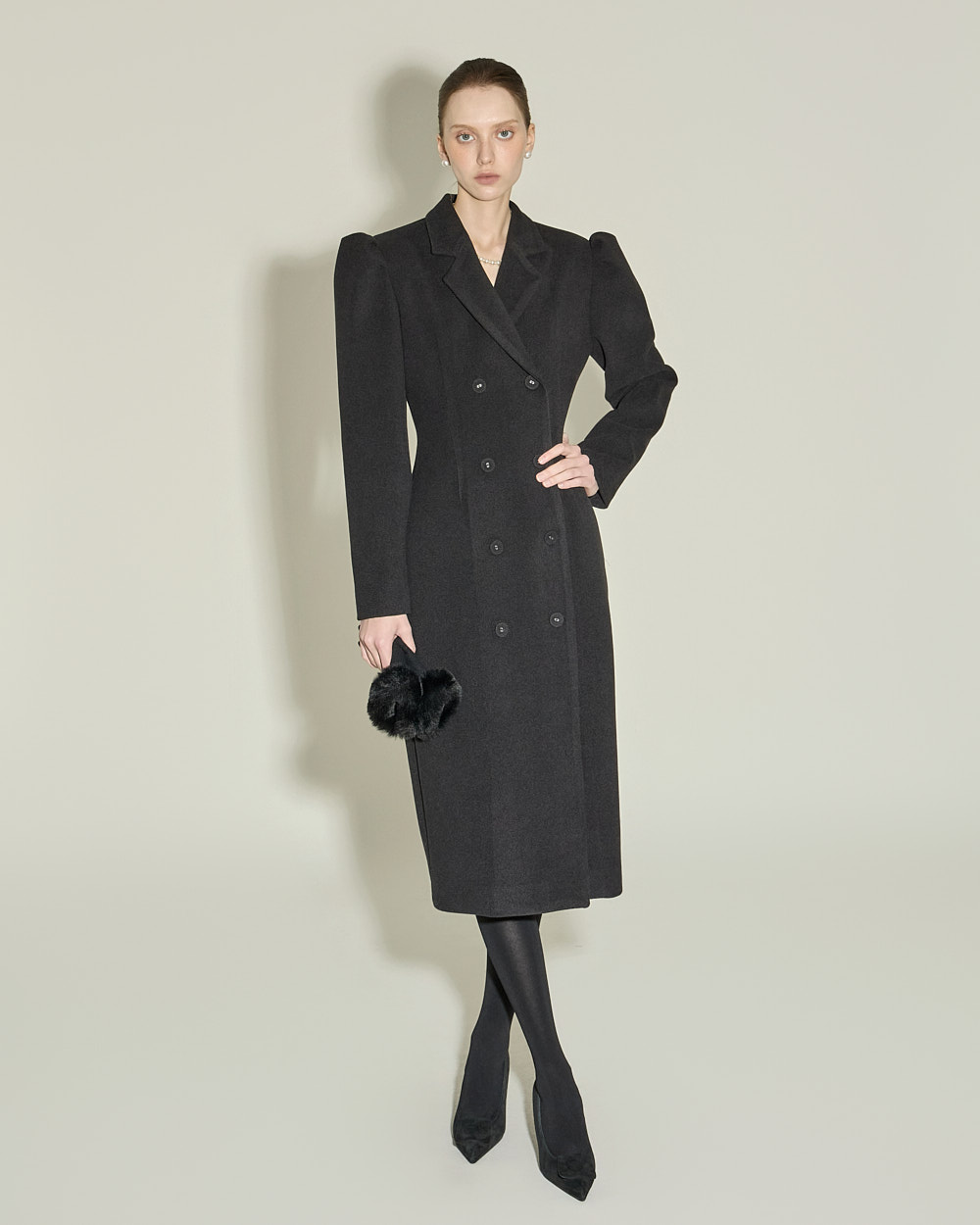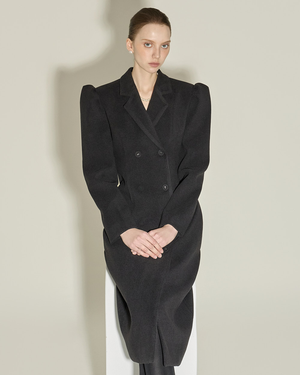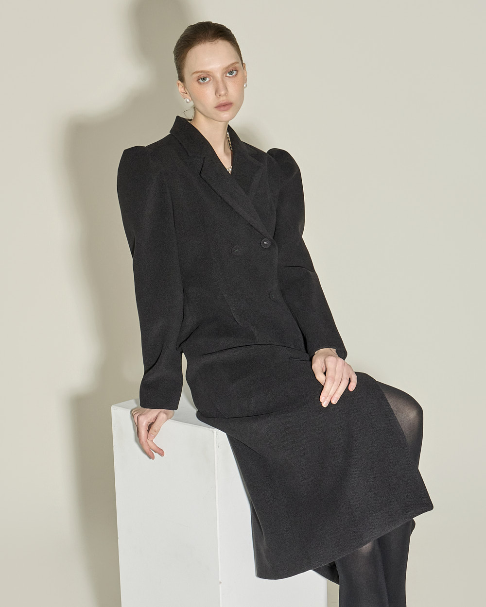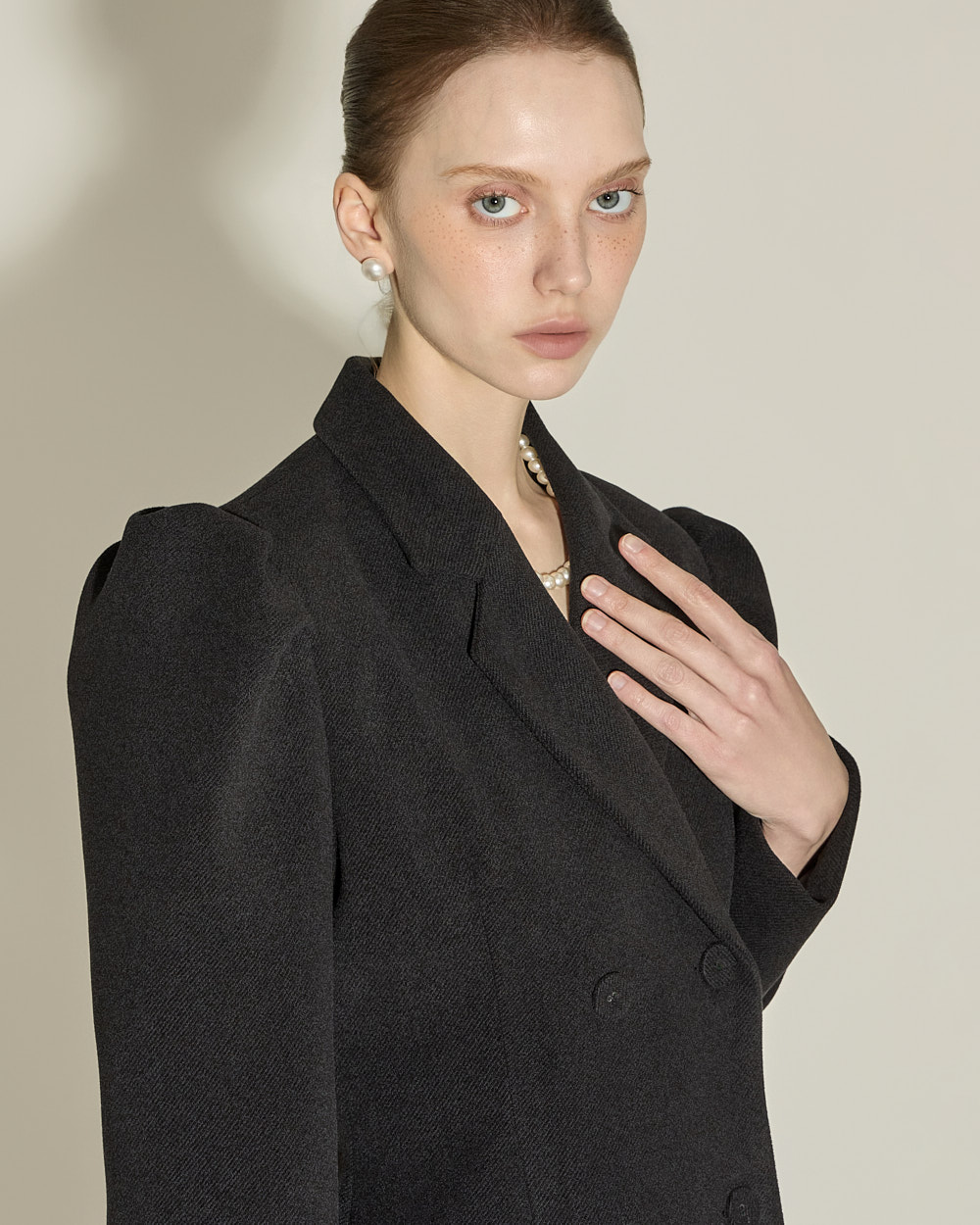 双排扣设计与肩部泡袖细节相互结合,