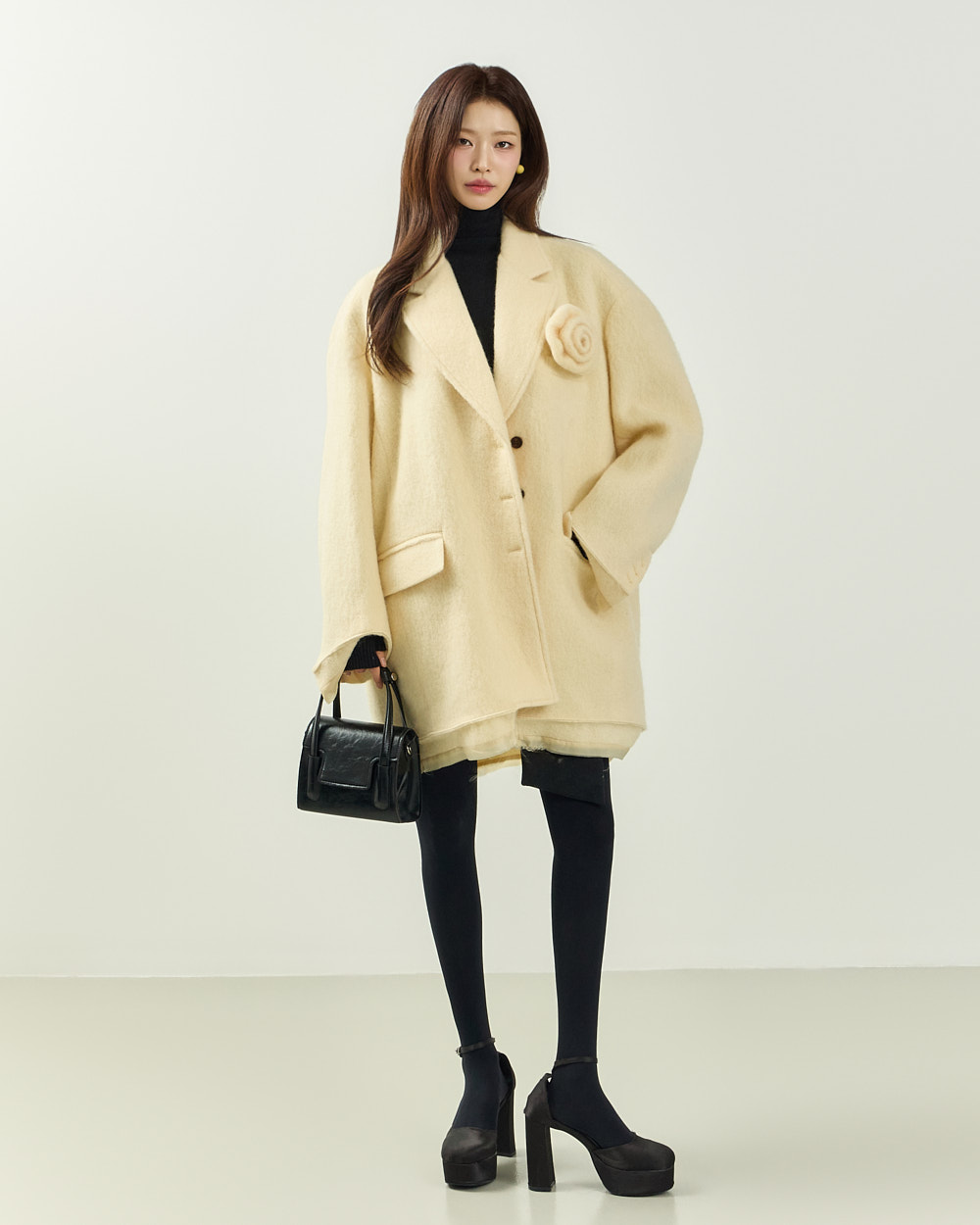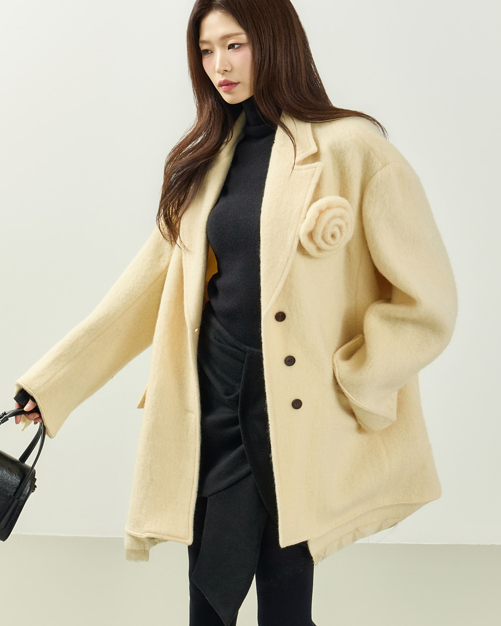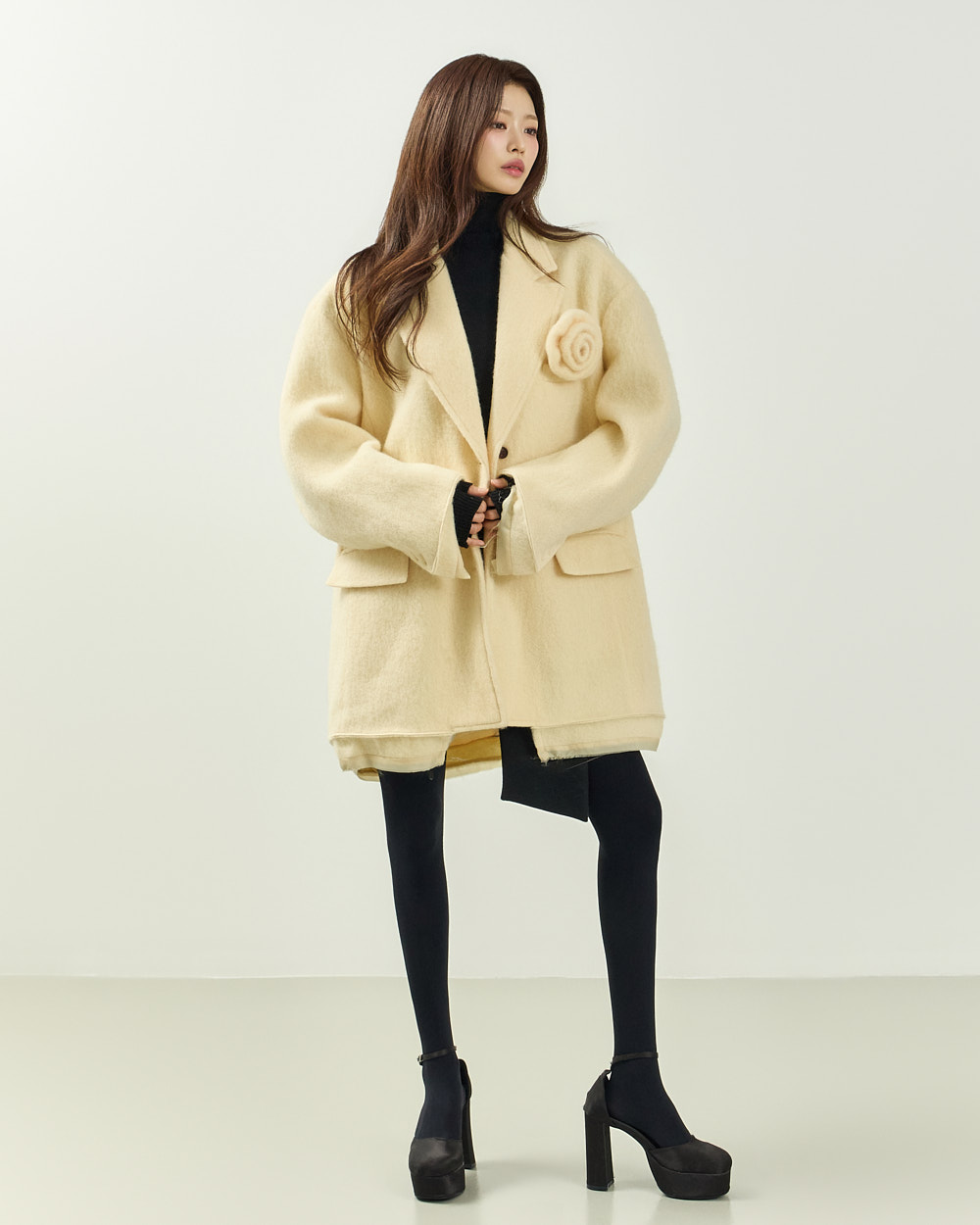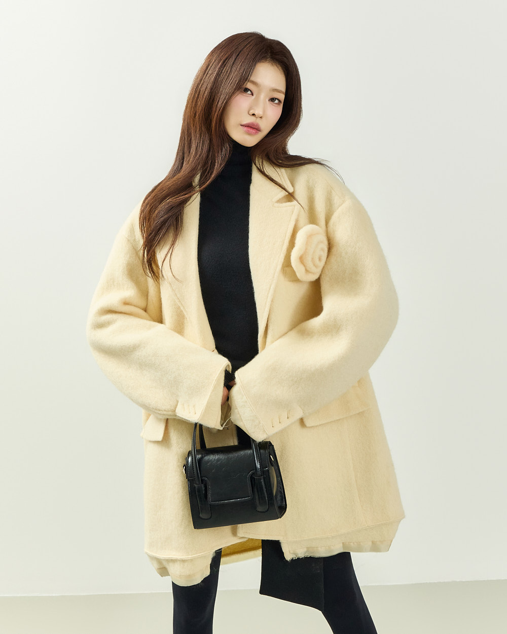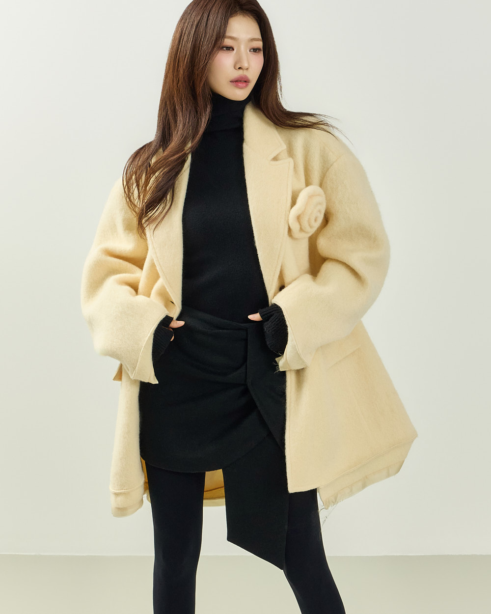 这是一款充满可爱氛围的胸花羊毛半大衣。