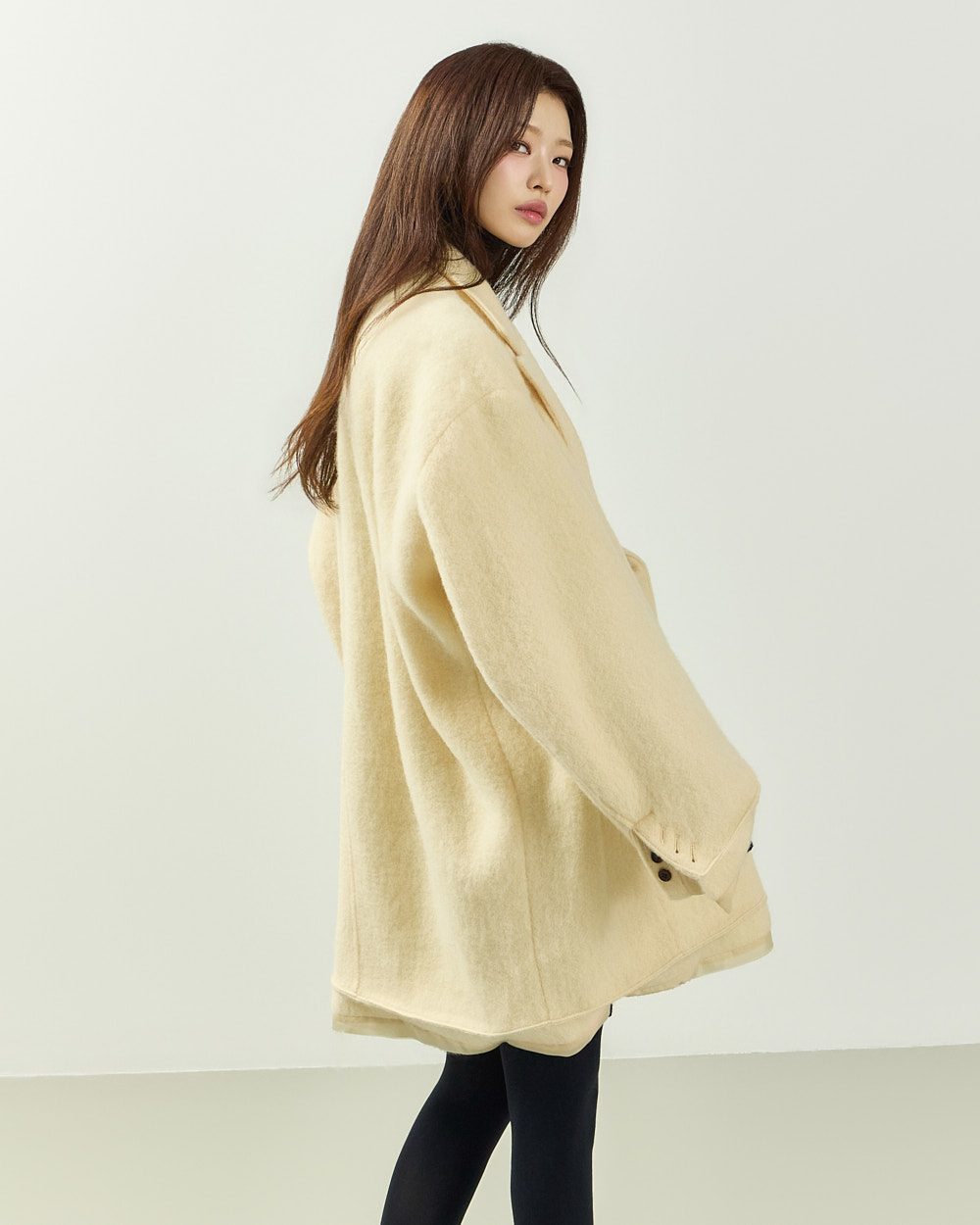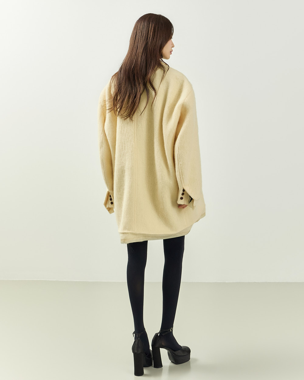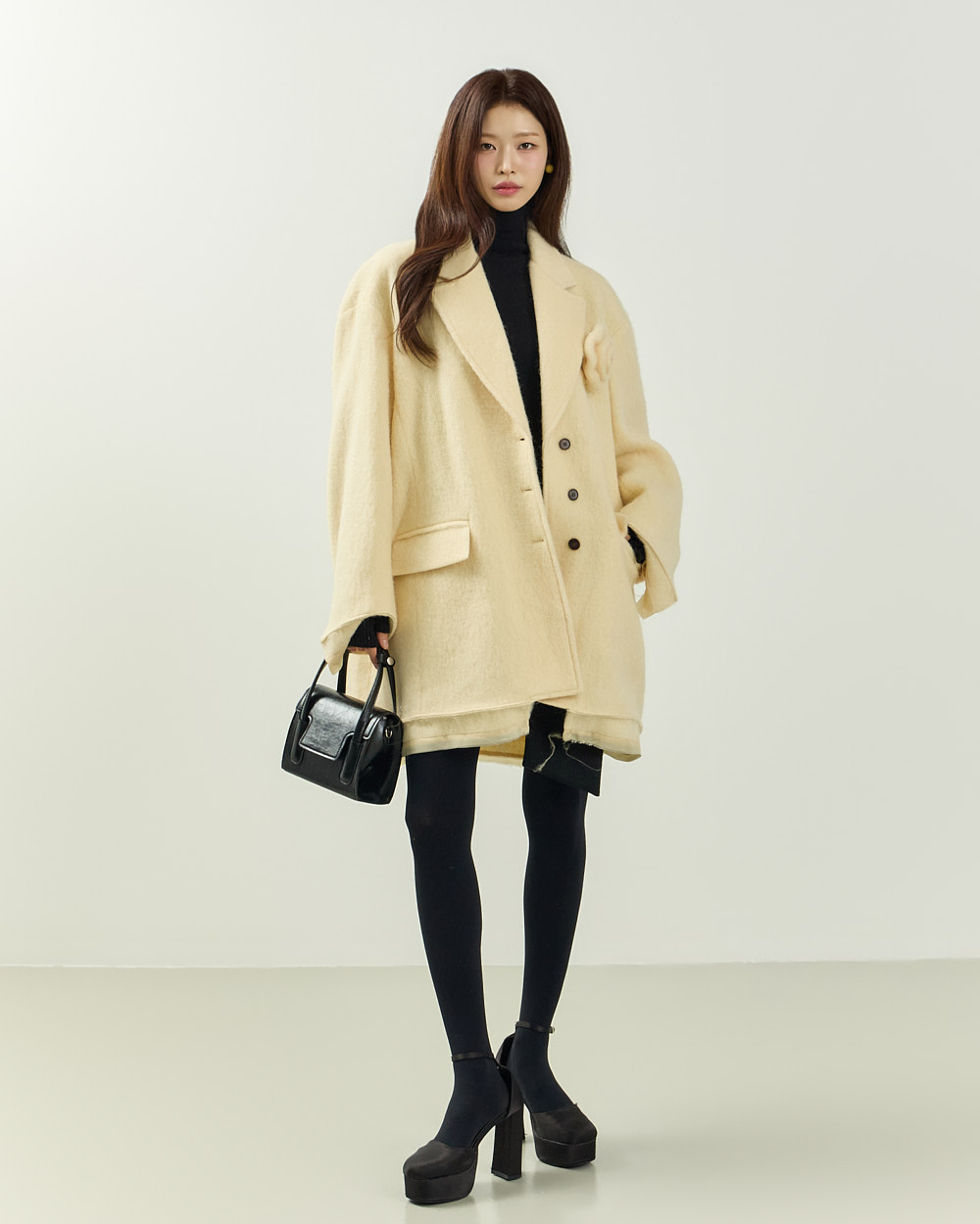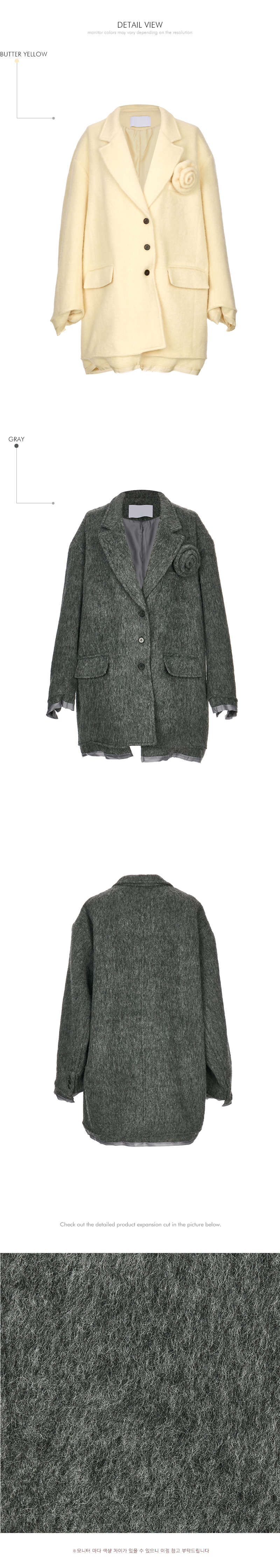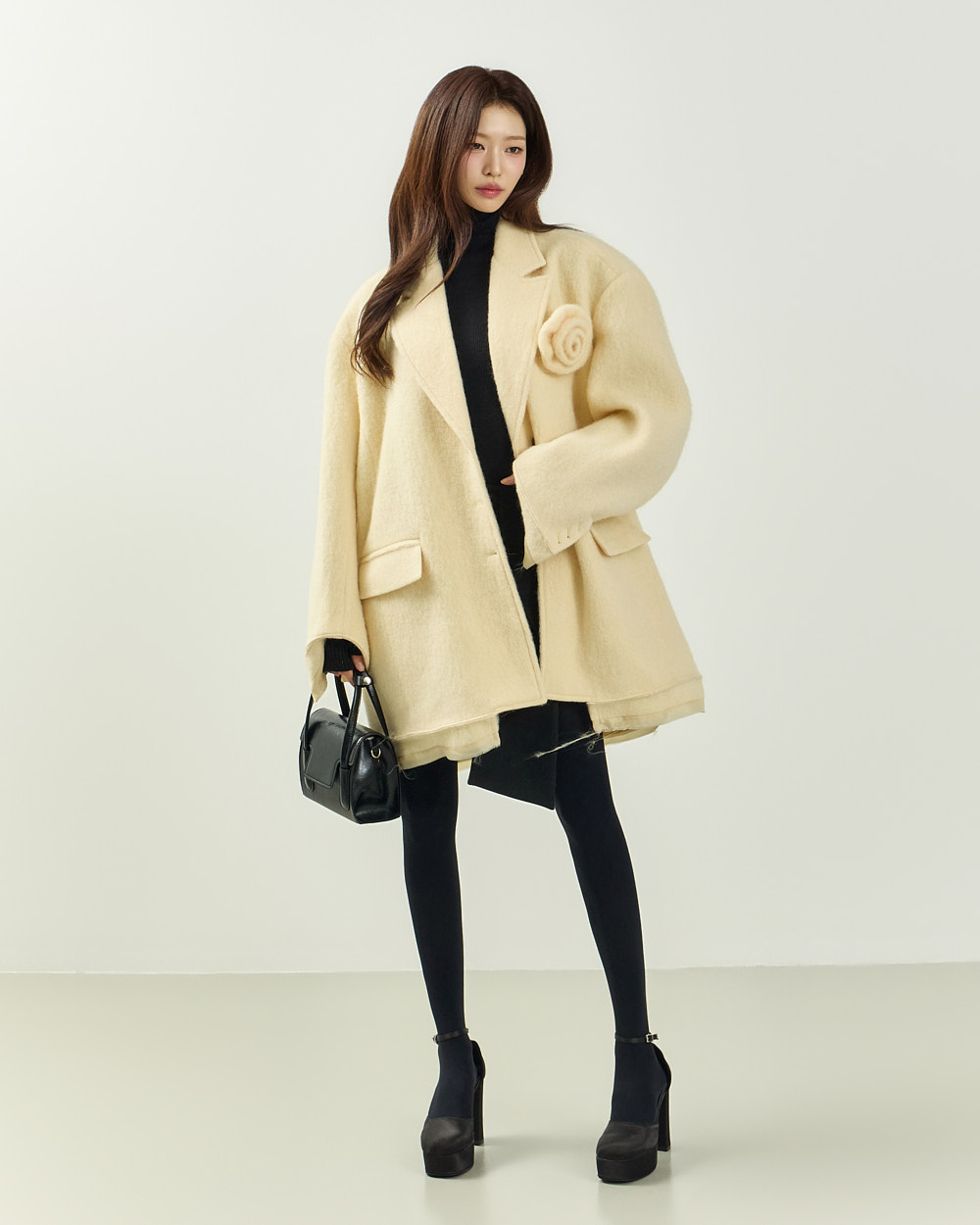 这是一款充满可爱氛围的胸花羊毛半大衣。