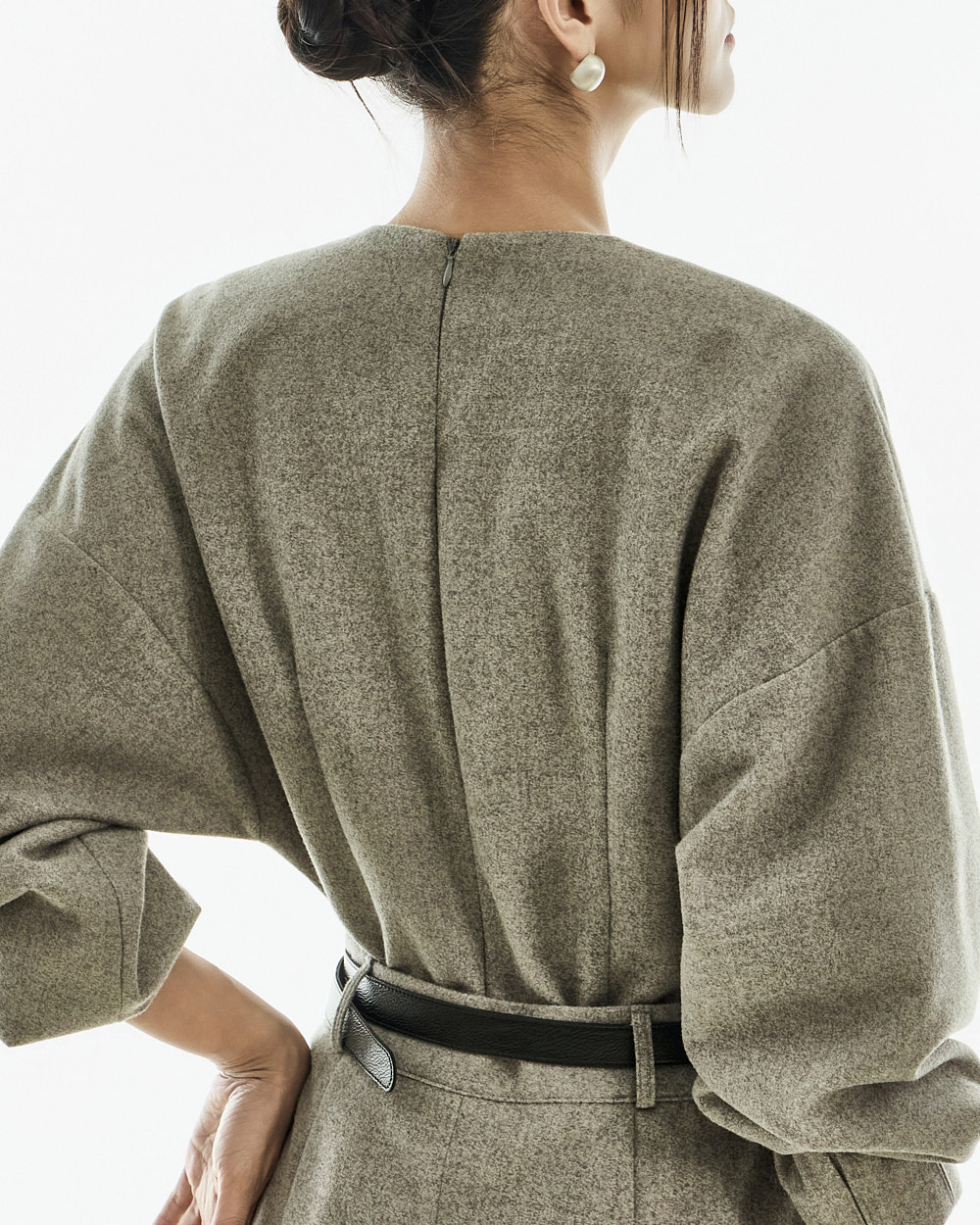 连衣裙以袖部打褶细节与后背拉链开合收尾,整体干净利落,