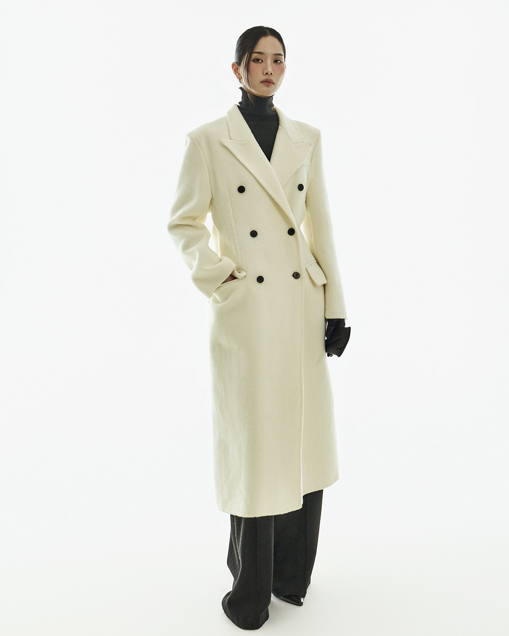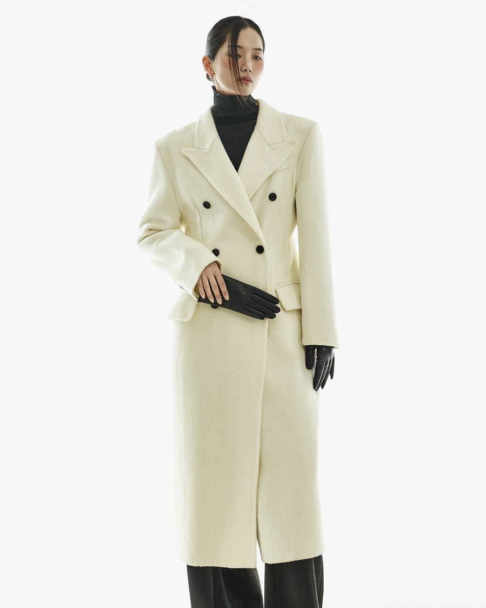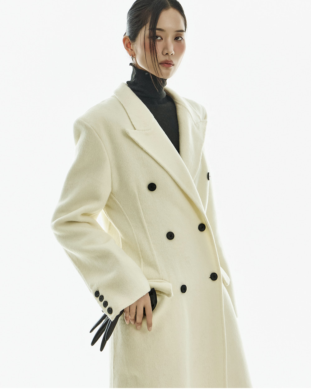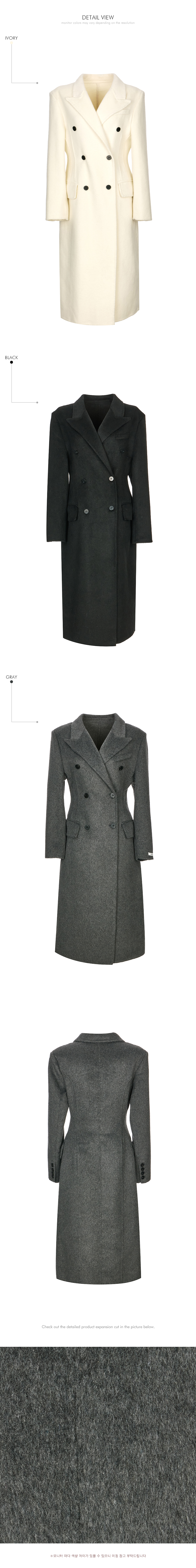 正式氛围的西装剪裁大衣。 以修身的腰线设计与经典版型呈现,从日常通勤的办公造型到正式场合都能干净利落地搭配使用的单品。 西装翻领与正面双排扣细节带来端正利落的印象,加长的衣身长度打造出稳重且高级的整体轮廓。 搭配肩垫与双侧口袋设计,提升实用性,采用羊毛材质制作,穿着温暖舒适,同时展现出高级质感,提供 S、M 两个尺码选择的商品。 173CM 模特穿着 S 尺码,IVORY 颜色。