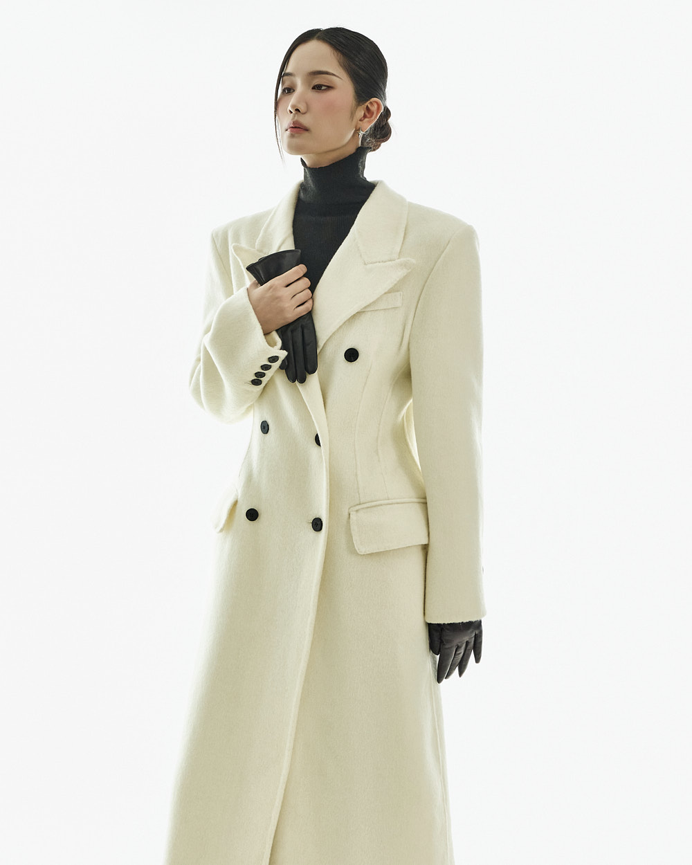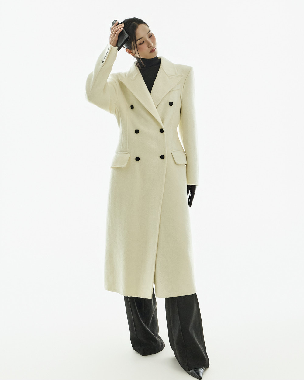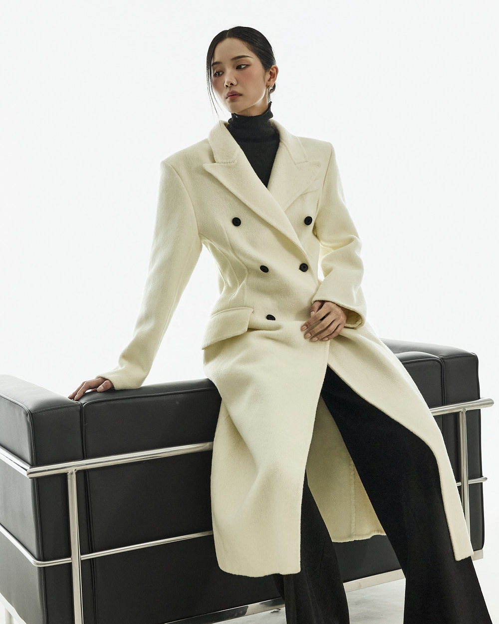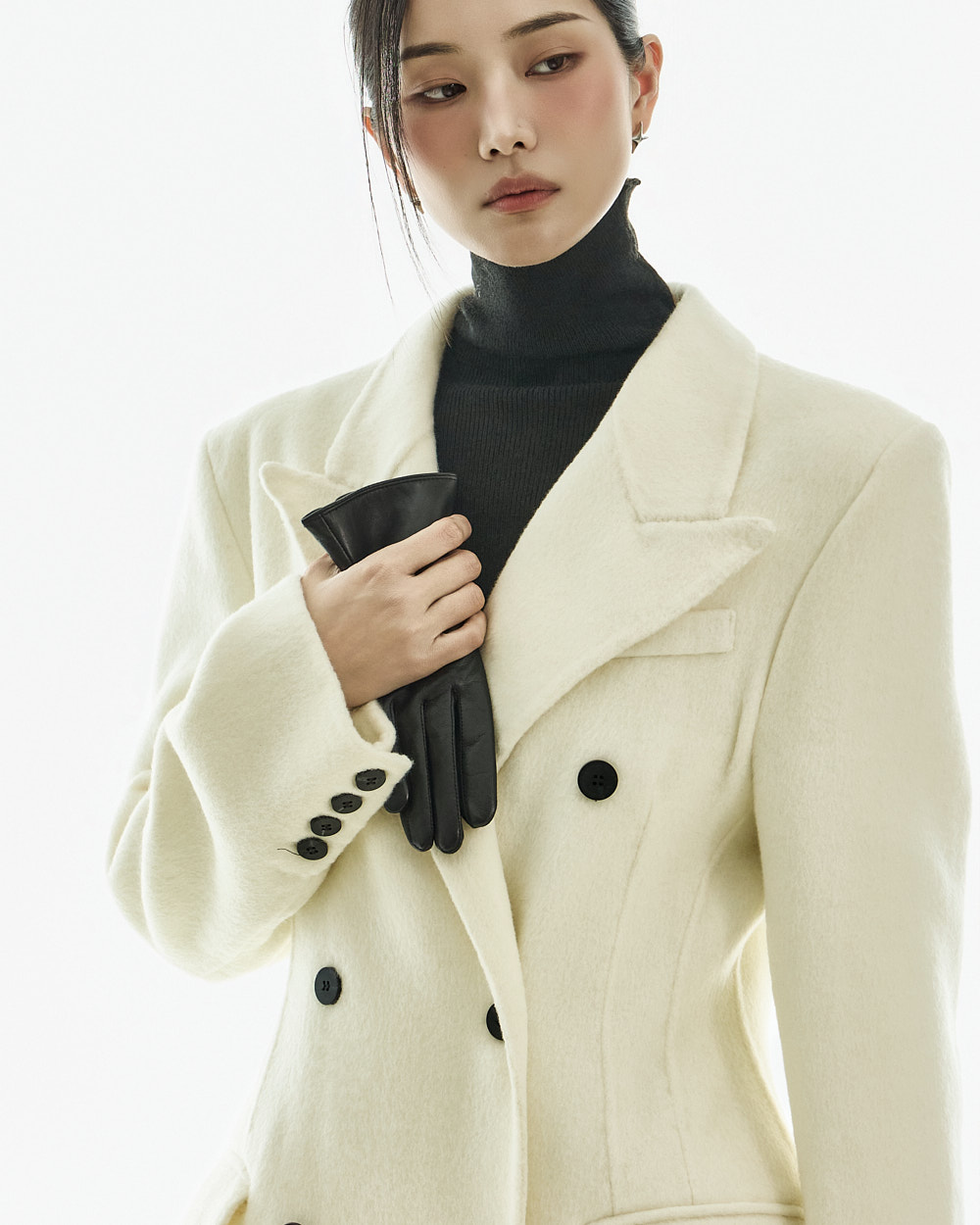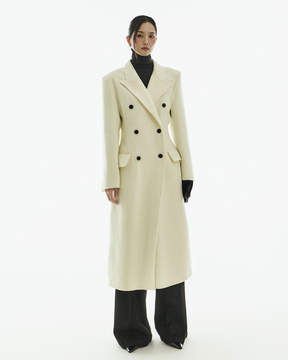 正式氛围的西装剪裁大衣。 以修身的腰线设计与经典版型呈现,从日常通勤的办公造型到正式场合都能干净利落地搭配使用的单品。 西装翻领与正面双排扣细节带来端正利落的印象,加长的衣身长度打造出稳重且高级的整体轮廓。 搭配肩垫与双侧口袋设计,提升实用性,采用羊毛材质制作,穿着温暖舒适,同时展现出高级质感,提供 S、M 两个尺码选择的商品。 173CM 模特穿着 S 尺码,IVORY 颜色。