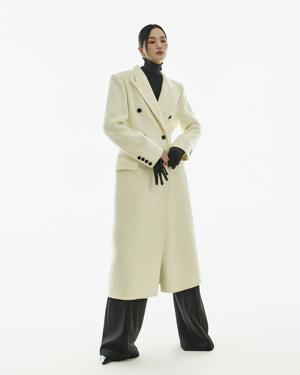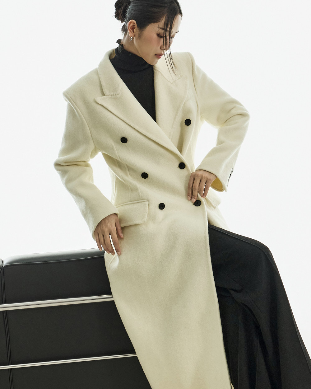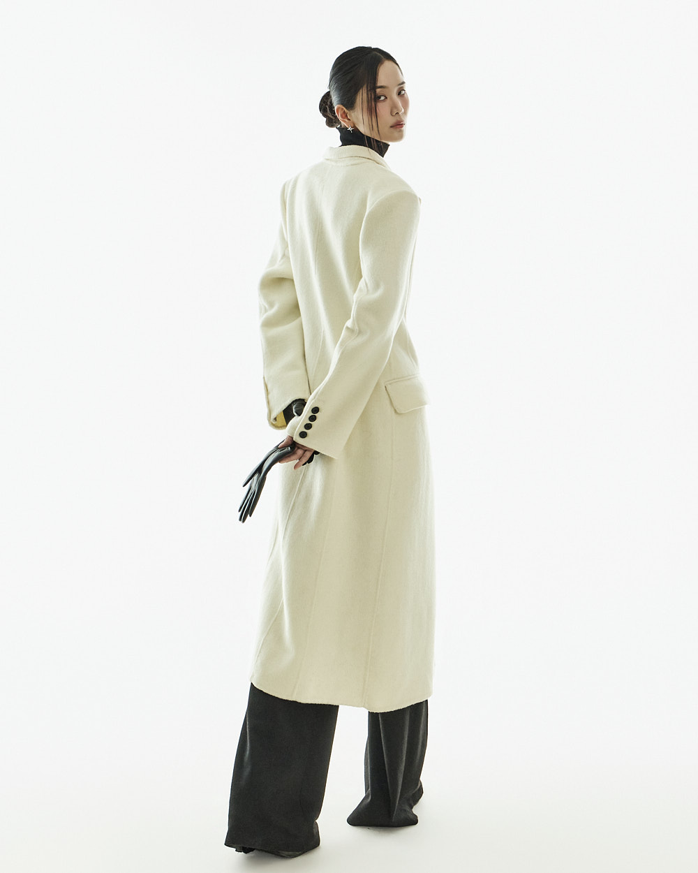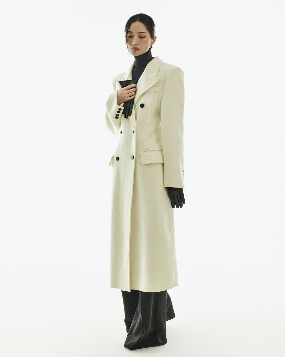 正式氛围的西装剪裁大衣。 以修身的腰线设计与经典版型呈现,从日常通勤的办公造型到正式场合都能干净利落地搭配使用的单品。 西装翻领与正面双排扣细节带来端正利落的印象,加长的衣身长度打造出稳重且高级的整体轮廓。 搭配肩垫与双侧口袋设计,提升实用性,采用羊毛材质制作,穿着温暖舒适,同时展现出高级质感,提供 S、M 两个尺码选择的商品。 173CM 模特穿着 S 尺码,IVORY 颜色。