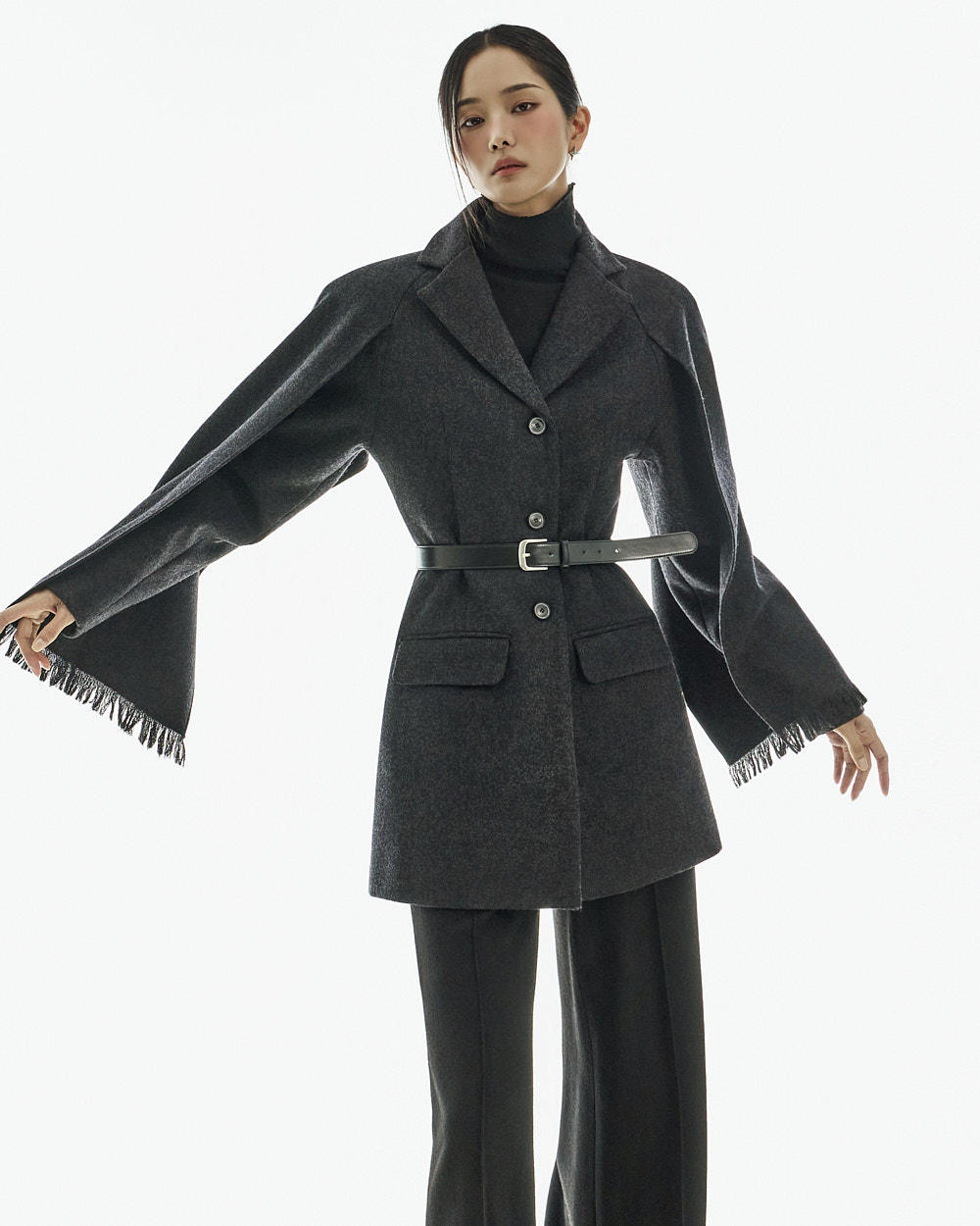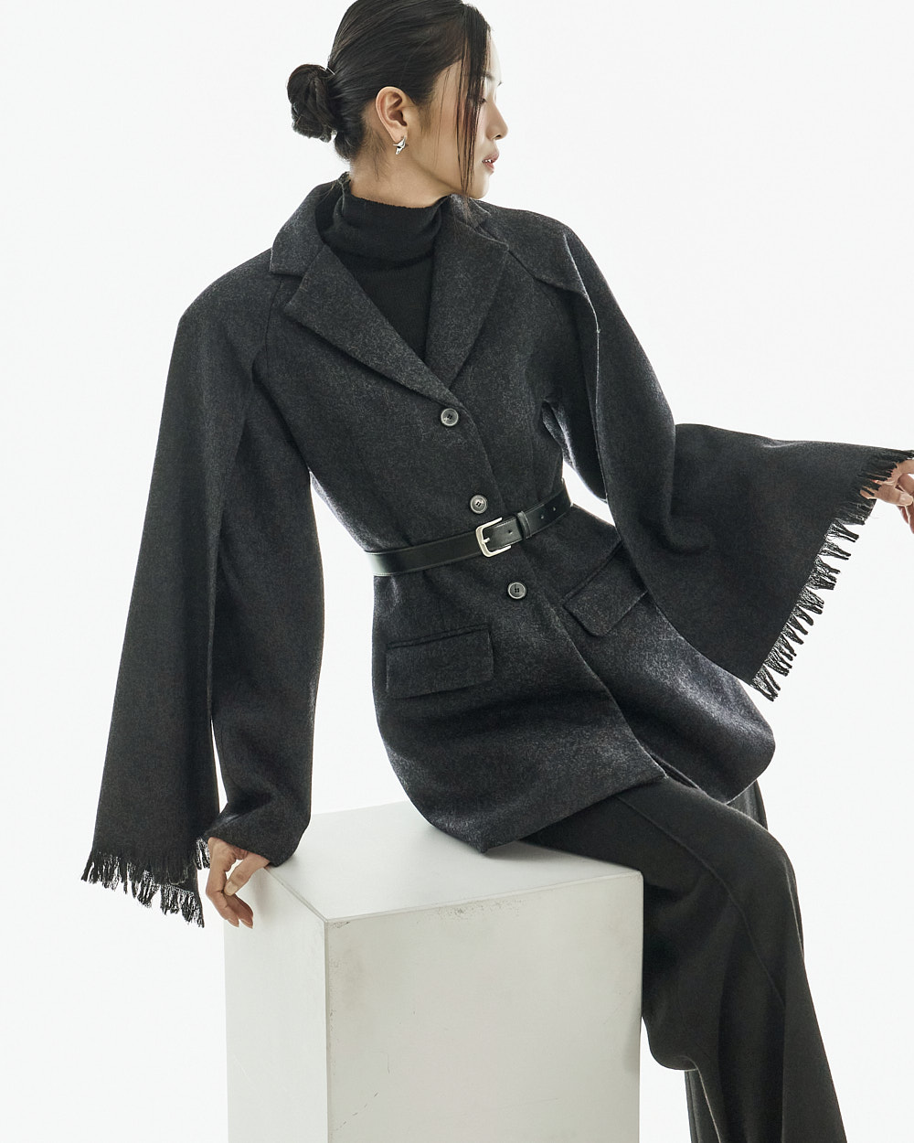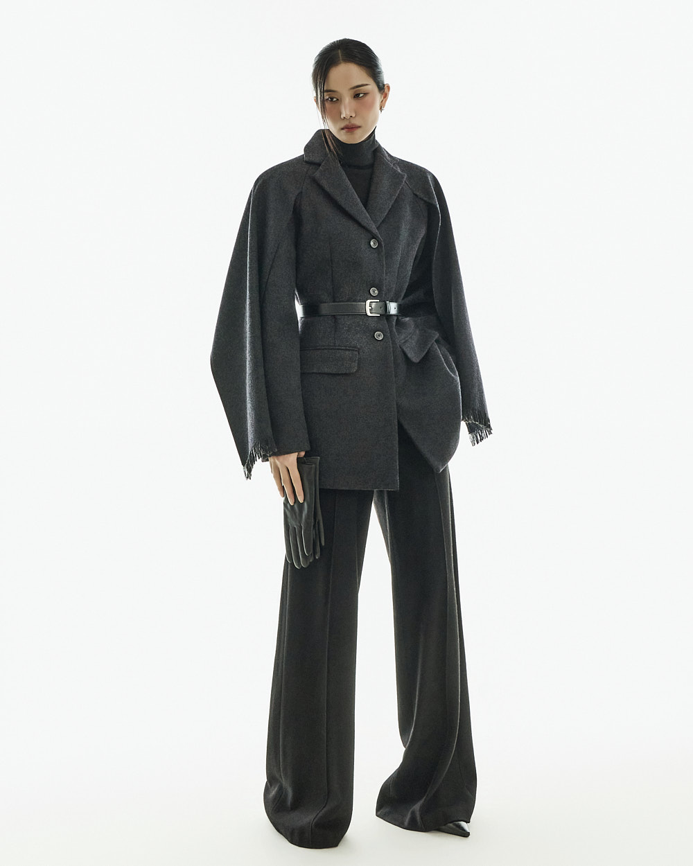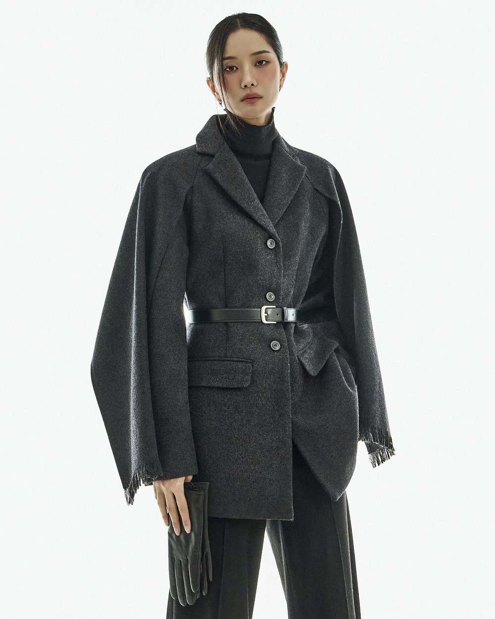 配套腰带可调整轮廓,既可作为外套穿搭,也可单穿如连衣裙般造型,实用性极高。