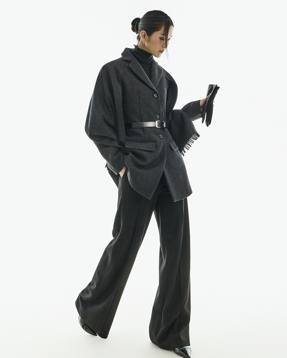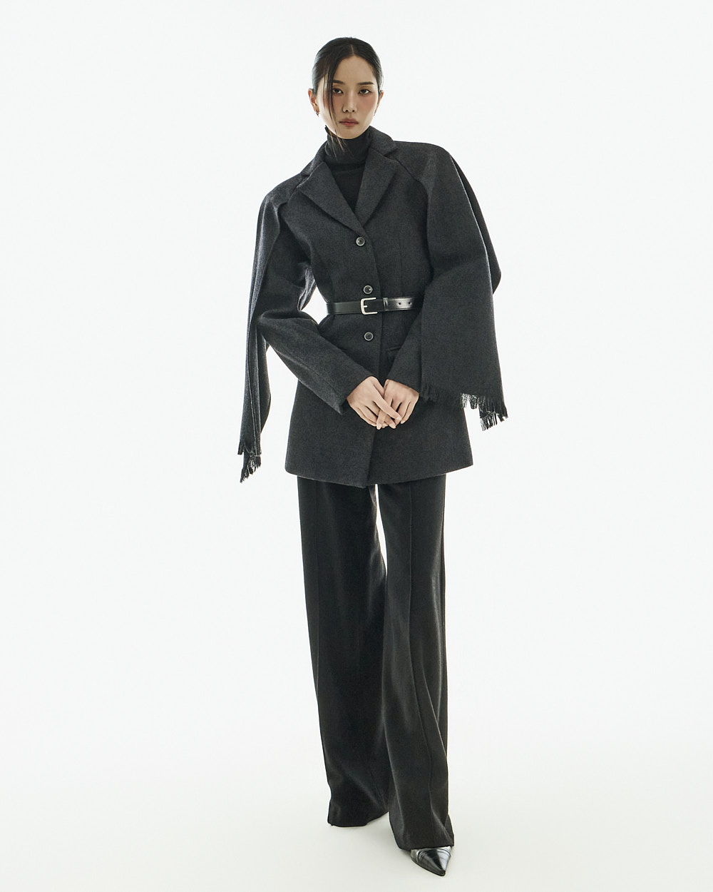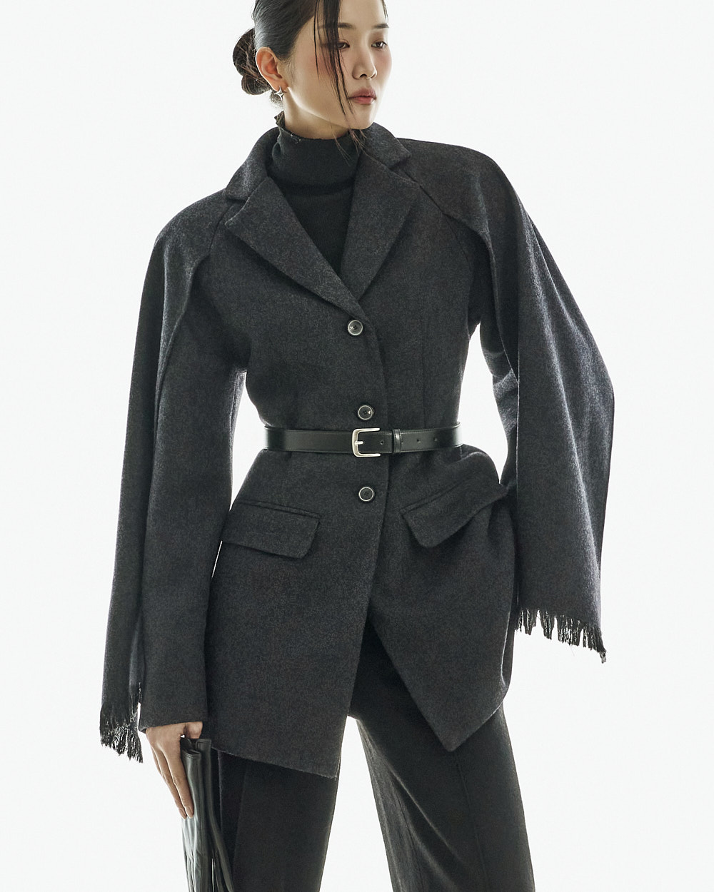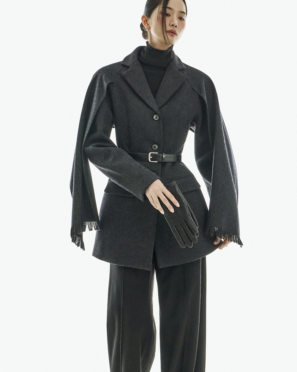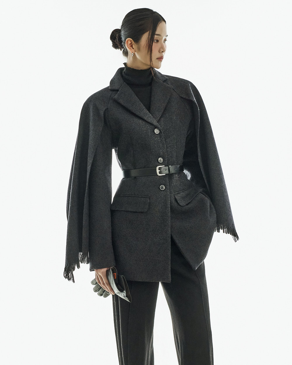 配套腰带可调整轮廓,既可作为外套穿搭,也可单穿如连衣裙般造型,实用性极高。