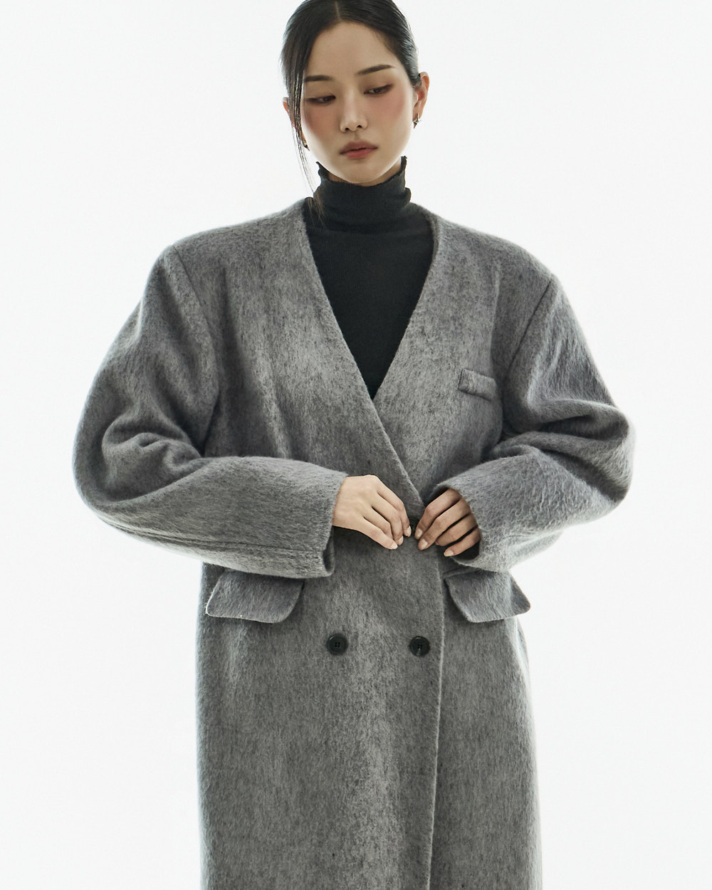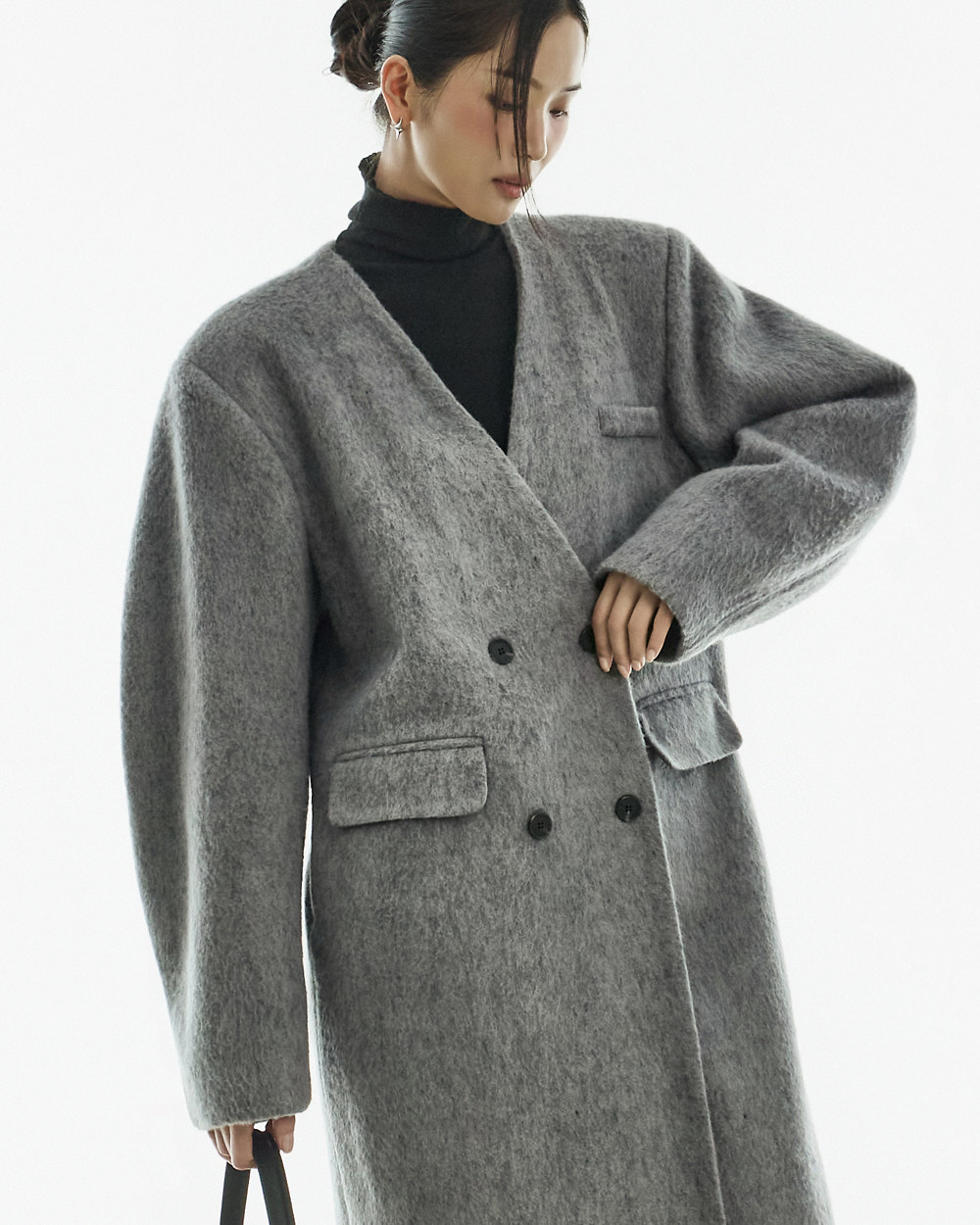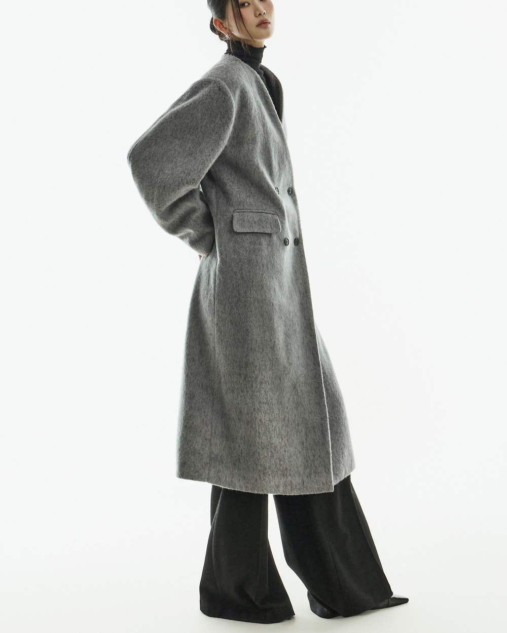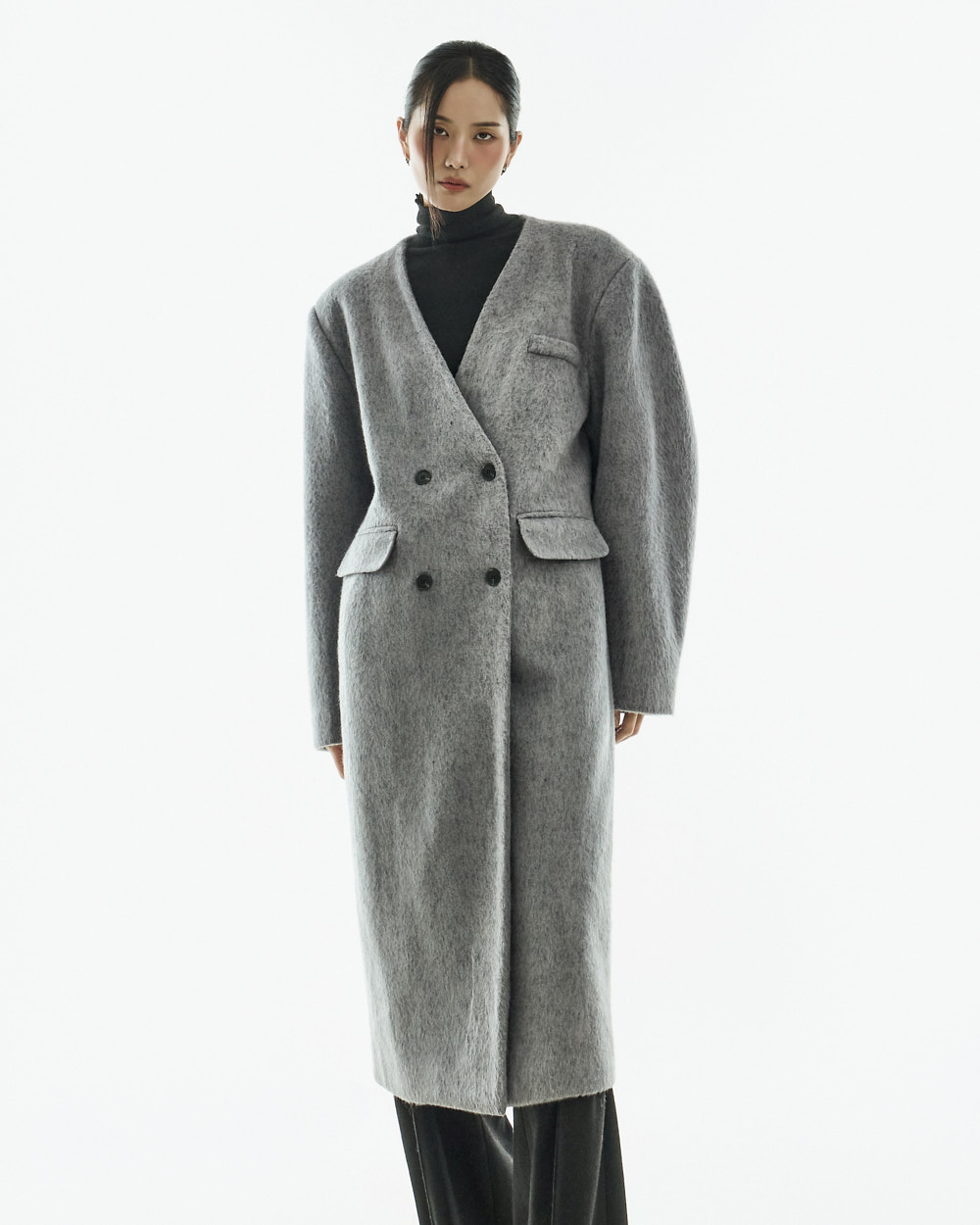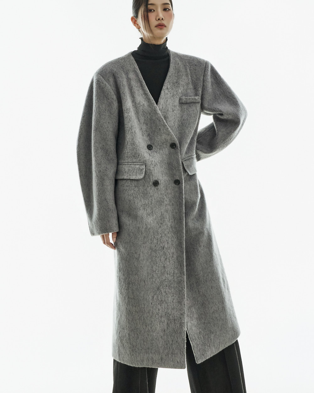 极简氛围的无领双排扣大衣。
