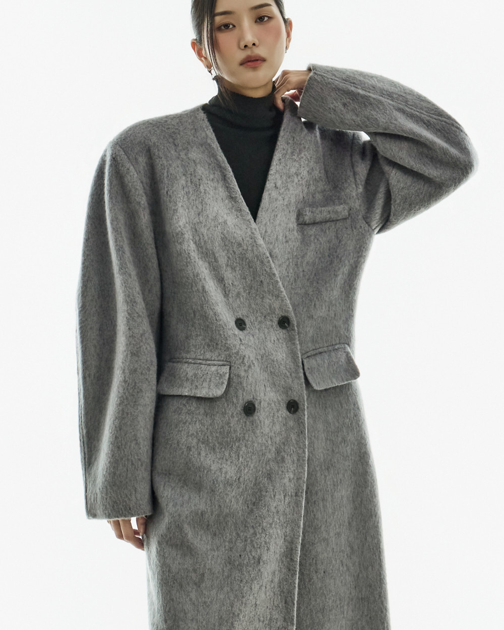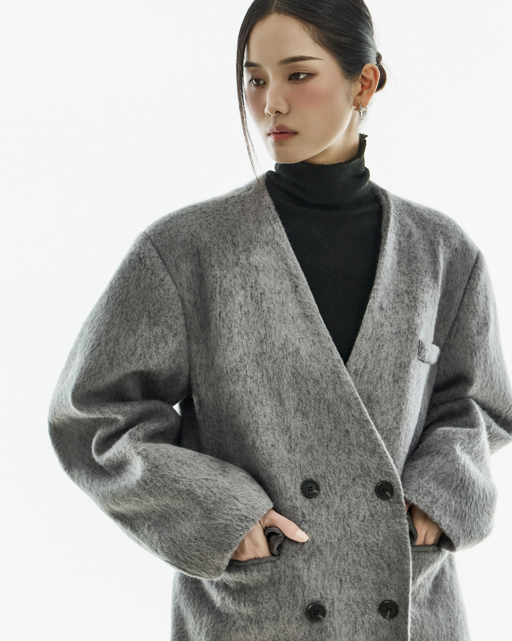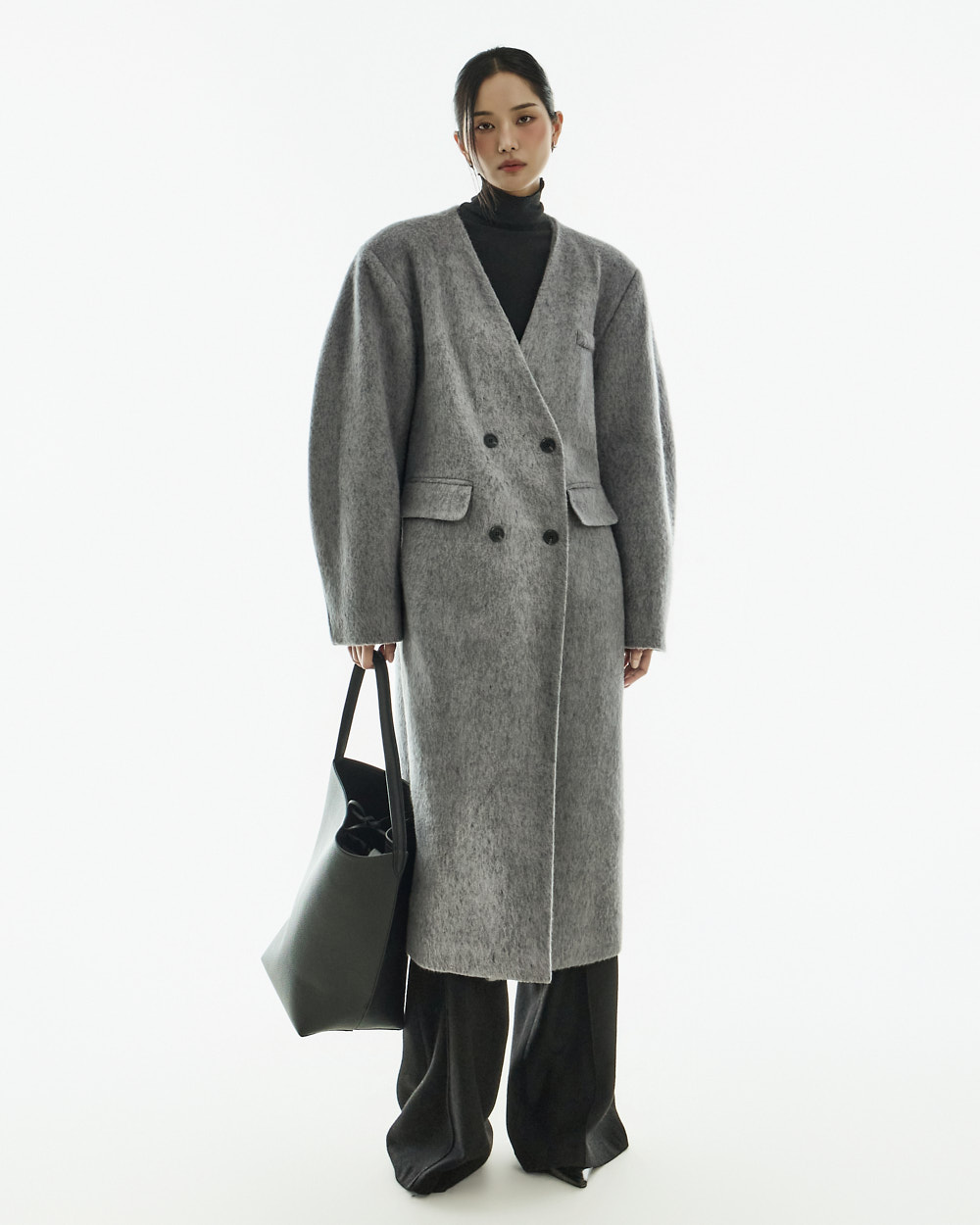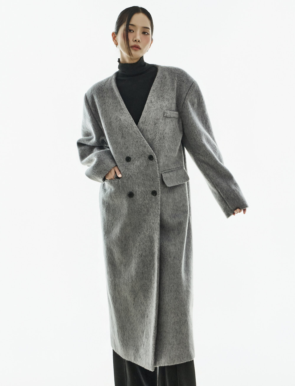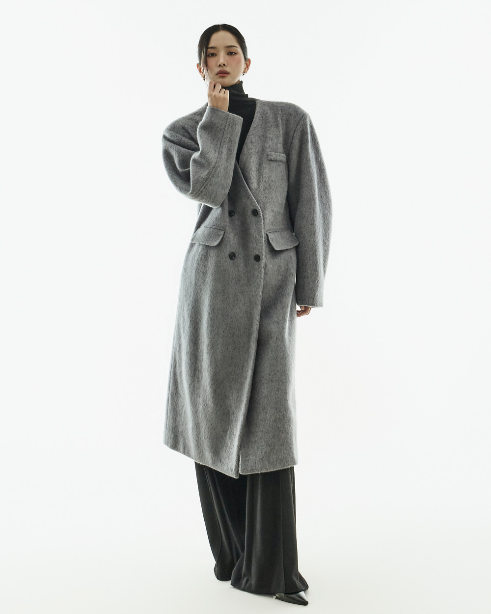 极简氛围的无领双排扣大衣。