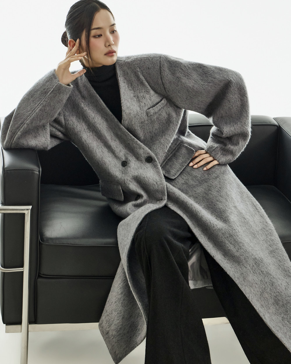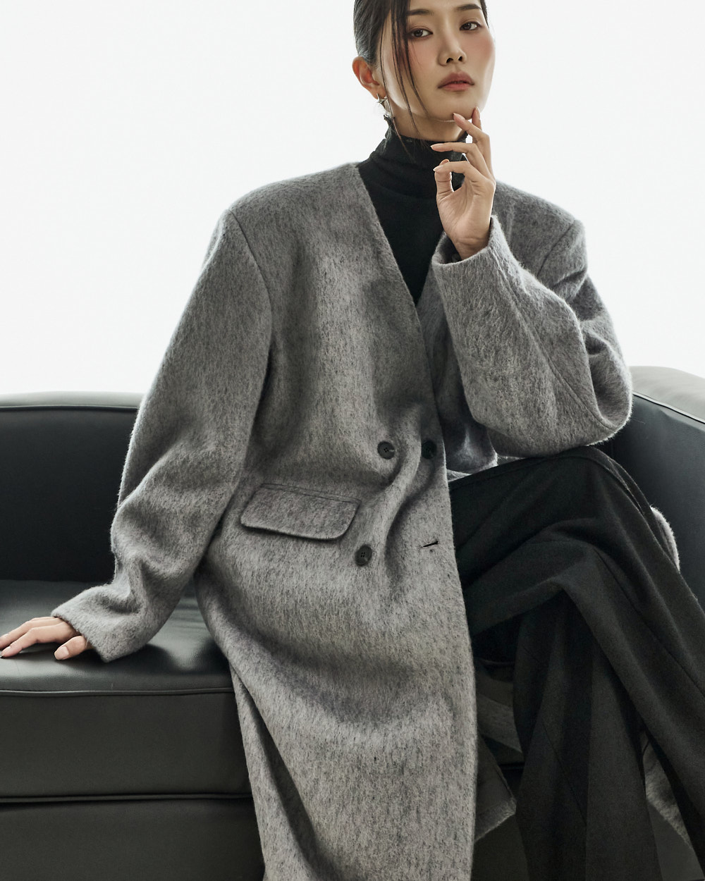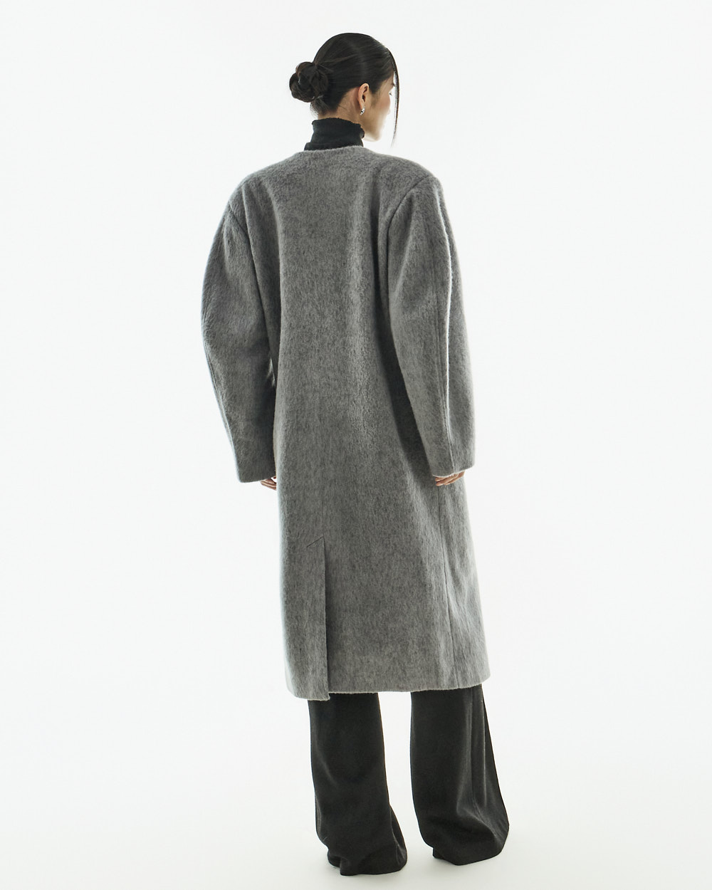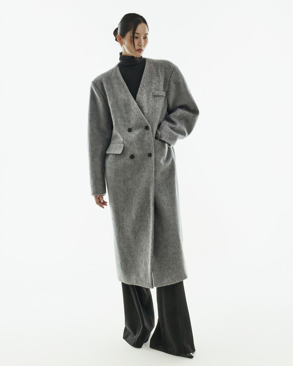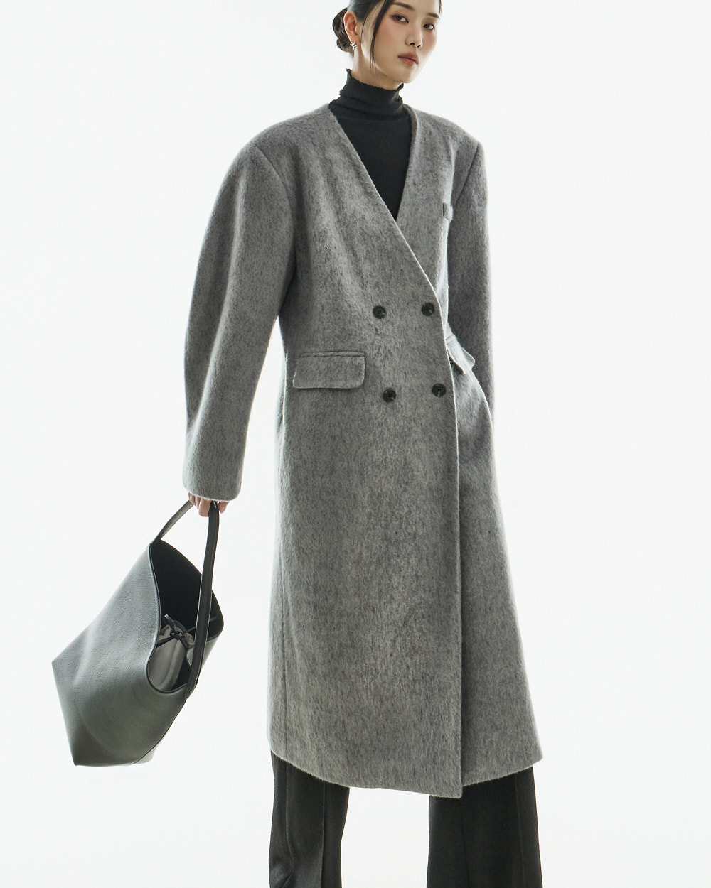 极简氛围的无领双排扣大衣。