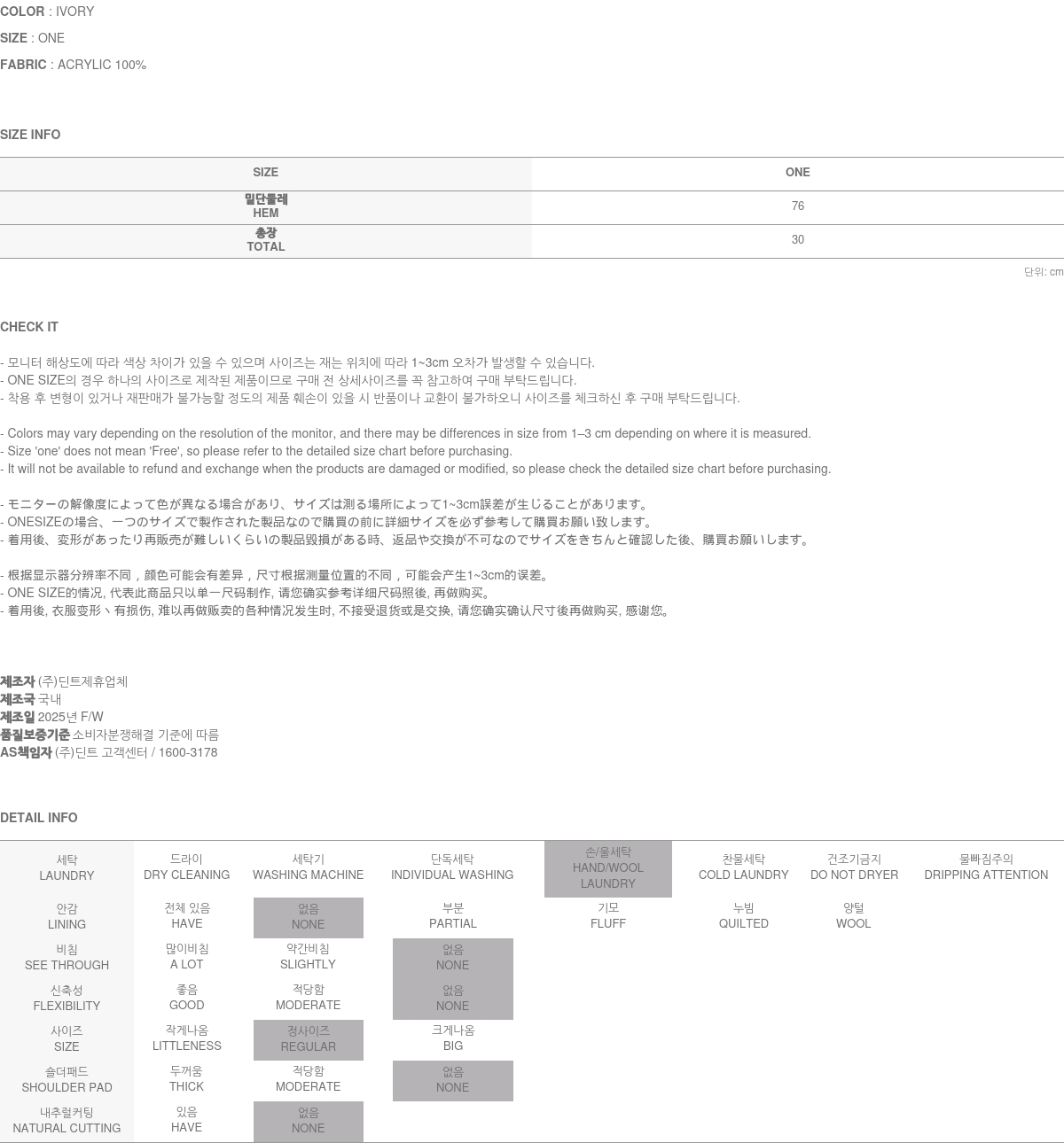 171CM 模特穿着 ONE 尺码,IVORY 颜色。