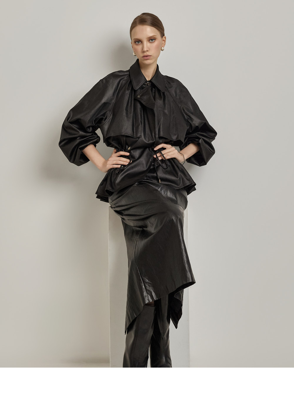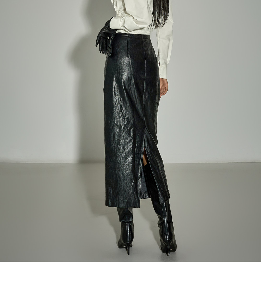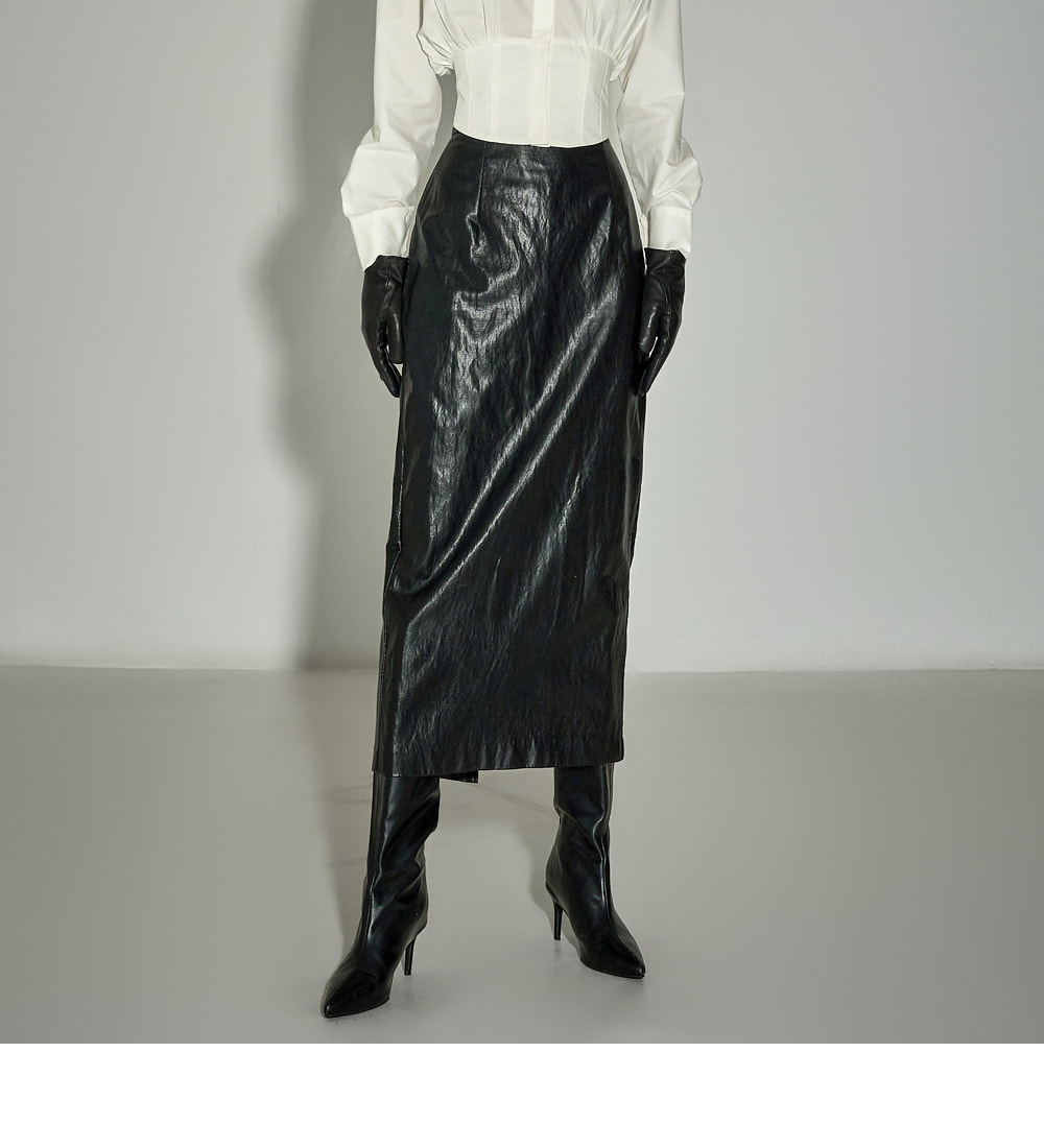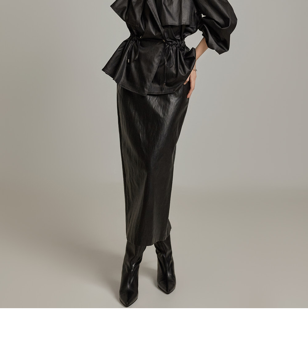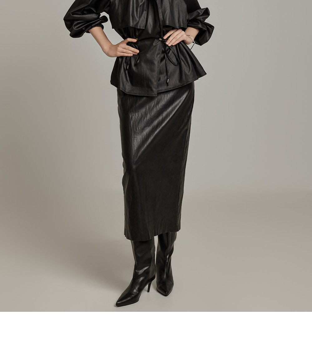 这是一款散发独特气质的皮革半身裙。 采用触感柔软的聚酯纤维面料,并与粘纤、钢丝纱混纺制作,提供S、M两种尺码,可根据体型选择合适款式。 后背拉链设计,方便穿脱,内衬设计带来舒适穿着感。 中长款H型裙型展现女性优雅气质,后背开衩便于活动,全皮革质感与光泽面料让造型精致,即使单穿也足够出彩。 可与多种上衣轻松搭配,简约设计便于造型,推荐给DINT的客户们。 模特身高174CM,穿S码,黑色款。