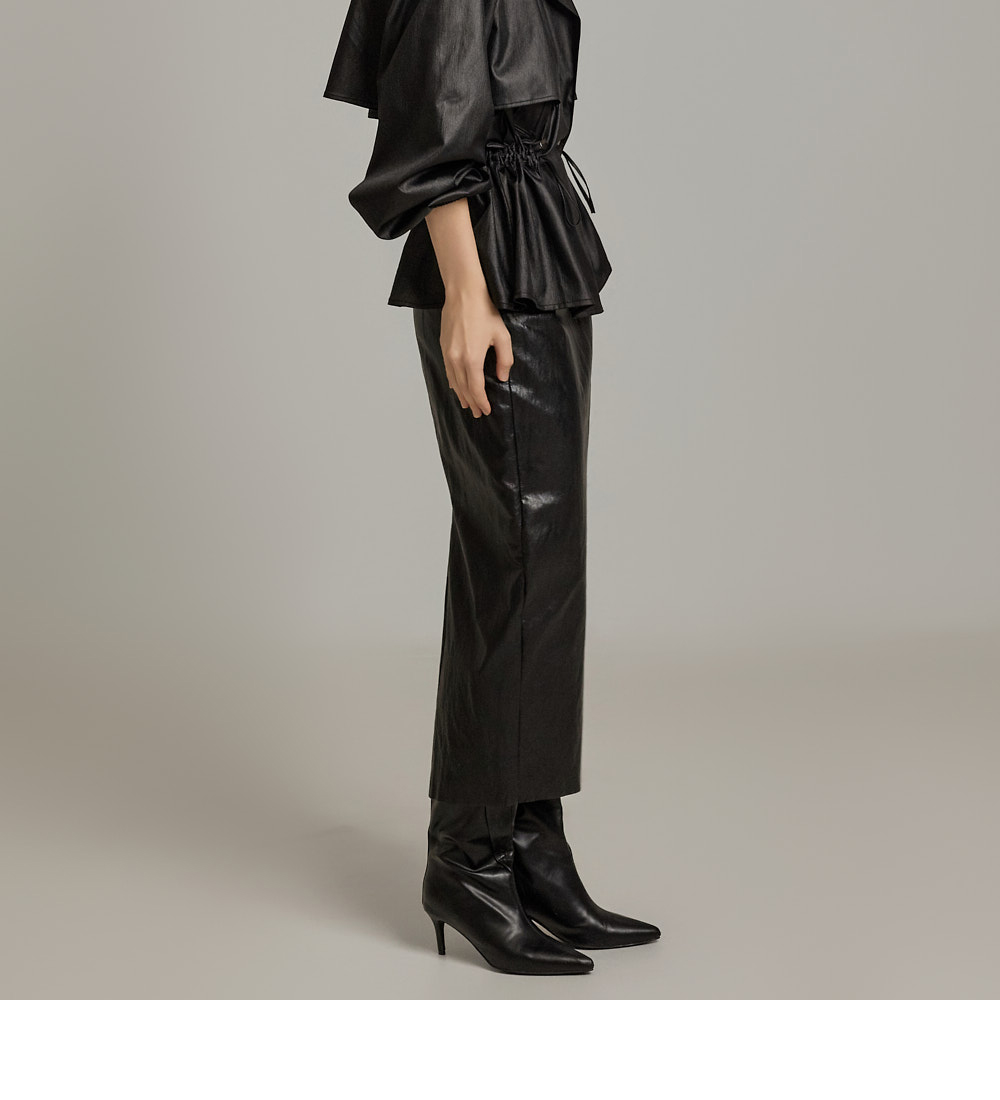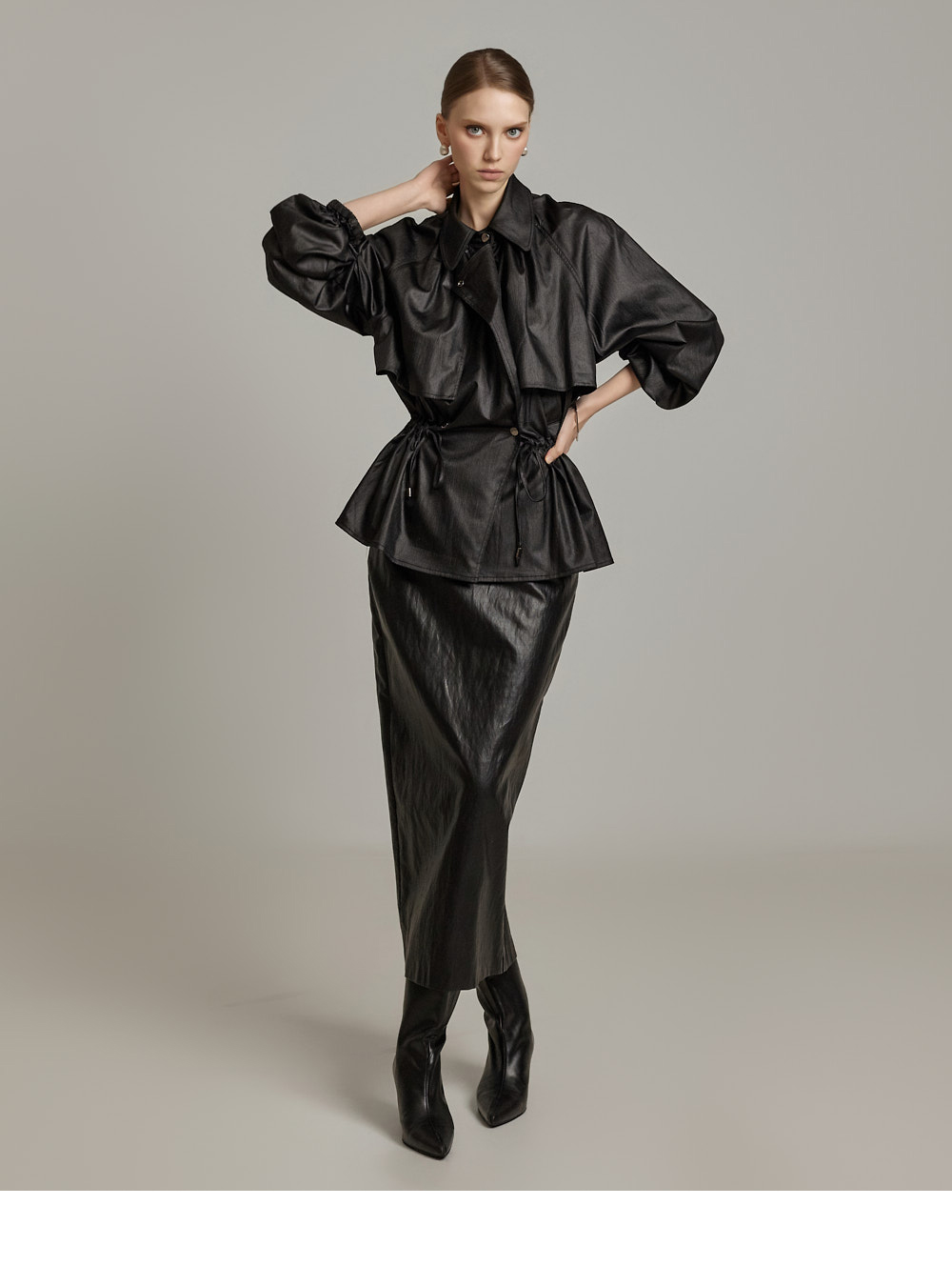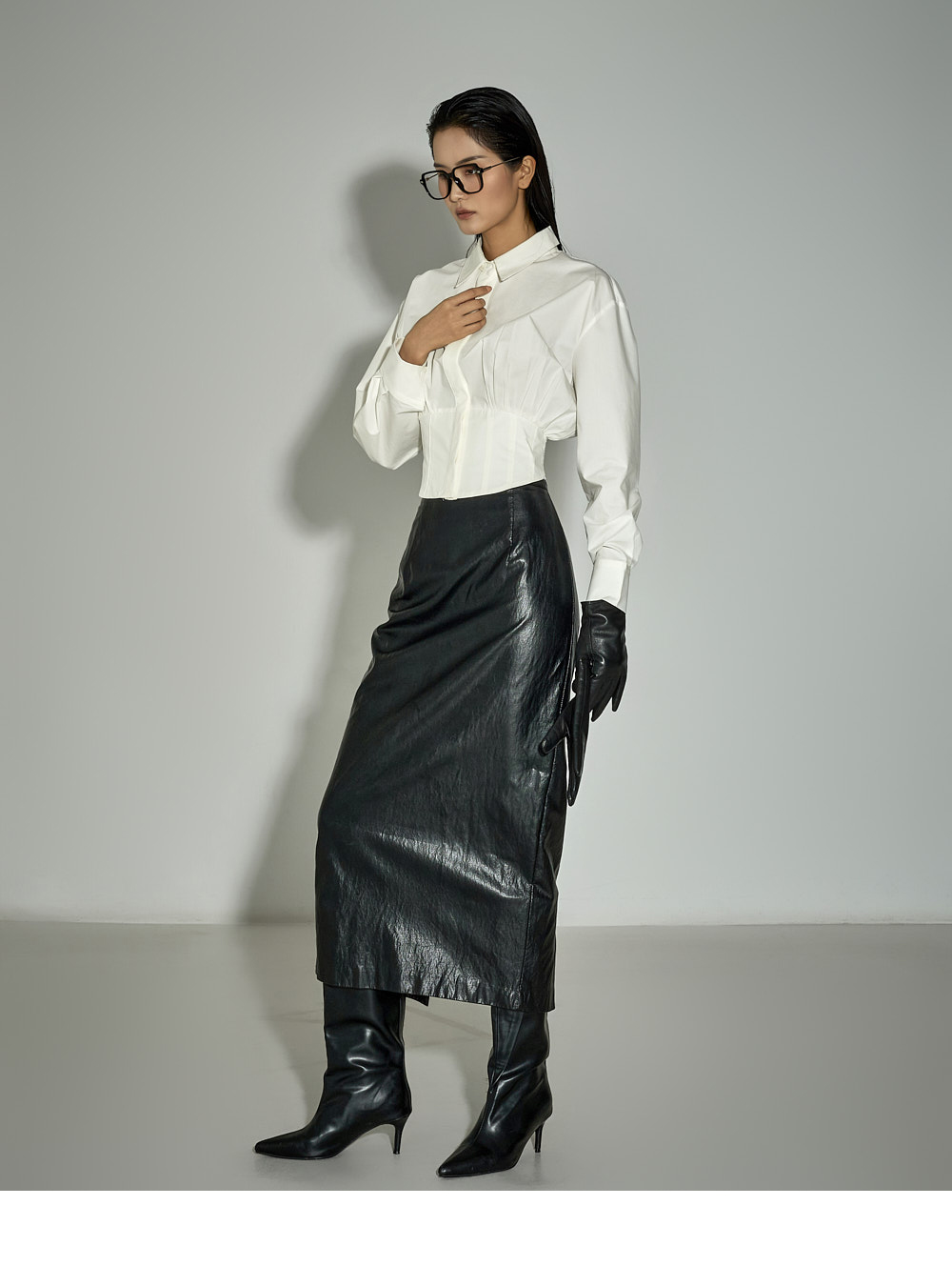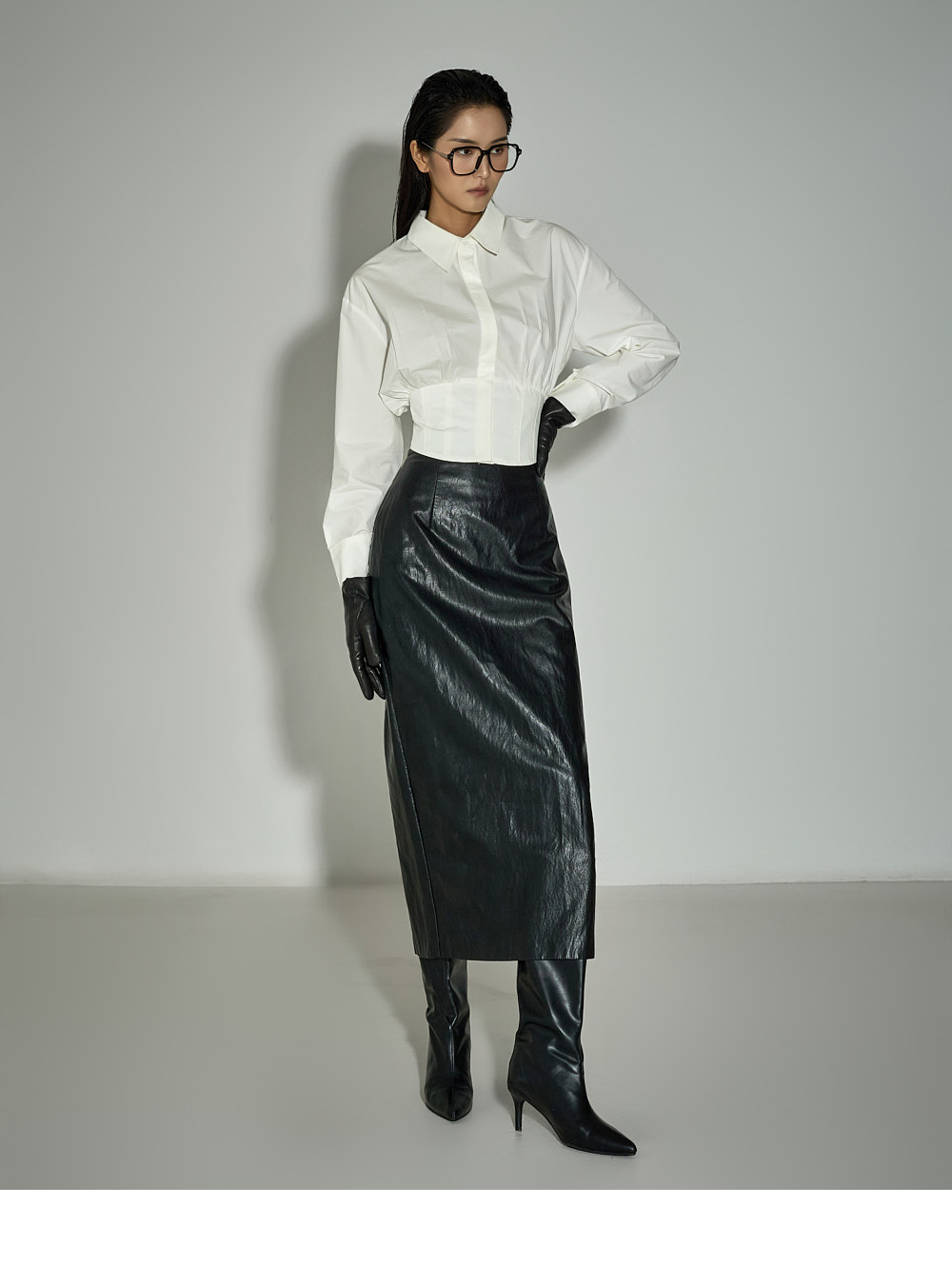 这是一款散发独特气质的皮革半身裙。 采用触感柔软的聚酯纤维面料,并与粘纤、钢丝纱混纺制作,提供S、M两种尺码,可根据体型选择合适款式。 后背拉链设计,方便穿脱,内衬设计带来舒适穿着感。 中长款H型裙型展现女性优雅气质,后背开衩便于活动,全皮革质感与光泽面料让造型精致,即使单穿也足够出彩。 可与多种上衣轻松搭配,简约设计便于造型,推荐给DINT的客户们。 模特身高174CM,穿S码,黑色款。