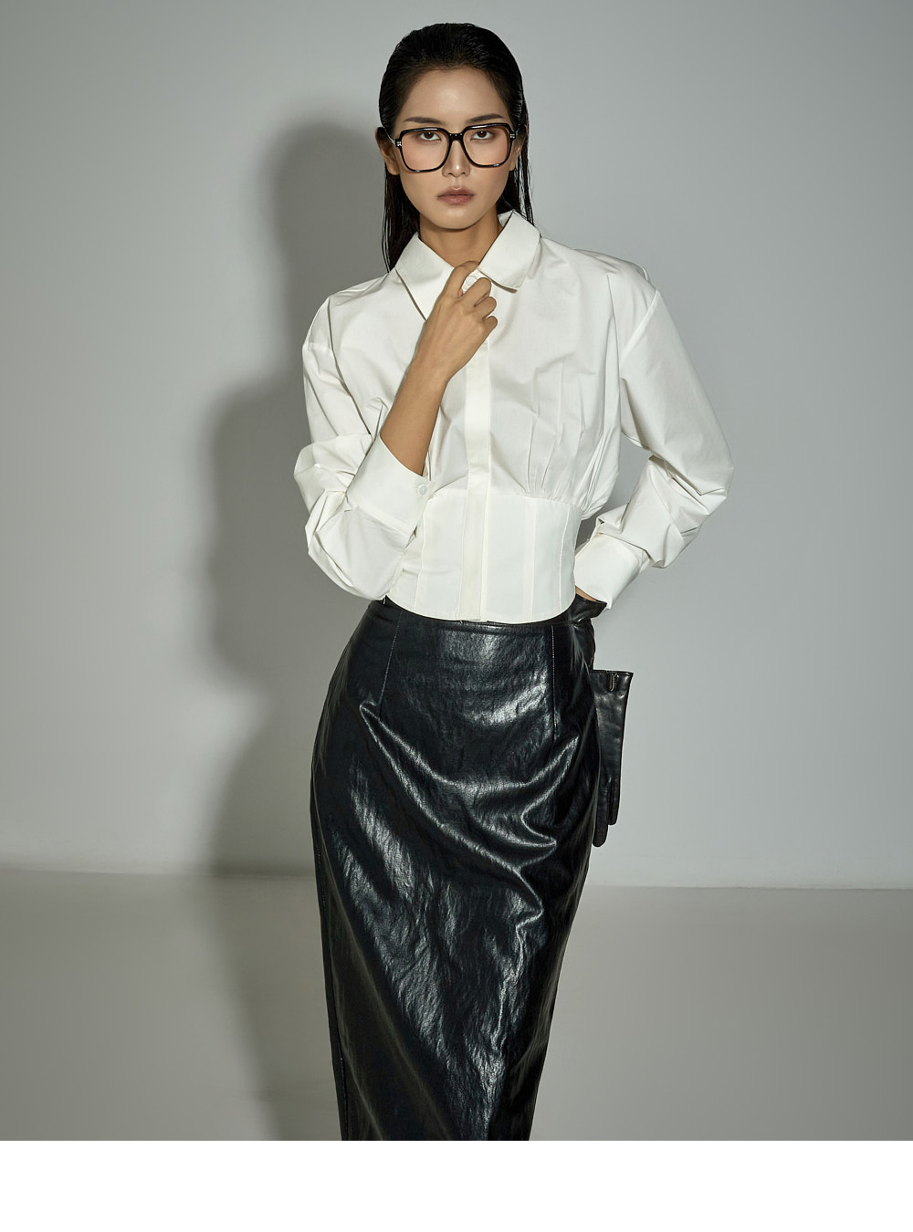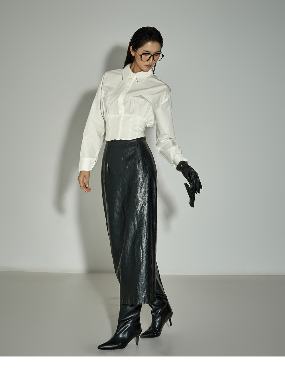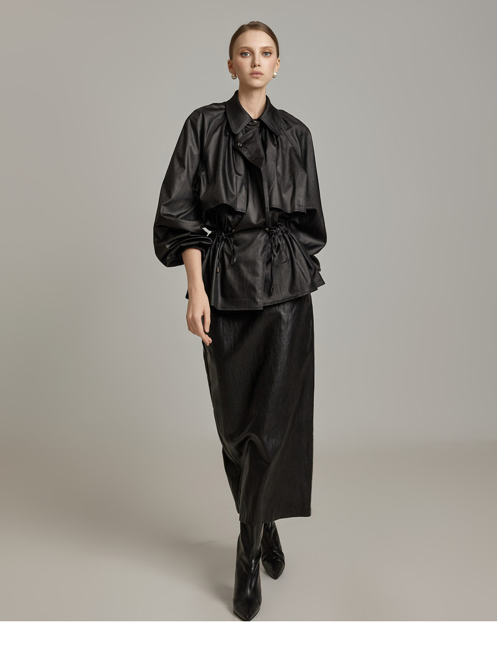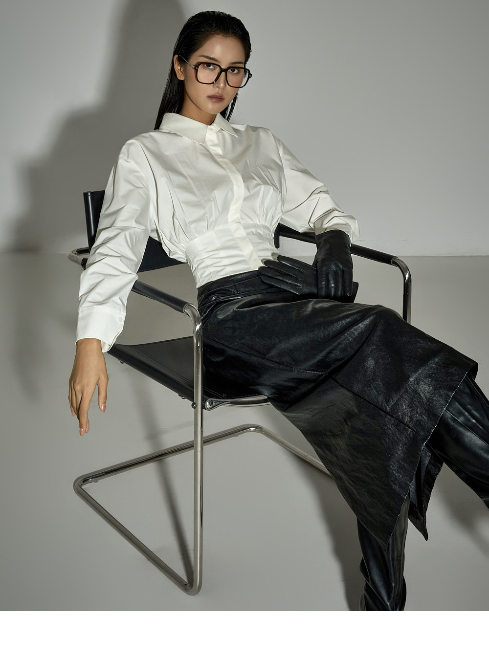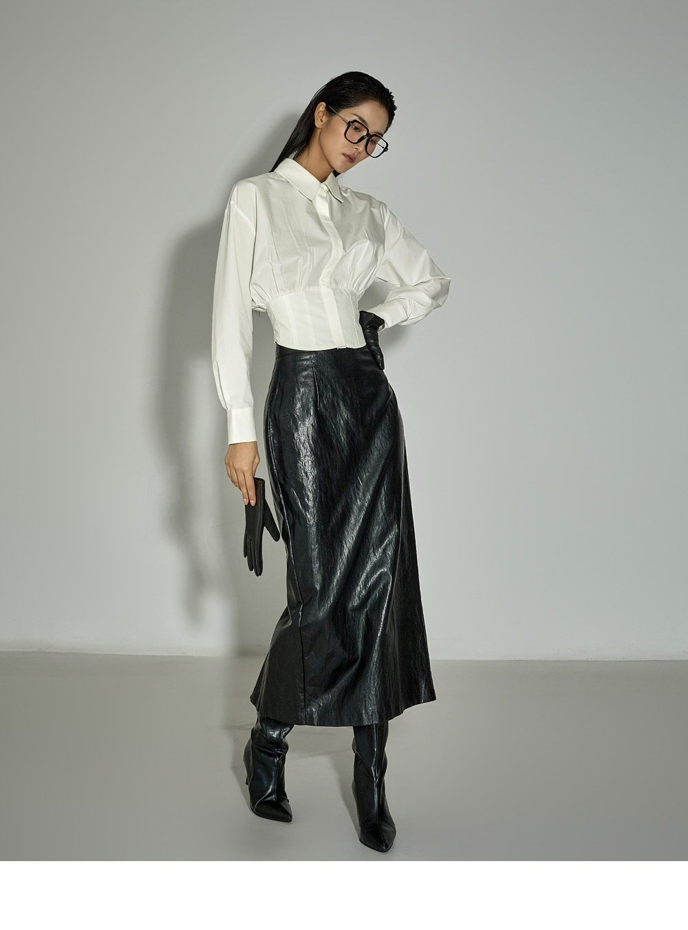 这是一款散发独特气质的皮革半身裙。 采用触感柔软的聚酯纤维面料,并与粘纤、钢丝纱混纺制作,提供S、M两种尺码,可根据体型选择合适款式。 后背拉链设计,方便穿脱,内衬设计带来舒适穿着感。 中长款H型裙型展现女性优雅气质,后背开衩便于活动,全皮革质感与光泽面料让造型精致,即使单穿也足够出彩。 可与多种上衣轻松搭配,简约设计便于造型,推荐给DINT的客户们。 模特身高174CM,穿S码,黑色款。