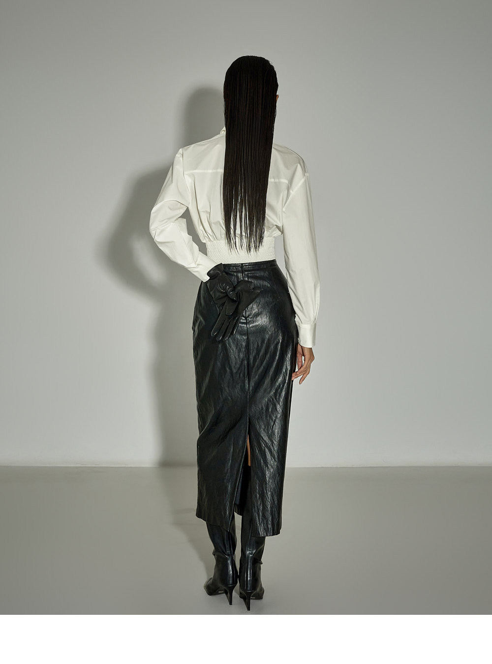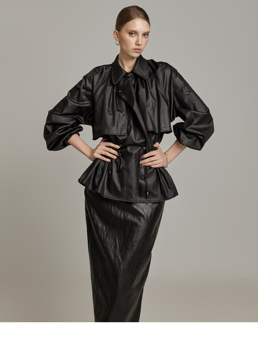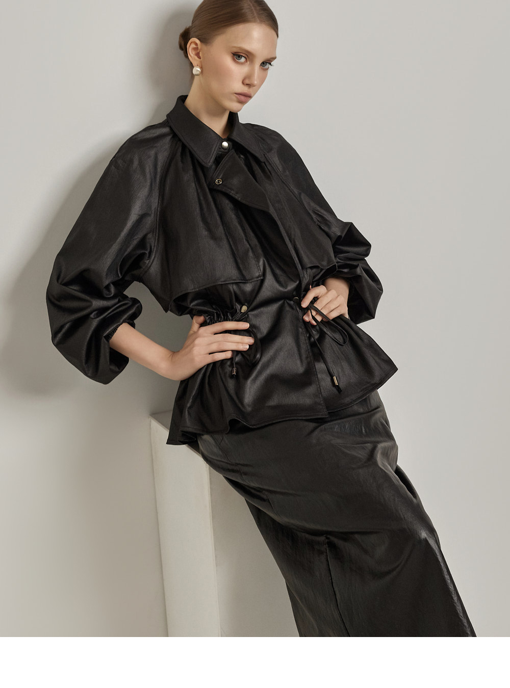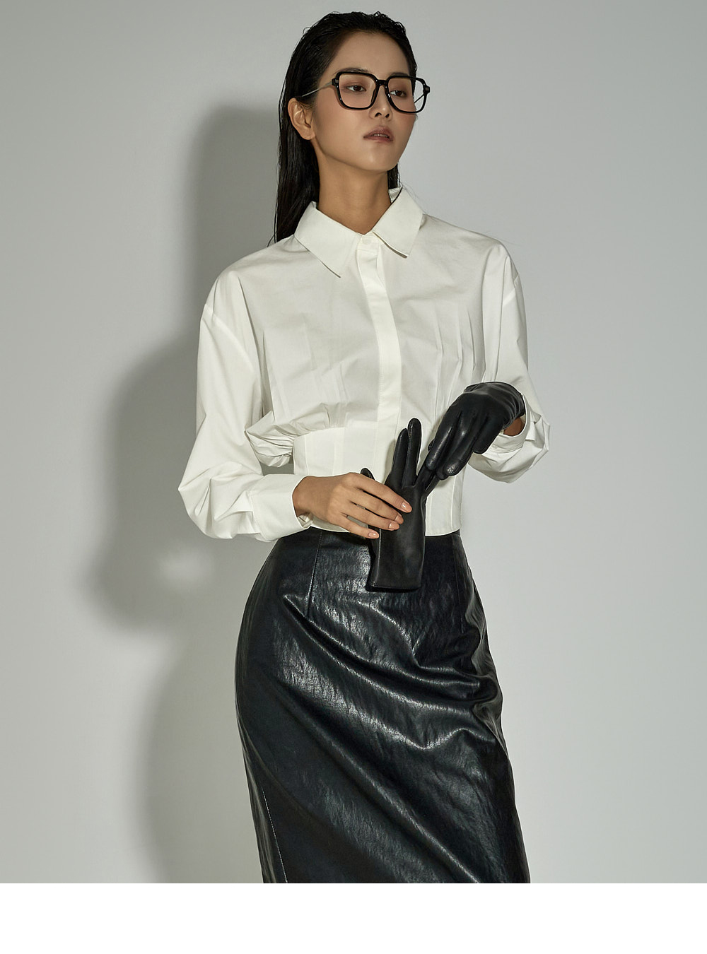 这是一款散发独特气质的皮革半身裙。 采用触感柔软的聚酯纤维面料,并与粘纤、钢丝纱混纺制作,提供S、M两种尺码,可根据体型选择合适款式。 后背拉链设计,方便穿脱,内衬设计带来舒适穿着感。 中长款H型裙型展现女性优雅气质,后背开衩便于活动,全皮革质感与光泽面料让造型精致,即使单穿也足够出彩。 可与多种上衣轻松搭配,简约设计便于造型,推荐给DINT的客户们。 模特身高174CM,穿S码,黑色款。