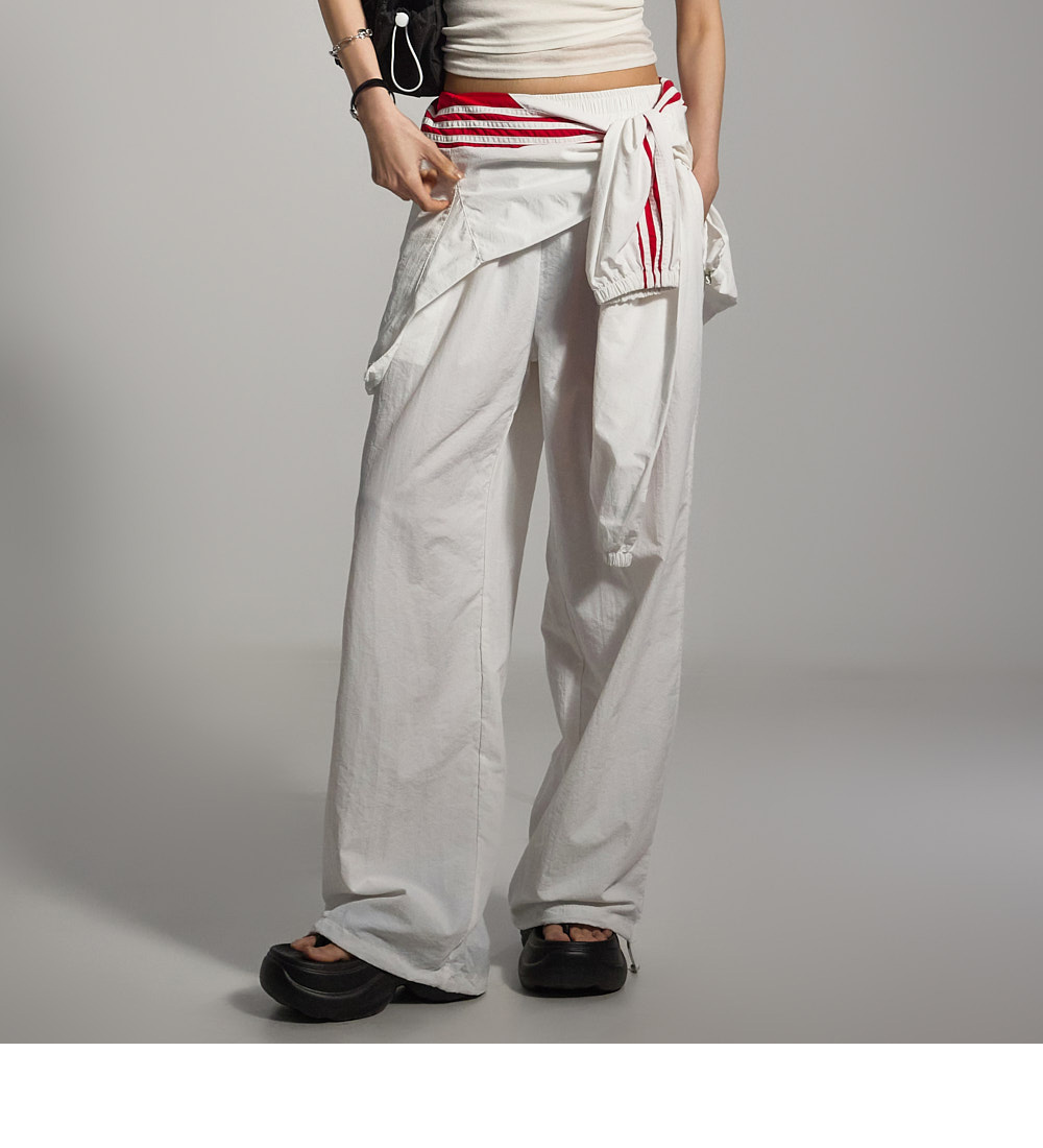腰部配有松紧带,穿着舒适,底部的抽绳细节可调节裤脚的松紧,增加了实用性。