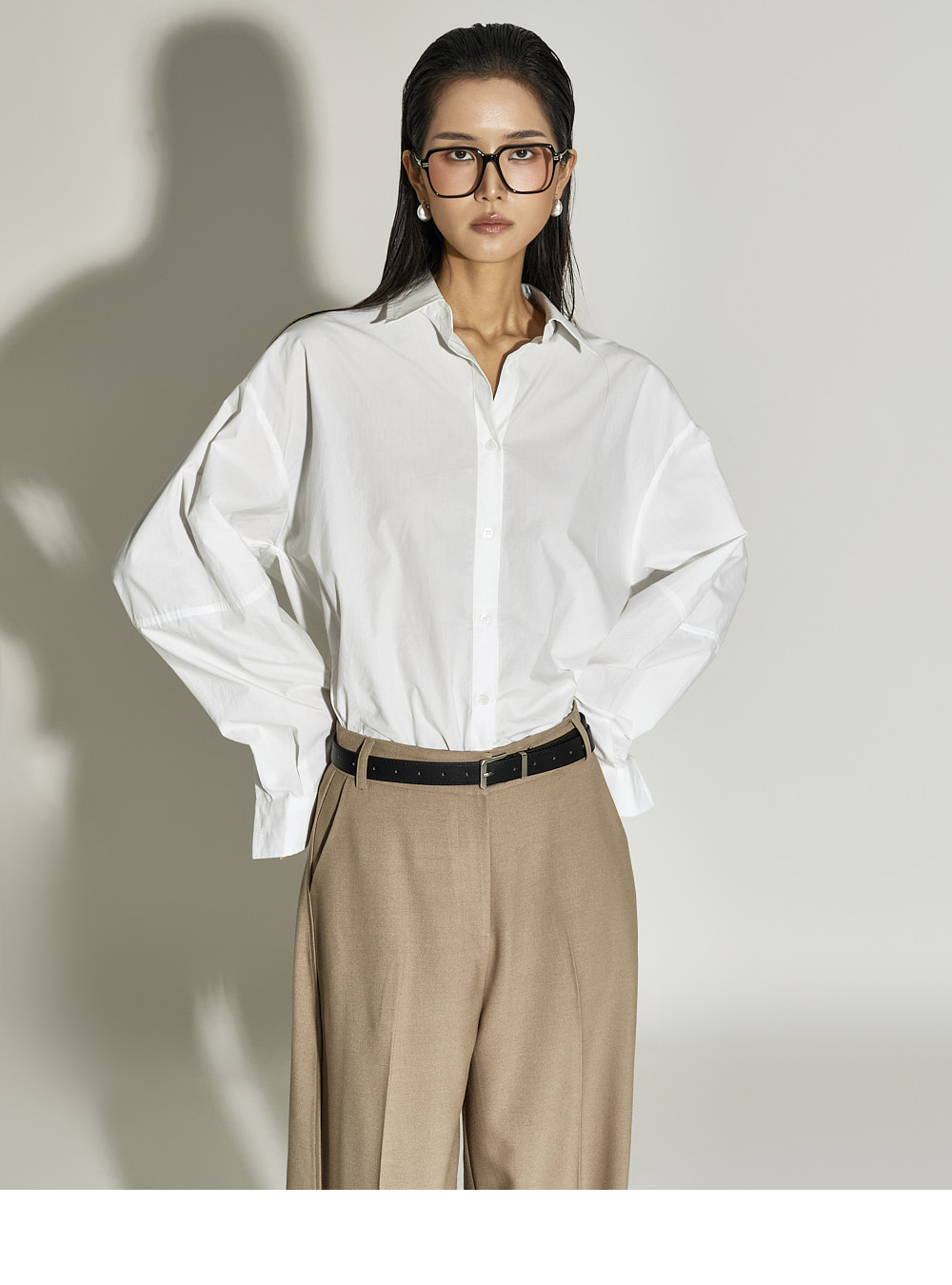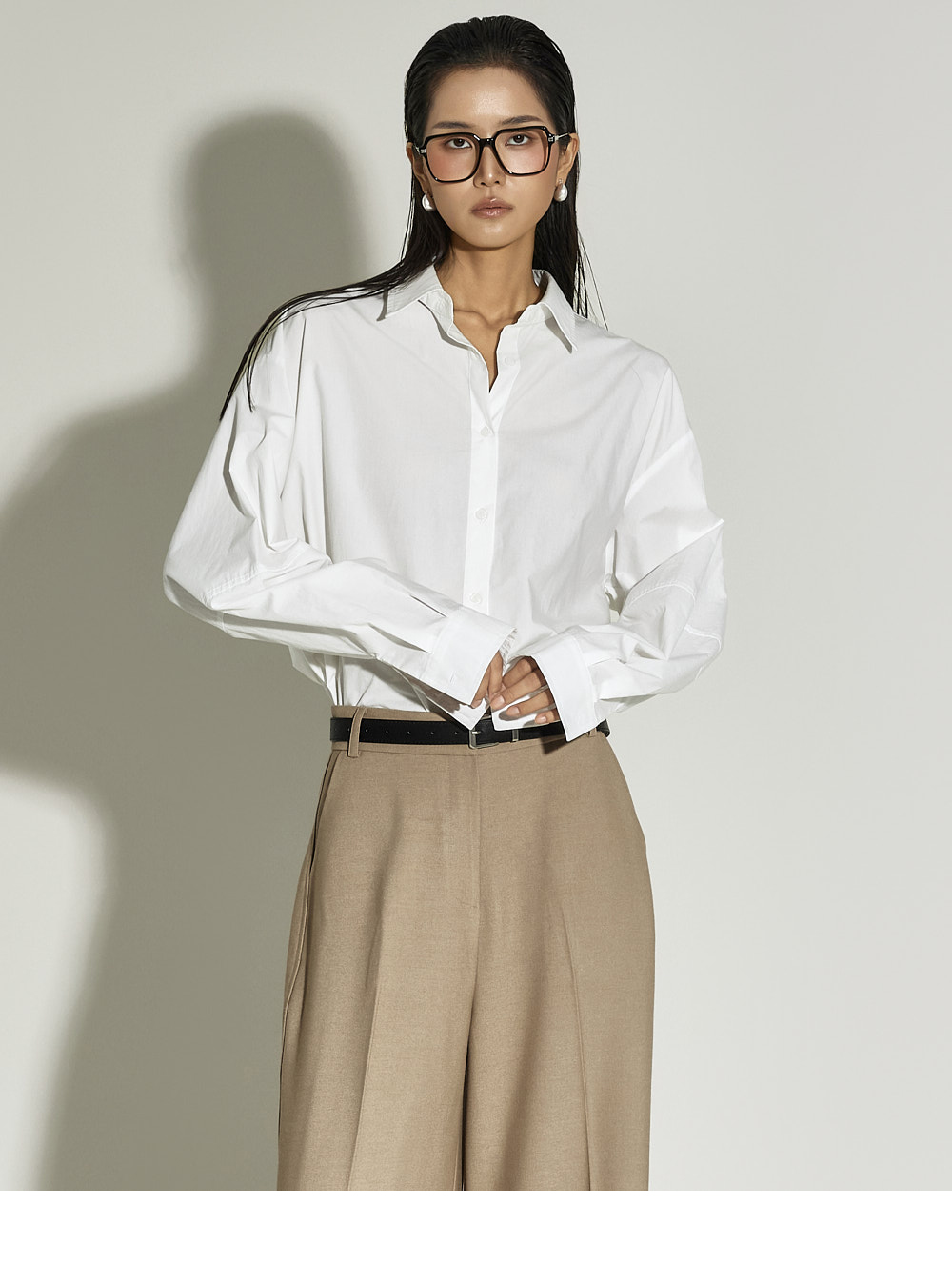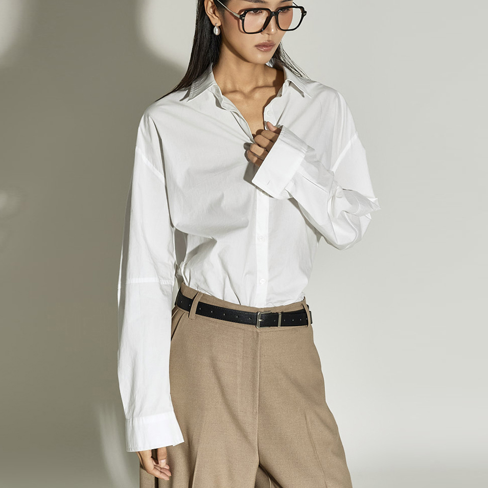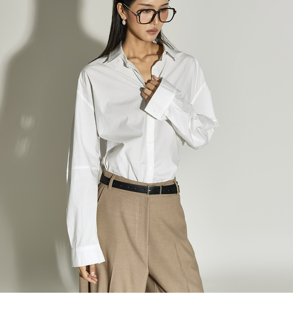 这是一款简约时尚风格的衬衫。 采用棉质面料制作,版型挺括,ONE SIZE设计打造宽松廓形。 宽松版型与不对称下摆增添潮流感与自然造型感,后背的打褶细节成为低调亮点。 前襟纽扣开合方便穿脱,设计简洁基础,易于与多种下装搭配,实用性高。 既适合日常穿搭,也适合想增添时尚感的造型日。 173CM模特身穿ONE尺寸,WHITE色。